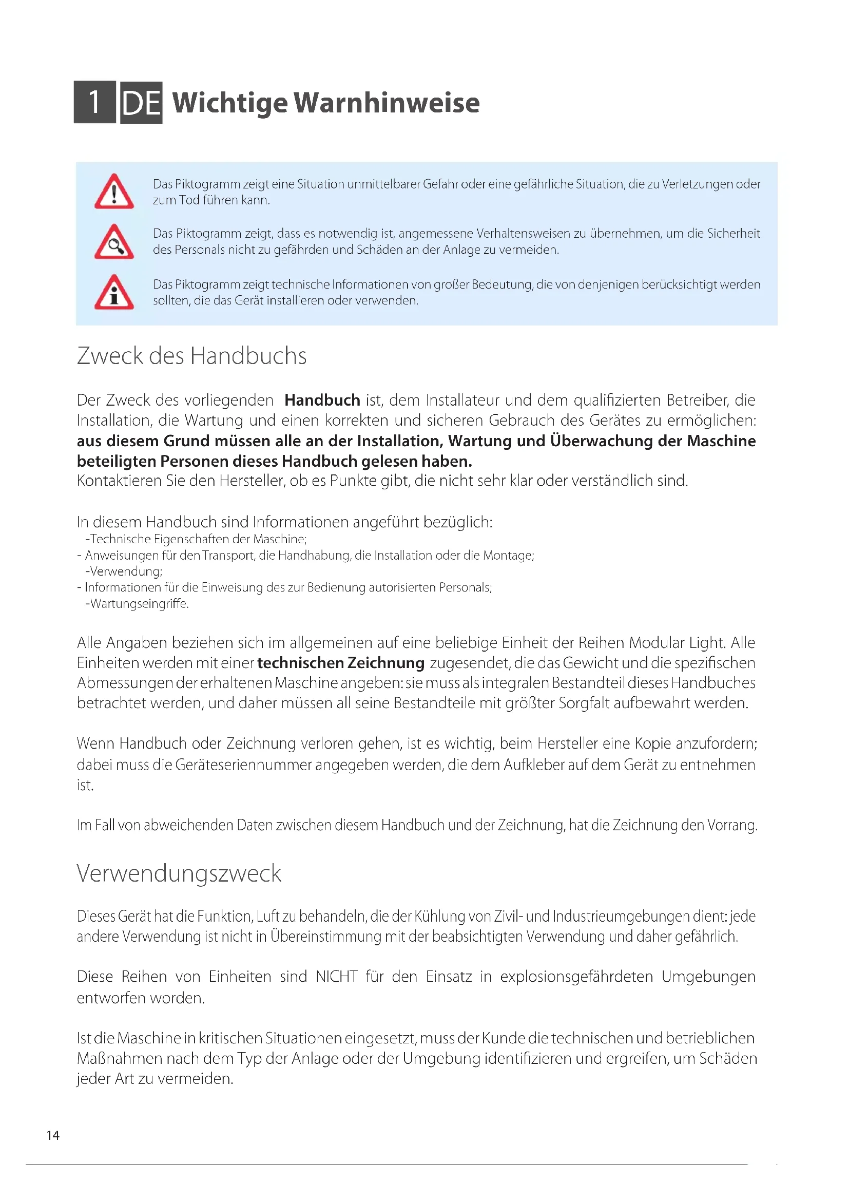 Sicherheitsvorschriften Erforderliche Kompetenzen für die Verwendung und Wartung der Maschine Allgemeiner Betreiber: ist BERECHTIGT, die Maschine mittels Befehle auf dem Bedienfeld der elektrischen Schalttafel zu betätigen. Er führt nur die Steuerungsoperationen der Maschine, Ein/Ausschalten aus (Qualifizierter) Wartungstechniker: ist BERECHTIGT zur Durchführung von Wartung-, Einstellung-, Austausch- und Reparatureingriffen von mechanischen Teilen. Er muss eine sachkundige Person in mechanischen Systemen sein, daher in der Lage sein, die mechanische Wartung in zufriedenstellender Weise durchzuführen und er muss über eine theoretische Ausbildung und manuelle Erfahrung verfügen. Er ist NICHT BERECHTIGT, an elektrischen Anlagen zu arbeiten. (Qualifizierter) Mintagetechniker: ist BERECHTIGT zur Durchführung von komplizierten Operationen in jeder Situation. Er arbeitet in Übereinstimmung mit dem Benutzer. (Qualifizierter) Wartungselektriker: ist BERECHTIGT zur Durchführung von Eingriffen elektrischer Art, von Einstellung, Wartung und elektrischer Reparatur. BERECHTIGT, unter Spannung innerhalb der Bedienfelder und Anschlussdosen zu arbeiten. Er muss eine sachkundige Person in Elektronik und Elektrotechnik sein, daher in der Lage sein, auf elektrische Systeme zufriedenstellend und sicher einzugreifen, er muss über eine theoretische Ausbildung und nachgewiesene Erfahrung verfügen. Er ist NICHT BERECHTIGT, an mechanischen Anlagen zu arbeiten. Erforderliche Kompetenzen für die Installation der Maschine Die Installateure müssen die Operationen entsprechend ihrer beruflichen Qualifikationen ausführen: alle Aktivitäten außerhalb ihrer Kompetenz (z.B. elektrische Anschlüsse) müssen von spezifischen und qualifizierten Operatoren ausgeführt werden, um ihre eigene Sicherheit und die von anderen Betreibern nicht zu gefährden, die mit dem Gerät zusammenwirken. Maschinentransport- und Handhabungsoperator: eine autorisierte Person mit anerkannter Kompetenz im Einsatz von Transportmitteln und Hebetechnik. Technischer Installateur: Technischer Experte, der vom Hersteller oder dessen Bevollmächtigten mit geeigneten technischen Kompetenzen und Ausbildung für die Installation der Maschine gesendet oder autorisiert wird. Assistent: Techniker, der der Sorgfaltspflicht bei der Ausübung der Hebung und der Montage der Ausrüstung unterliegt. Er muss auf die auszuführenden Operationen und die Sicherheitspläne der Baustelle/Aufstellort entsprechend geschult und darüber informiert werden. In diesem Handbuch wird der Techniker für jede Operation spezifiziert, der zu deren Ausführung berechtigt ist. Die Installateure, die Benutzer und die Wartungstechniker des Gerätes müssen auch: - volljährig, verantwortungsvoll und erfahren sein; - ohne körperliche Beeinträchtigungen und in perfekter körperlicher und psychophysischer Verfassung sein; - den Betriebszyklus der Maschine beherrschen; - eine theoretisch-praktische Ausbildung neben einem erfahrenen Bediener am Gerät oder an der Seite eines Technikers des Herstellers absolviert haben. In diesem Handbuch wird der Fachmann für jede Bedienung/Wartung/Servicierung spezifiziert, zu deren Ausführung er berechtigt ist.16 Vor der Installation, der Verwendung und der Wartung der Maschine muss dieses Handbuch sorgfältig gelesen werden. ES muss für jede zukünftige Konsultation durch die verschiedenen Betreiber aufbewahrt werden. Entfernen Sie nicht, zerreißen oder überschreiben keinesfalls Teile dieses Handbuchs. Alle Installations-, Montage-, Netzanschluss- und ordentliche/außerordentliche Wartungsarbeiten dürfen nur von qualiziertem Personal unter Einhaltung der technischen Vorschriften durchgeführt werden. Vor Beginn der Arbeiten muss die Stromversorgung unterbrochen werden und es muss persönliche Schutzausrüstung (z. B. Handschuhe, Schutzbrille usw.) getragen werden, die den geltenden Bestimmungen im Einsatzland entspricht, wobei stets die Regeln bezüglich der Anlagen und Sicherheit am Arbeitsplatz zu beachten sind. Eine Installation, eine Verwendung oder eine Wartung anders als die im Handbuch angegebenen kann zu Schäden, Verletzungen oder zum Tod führen, sie machen die Garantie nichtig und der Hersteller wird von jeglicher Haftung befreit werden. Während der Handhabung oder der Installation des Gerätes ist die Verwendung von Schutzkleidung und zwecksrelevanten Mitteln obligatorisch, um Verletzungen zu vermeiden und die Erhaltung der eigenen Sicherheit und von anderen zu gewährleisten. Während der Montage oder Wartung der Maschine ist der Durchgang oder der Aufenthalt von an der Installation nicht beteiligten Personen in der Nähe des Arbeitsbereichs NICHT erlaubt. Vor der Durchführung von jedem Installation- oder Wartungseingri die elektrische Versorgung des Gerätes trennen. Vor der Installation des Gerätes überprüfen, dass die Anlagen den geltenden Vorschriften im Einsatzland und den Angaben auf dem Typenschild entsprechen. Der Benutzer/Installateur ist verpflichtet, die statische Stabilität und die Dynamik im Zusammenhang mit der Installation sicherzustellen, und die Umgebungen bereitzustellen, damit die nicht kompetenten und nicht autorisierten Personen KEINEN Zugang zu der Maschine oder deren Befehle haben. Der Benutzer/Installateur ist verpflichtet, sicherzustellen, dass die Wetterbedingungen die Sicherheit von Personen und Eigentum während der Installation-, Verwendung- und Wartungsphasen nicht beschädigen. Sicherstellen, dass die Luftabsaugung nicht in der Nähe von Abflüssen, Verbrennungsrauch oder anderen Schadstoffen erfolgt. Das Gerät an Orten, die starkem Winden, Salz, offenen Flammen oder Temperaturen oberhalb von 40°C (104°F) ausgesetzt sind, NICHT installieren. Nach Abschluss der Installation den Benutzer auf die korrekte Verwendung der Maschine anweisen. Wenn das Gerät nicht funktioniert oder Sie funktionale oder strukturelle Veränderungen bemerken, trennen Sie es von der Stromversorgung und nehme