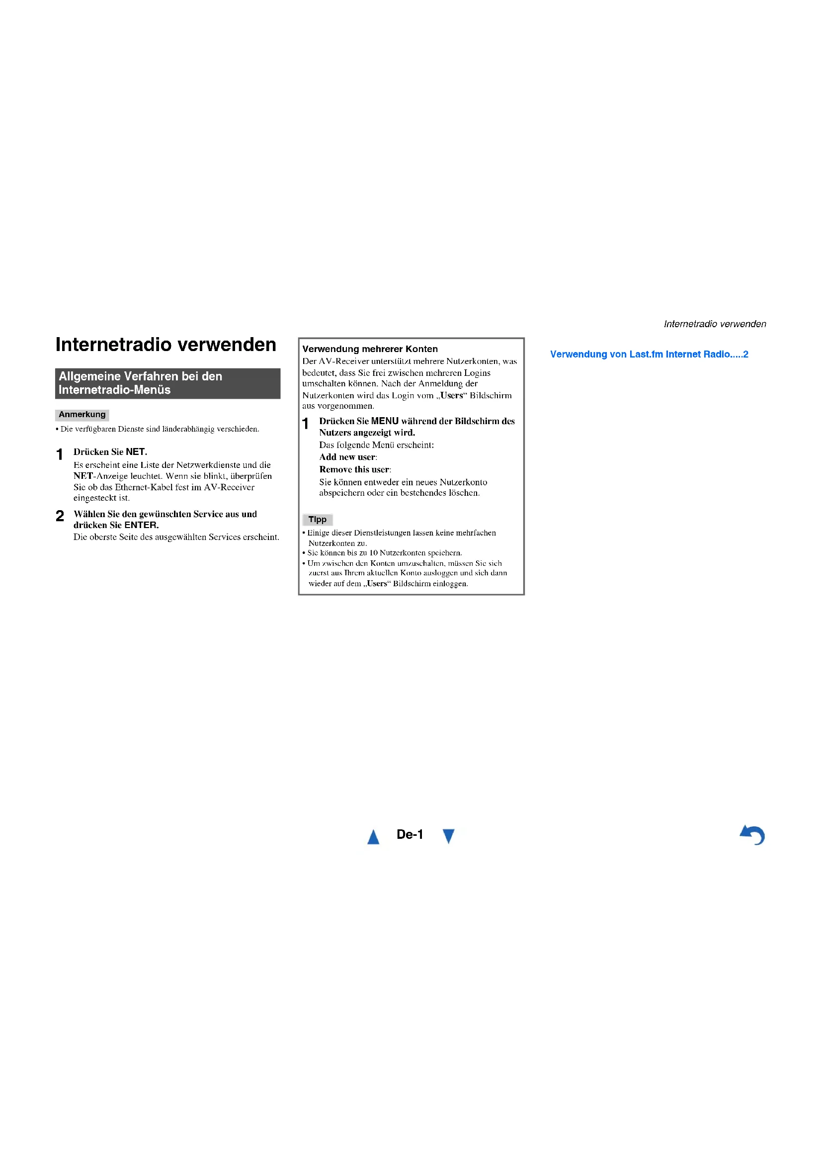 Wählen Sie den gewünschten Service aus und drücken Sie ENTER. Die oberste Seite des ausgewählten Services erscheint. Verwendung mehrerer Konten Der AV-Receiver unterstützt mehrere Nutzerkonten, was bedeutet, dass Sie frei zwischen mehreren Logins umschalten können. Nach der Anmeldung der Nutzerkonten wird das Login vom „Users“ Bildschirm aus vorgenommen. Tipp