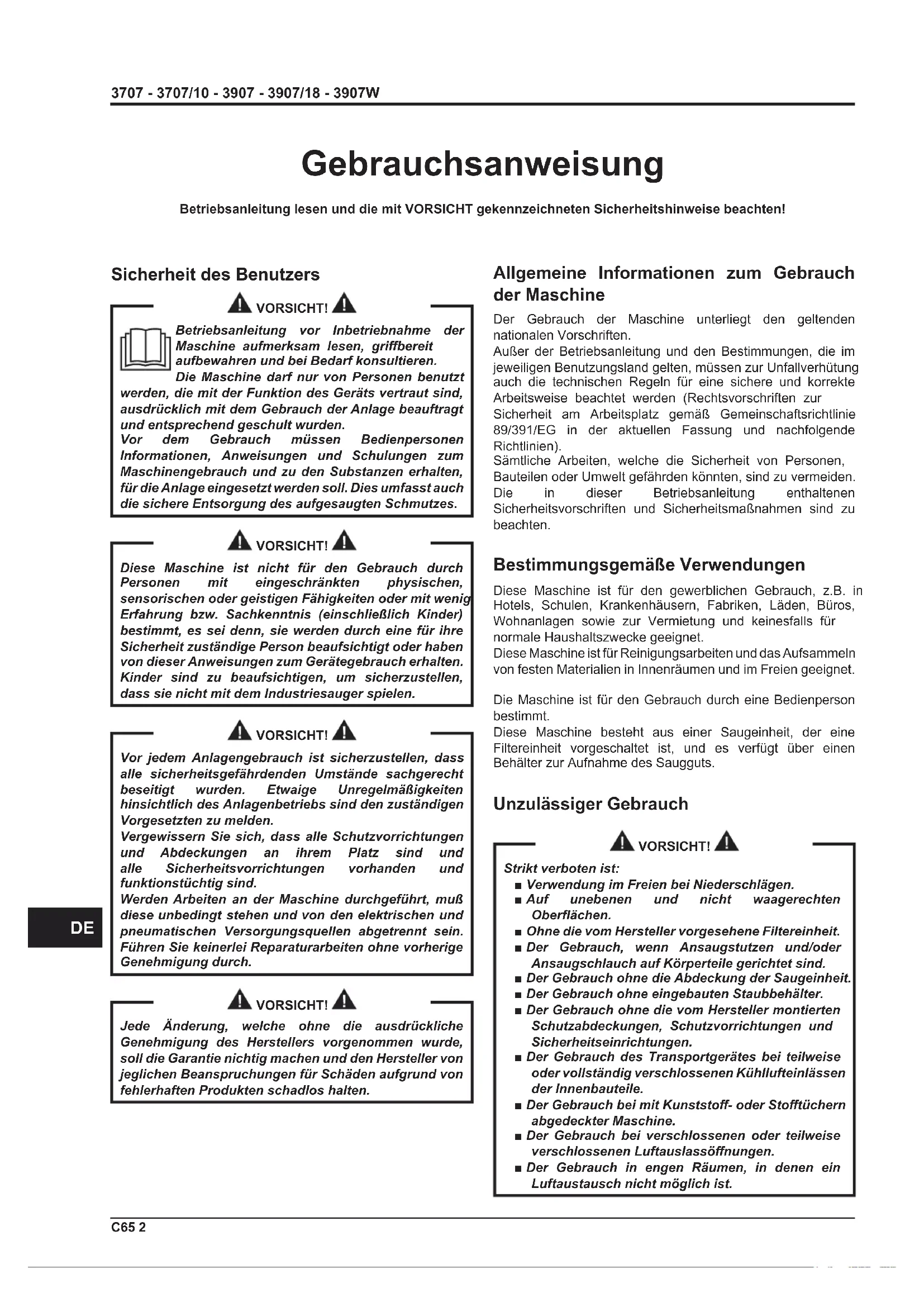 Gebrauchsanweisung Allgemeine Informationen zum Gebrauch der Maschine Der Gebrauch der Maschine unterliegt den geltenden nationalen Vorschriften. Außer der Betriebsanleitung und den Bestimmungen, die im jeweiligen Benutzungsland gelten, müssen zur Unfallverhütung auch die technischen Regeln für eine sichere und korrekte Arbeitsweise beachtet werden (Rechtsvorschriften zur Sicherheit am Arbeitsplatz gemäß Gemeinschaftsrichtlinie 89/391/EG in der aktuellen Fassung und nachfolgende Richtlinien). Sämtliche Arbeiten, welche die Sicherheit von Personen, Bauteilen oder Umwelt gefährden könnten, sind zu vermeiden. Die in dieser Betriebsanleitung enthaltenen Sicherheitsvorschriften und Sicherheitsmaßnahmen sind zu beachten. Bestimmungsgemäße Verwendungen Diese Maschine ist für den gewerblichen Gebrauch, z.B. in Hotels, Schulen, Krankenhäusern, Fabriken, Läden, Büros, Wohnanlagen sowie zur Vermietung und keinesfalls für normale Haushaltszwecke geeignet. Diese Maschine ist für Reinigungsarbeiten und das Aufsammeln von festen Materialien in Innenräumen und im Freien geeignet. Die Maschine ist für den Gebrauch durch eine Bedienperson bestimmt. Diese Maschine besteht aus einer Saugeinheit, der eine Filtereinheit vorgeschaltet ist, und es verfügt über einen Behälter zur Aufnahme des Saugguts. Unzulässiger Gebrauch VORSICHT! Strikt verboten ist: ■ Verwendung im Freien bei Niederschlägen. ■ Auf unebenen und nicht waagerechten Oberächen. ■ Ohne die vom Hersteller vorgesehene Filtereinheit. ■ Der Gebrauch, wenn Ansaugstutzen und/oder Ansaugschlauch auf Körperteile gerichtet sind. ■ Der Gebrauch ohne die Abdeckung der Saugeinheit. ■ Der Gebrauch ohne eingebauten Staubbehälter. ■ Der Gebrauch ohne die vom Hersteller montierten Schutzabdeckungen, Schutzvorrichtungen und Sicherheitseinrichtungen. ■ Der Gebrauch des Transportgerätes bei teilweise oder vollständig verschlossenen Kühllufteinlässen der Innenbauteile. ■ Der Gebrauch bei mit Kunststo- oder Stotüchern abgedeckter Maschine. ■ Der Gebrauch bei verschlossenen oder teilweise verschlossenen Luftauslassönungen. ■ Der Gebrauch in engen Räumen, in denen ein Luftaustausch nicht möglich ist. Betriebsanleitung lesen und die mit VORSICHT gekennzeichneten Sicherheitshinweise beachten! Sicherheit des Benutzers VORSICHT! Betriebsanleitung vor Inbetriebnahme der Maschine aufmerksam lesen, gribereit aufbewahren und bei Bedarf konsultieren. Die Maschine darf nur von Personen benutzt werden, die mit der Funktion des Geräts vertraut sind, ausdrücklich mit dem Gebrauch der Anlage beauftragt und entsprechend geschult wurden. Vor dem Gebrauch müssen Bedienpersonen Informationen, Anweisungen und Schulungen zum Maschinengebrauch und zu den Substanzen erhalten, für die Anlage eingesetzt werden soll. Dies umfasst auch die sichere Entsorgung des aufgesaugten Schmutzes. VORSICHT! Diese Maschine ist nicht für den Gebrauch durch Personen mit eingeschränkten physischen, sensorischen oder geistigen Fähigkeiten oder mit wenig Erfahrung bzw. Sachkenntnis (einschließlich Kinder) bestimmt, es sei denn, sie werden durch eine für ihre Sicherheit zuständige Person beaufsichtigt oder haben von dieser Anweisungen zum Gerätegebrauch erhalten. Kinder sind zu beaufsichtigen, um sicherzustellen, dass sie nicht mit dem Industriesauger spielen. VORSICHT! Vor jedem Anlagengebrauch ist sicherzustellen, dass alle sicherheitsgefährdenden Umstände sachgerecht beseitigt wurden. Etwaige Unregelmäßigkeiten hinsichtlich des Anlagenbetriebs sind den zuständigen Vorgesetzten zu melden. Vergewissern Sie sich, dass alle Schutzvorrichtungen und Abdeckungen an ihrem Platz sind und alle Sicherheitsvorrichtungen vorhanden und funktionstüchtig sind. Werden Arbeiten an der Maschine durchgeführt, muß diese unbedingt stehen und von den elektrischen und pneumatischen Versorgungsquellen abgetrennt sein. Führen Sie keinerlei Reparaturarbeiten ohne vorherige Genehmigung durch. VORSICHT! Jede Änderung, welche ohne die ausdrückliche Genehmigung des Herstellers vorgenommen wurde, soll die Garantie nichtig machen und den Hersteller von jeglichen Beanspruchungen für Schäden aufgrund von fehlerhaften Produkten schadlos halten.3707 - 3707/10 - 3907 - 3907/18 - 3907W 3 C65
