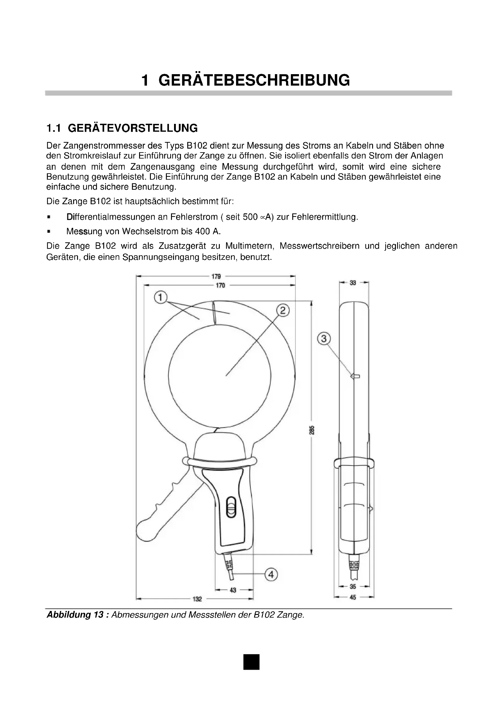 Messung von Wechselstrom bis 400 A. Die Zange B102 wird als Zusatzgerät zu Multimetern, Messwertschreibern und jeglichen anderen Geräten, die einen Spannungseingang besitzen, benutzt. Abbildung 13 : Abmessungen und Messstellen der B102 Zange.27