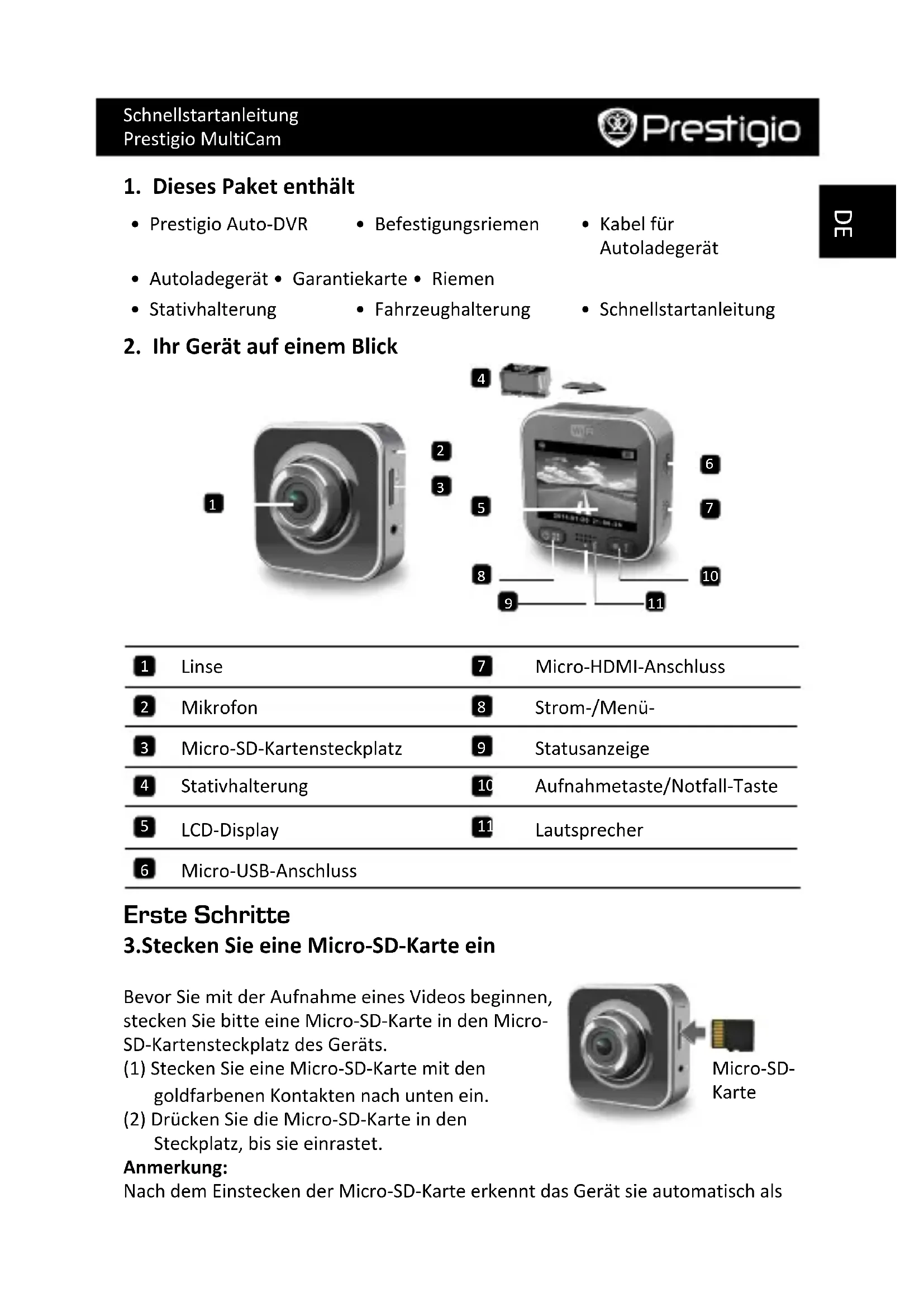 Micro-USB-Anschluss Erste Schritte 3.Stecken Sie eine Micro-SD-Karte ein Micro-SD- Karte Bevor Sie mit der Aufnahme eines Videos beginnen, stecken Sie bitte eine Micro-SD-Karte in den Micro- SD-Kartensteckplatz des Geräts. (1) Stecken Sie eine Micro-SD-Karte mit den goldfarbenen Kontakten nach unten ein. (2) Drücken Sie die Micro-SD-Karte in den Steckplatz, bis sie einrastet. Anmerkung: Nach dem Einstecken der Micro-SD-Karte erkennt das Gerät sie automatisch alsSchnellstartanleitung Prestigio MultiCam