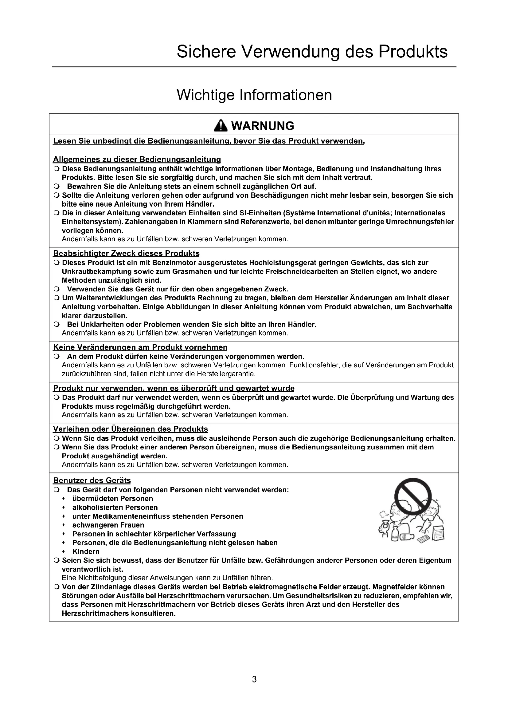 - Konformitätserklärung Sichere Verwendung des Produkts Sichere Verwendung des Produkts Wichtige Informationen WARNUNG Lesen Sie unbedingt die Bedienungsanleitung, bevor Sie das Produkt verwenden. Allgemeines zu dieser Bedienungsanleitung Diese Bedienungsanleitung enthält wichtige Informationen über Montage, Bedienung und Instandhaltung Ihres Produkts. Bitte lesen Sie sie sorgfältig durch, und machen Sie sich mit dem Inhalt vertraut. Bewahren Sie die Anleitung stets an einem schnell zugänglichen Ort auf. Sollte die Anleitung verloren gehen oder aufgrund von Beschädigungen nicht mehr lesbar sein, besorgen Sie sich bitte eine neue Anleitung von Ihrem Händler. Die in dieser Anleitung verwendeten Einheiten sind SI-Einheiten (Système International d'unités; Internationales Einheitensystem). Zahlenangaben in Klammern sind Referenzwerte, bei denen mitunter geringe Umrechnungsfehler vorliegen können.Andernfalls kann es zu Unfällen bzw. schweren Verletzungen kommen. Beabsichtigter Zweck dieses Produkts Dieses Produkt ist ein mit Benzinmotor ausgerüstetes Hochleistungsgerät geringen Gewichts, das sich zur Unkrautbekämpfung sowie zum Grasmähen und für leichte Freischneidearbeiten an Stellen eignet, wo andere Methoden unzulänglich sind. Verwenden Sie das Gerät nur für den oben angegebenen Zweck. Um Weiterentwicklungen des Produkts Rechnung zu tragen, bleiben dem Hersteller Änderungen am Inhalt dieser Anleitung vorbehalten. Einige Abbildungen in dieser Anleitung können vom Produkt abweichen, um Sachverhalte klarer darzustellen. Bei Unklarheiten oder Problemen wenden Sie sich bitte an Ihren Händler.Andernfalls kann es zu Unfällen bzw. schweren Verletzungen kommen. Keine Veränderungen am Produkt vornehmen An dem Produkt dürfen keine Veränderungen vorgenommen werden. Andernfalls kann es zu Unfällen bzw. schweren Verletzungen kommen. Funktionsfehler, die auf Veränderungen am Produkt zurückzuführen sind, fallen nicht unter die Herstellergarantie. Produkt nur verwenden, wenn es überprüft und gewartet wurde Das Produkt darf nur verwendet werden, wenn es überprüft und gewartet wurde. Die Überprüfung und Wartung des Produkts muss regelmäßig durchgeführt werden.Andernfalls kann es zu Unfällen bzw. schweren Verletzungen kommen. Verleihen oder Übereignen des Produkts Wenn Sie das Produkt verleihen, muss die ausleihende Person auch die zugehörige Bedienungsanleitung erhalten. Wenn Sie das Produkt einer anderen Person übereignen, muss die Bedienungsanleitung zusammen mit dem Produkt ausgehändigt werden.Andernfalls kann es zu Unfällen bzw. schweren Verletzungen kommen. Benutzer des Geräts Das Gerät darf von folgenden Personen nicht verwendet werden: übermüdeten Personen alkoholisierten Personen unter Medikamenteneinfluss stehenden Personen schwangeren Frauen Personen in schlechter körperlicher Verfassung Personen, die die Bedienungsanleitung nicht gelesen haben Kindern Seien Sie sich bewusst, dass der Benutzer für Unfälle bzw. Gefährdungen anderer Personen oder deren Eigentum verantwortlich ist.Eine Nichtbefolgung dieser Anweisungen kann zu Unfällen führen. Von der Zündanlage dieses Geräts werden bei Betrieb elektromagnetische Felder erzeugt. Magnetfelder können Störungen oder Ausfälle bei Herzschrittmachern verursachen. Um Gesundheitsrisiken zu reduzieren, empfehlen wir, dass Personen mit Herzschrittmachern vor Betrieb dieses Geräts ihren Arzt und den Hersteller des Herzschrittmachers konsultieren.4 Sichere Verwendung des Produkts Vibration und Kälte Es wird vermutet, dass das Raynaud-Syndrom, das die Finger mancher Menschen befällt, durch stark vibrierende Arbeitsgeräte und Arbeiten bei Kälte herbeigeführt wird. Durch stark vibrierende Arbeitsgeräte und dem Arbeiten bei Kälte kann sich ein Prickeln und Brennen bemerkbar machen, dem sich Farblosigkeit und Gefühllosigkeit der Finger anschließen. Die nachstehend aufgeführten Vorsichtsmaßnahmen werden dringend empfohlen, da die Mindestwerte, bei denen diese Krankheit ausgelöst wird, nicht bekannt sind. Halten Sie Ihren Körper warm, insbesondere Kopf und Nacken, Füße und Fußgelenke sowie Hände und Handgelenke. Legen Sie häufige Pausen ein, in deren Verlauf Sie den Kreislauf durch intensive Armübungen anregen, und rauchen Sie nicht. Begrenzen Sie die Dauerbetriebszeiten auf ein Minimum. Teilen Sie jeden Arbeitstag so ein, dass auch Arbeiten ohne Trimmer oder tragbare motorisierte Geräte verrichtet werden. Wenn Ihre Finger schmerzen, rot und angeschwollen sind und schließlich bleich und gefühllos werden, müssen Sie einen Arzt aufsuchen, bevor Sie sich weiterhin Kälte und Vibrationen aussetzen. Eine Nichtbefolgung dieser Anweisung kann zu gesundheitlichen Schäden führen. RSI-Syndrom Es wird angenommen, dass eine Überanstrengung der Muskeln und Sehnen der Finger, Hände, Arme und Schultern in den betreffenden Körperteilen Schmerz, Schwellungen, Gefühllosigkeit, Schwäche und auch akuten Schmerz verursachen kann. Durch bestimmte ständig wiederholte Handbewegungen steigt das Risiko für die Entwicklung eines RSI-Syndroms. Auf folgende Art mindern Sie das Risiko des RSI-Syndroms: Achten Sie darauf, dass Sie Ihr Handgelenk nicht zu sehr beugen, strecken oder verdrehen. Legen Sie von Zeit zu Zeit Pausen ein, um wiederholte Bewegungen zu minimieren, und lassen Sie Ihre Hände ruhen. Reduzieren Sie die Geschwindigkeit und den Kraftaufwand, mit denen Sie die Wiederholungsbewegung ausführen. Führen Sie geeignete Übungen zur Stärkung der Hand- und Armmuskulatur durch. Suchen Sie einen Arzt auf, wenn Sie ein Prickeln, Gefühllosigkeit oder Schmerzen in Ihren Fingern, Händen, Handgelenken oder Armen bemerken. Je früher das RSI-Syndrom erkannt wird, desto eher lässt sich eine dauerhafte Schädigung von Nerven und Muskeln verhindern. Eine Nichtbefolgung dieser Anweisung kann zu gesundheitlichen Schäden führen. Angemessene Unterweisung Das Gerät darf nicht ohne angemessene Unterweisung 