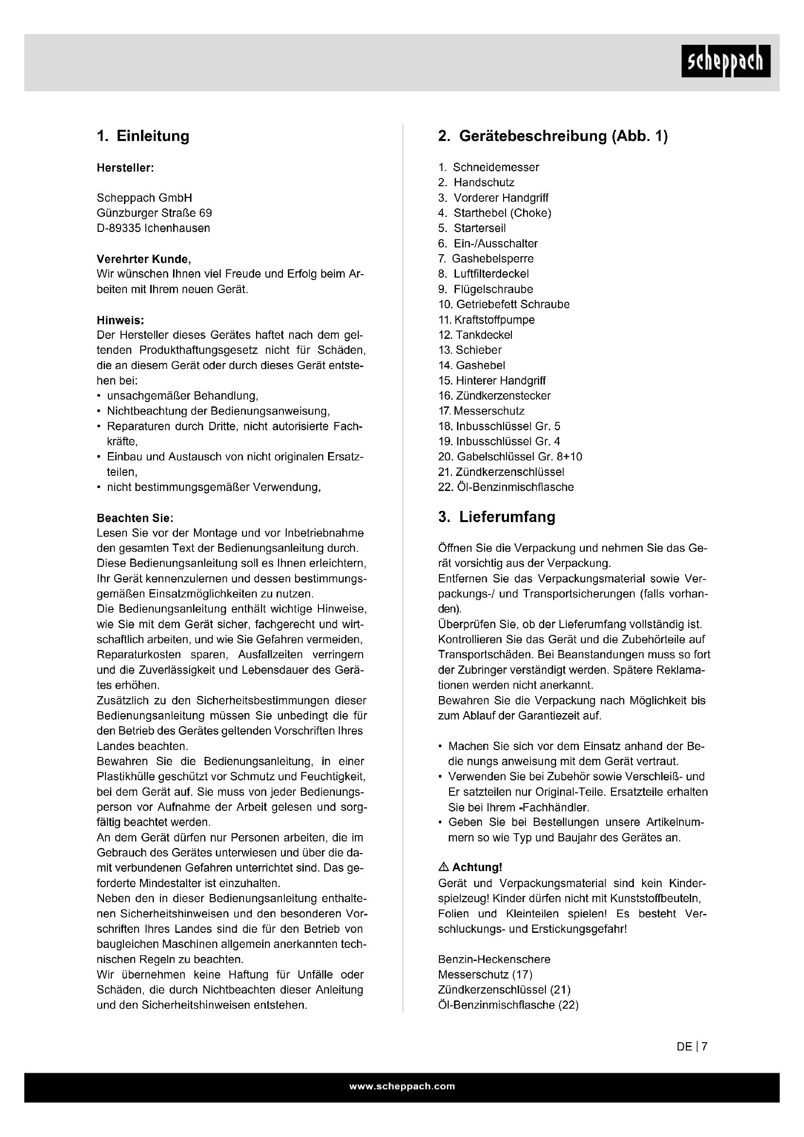 - nicht bestimmungsgemäßer Verwendung, Beachten Sie: Lesen Sie vor der Montage und vor Inbetriebnahme den gesamten Text der Bedienungsanleitung durch. Diese Bedienungsanleitung soll es Ihnen erleichtern, Ihr Gerät kennenzulernen und dessen bestimmungs- gemäßen Einsatzmöglichkeiten zu nutzen. Die Bedienungsanleitung enthält wichtige Hinweise, wie Sie mit dem Gerät sicher, fachgerecht und wirt- schaftlich arbeiten, und wie Sie Gefahren vermeiden, Reparaturkosten sparen, Ausfallzeiten verringern und die Zuverlässigkeit und Lebensdauer des Gerä- tes erhöhen. Zusätzlich zu den Sicherheitsbestimmungen dieser Bedienungsanleitung müssen Sie unbedingt die für den Betrieb des Gerätes geltenden Vorschriften Ihres Landes beachten. Bewahren Sie die Bedienungsanleitung, in einer Plastikhülle geschützt vor Schmutz und Feuchtigkeit, bei dem Gerät auf. Sie muss von jeder Bedienungs- person vor Aufnahme der Arbeit gelesen und sorg- fältig beachtet werden. An dem Gerät dürfen nur Personen arbeiten, die im Gebrauch des Gerätes unterwiesen und über die da- mit verbundenen Gefahren unterrichtet sind. Das ge- forderte Mindestalter ist einzuhalten. Neben den in dieser Bedienungsanleitung enthalte- nen Sicherheitshinweisen und den besonderen Vor- schriften Ihres Landes sind die für den Betrieb von baugleichen Maschinen allgemein anerkannten tech- nischen Regeln zu beachten. Wir übernehmen keine Haftung für Unfälle oder Schäden, die durch Nichtbeachten dieser Anleitung und den Sicherheitshinweisen entstehen.www.scheppach.com