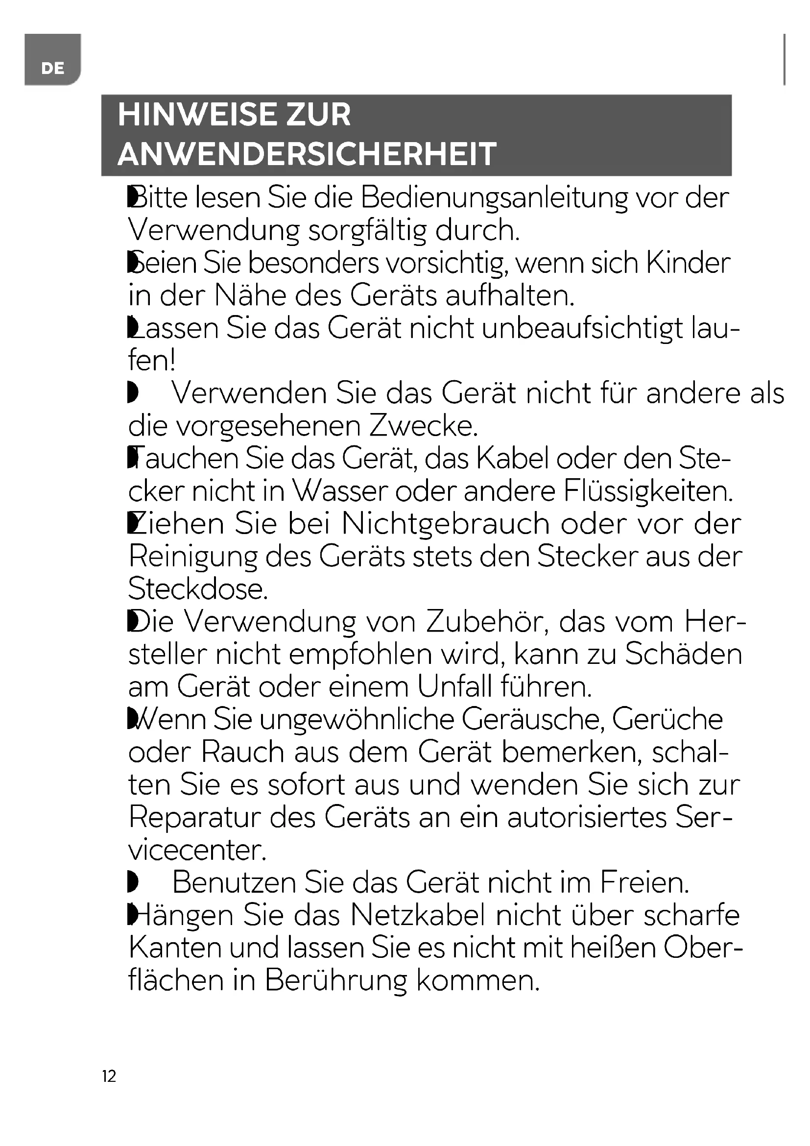 Lassen Sie das Gerät nicht unbeaufsichtigt lau- fen! Verwenden Sie das Gerät nicht für andere als die vorgesehenen Zwecke.