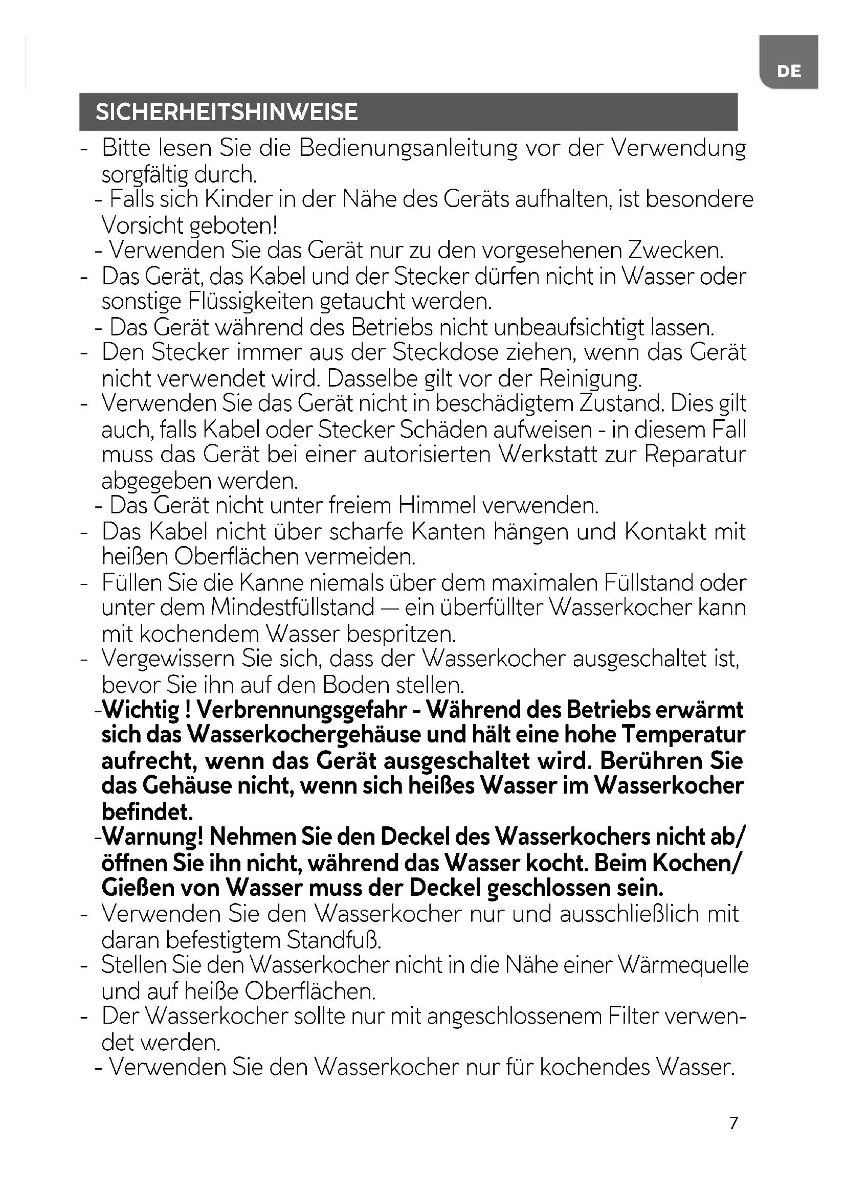 Der Wasserkocher sollte nur mit angeschlossenem Filter verwen- det werden. - Verwenden Sie den Wasserkocher nur für kochendes Wasser.8