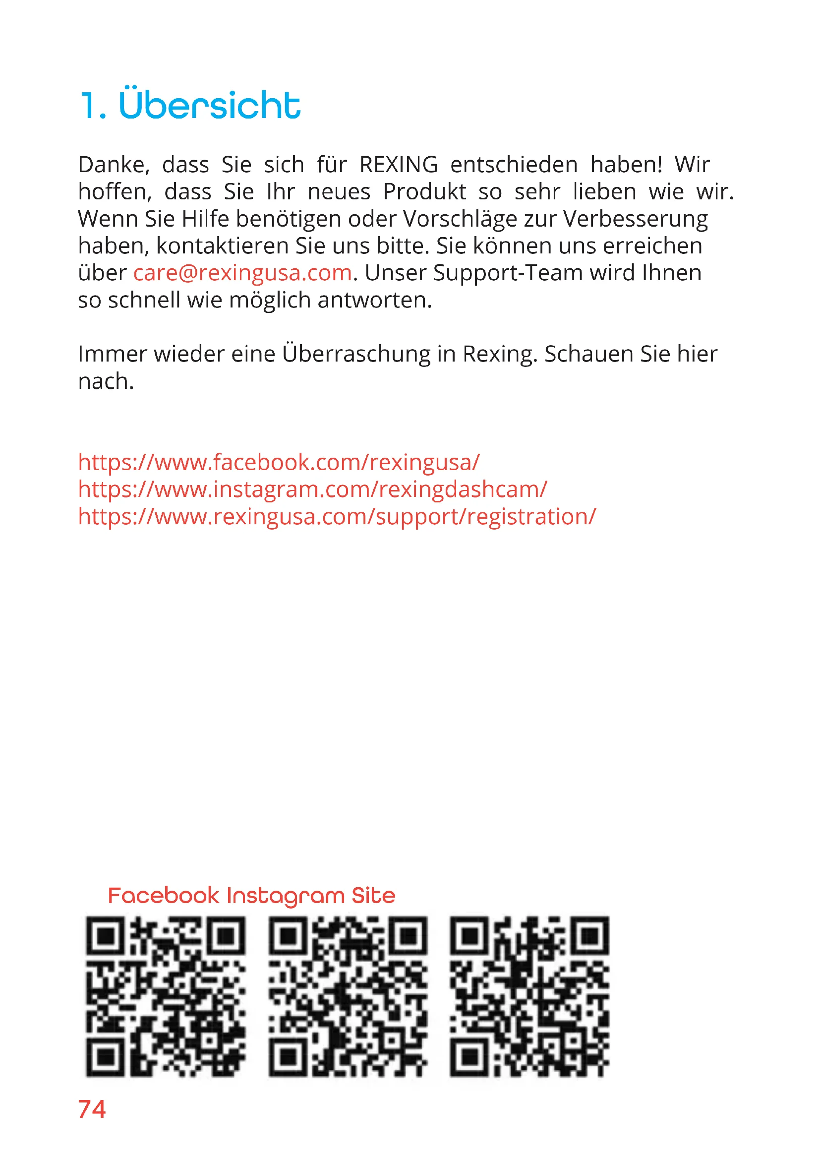 Danke, dass Sie sich für REXING entschieden haben! Wir hoen, dass Sie Ihr neues Produkt so sehr lieben wie wir. Wenn Sie Hilfe benötigen oder Vorschläge zur Verbesserung haben, kontaktieren Sie uns bitte. Sie können uns erreichen über care@rexingusa.com. Unser Support-Team wird Ihnen so schnell wie möglich antworten. Immer wieder eine Überraschung in Rexing. Schauen Sie hier nach. https://www.facebook.com/rexingusa/ https://www.instagram.com/rexingdashcam/ https://www.rexingusa.com/support/registration/75