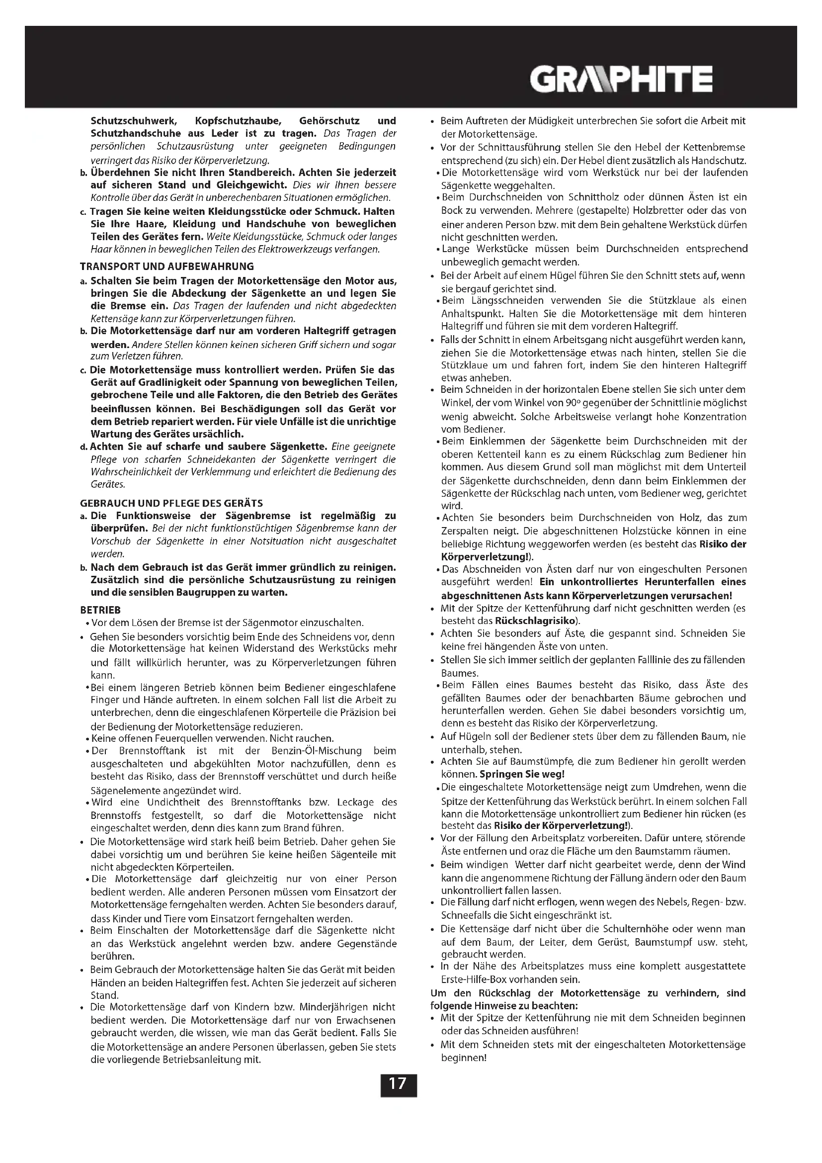 a. Schalten Sie beim Tragen der Motorkettensäge den Motor aus, bringen Sie die Abdeckung der Sägenkette an und legen Sie die Bremse ein. Das Tragen der laufenden und nicht abgedeckten Kettensäge kann zur Körperverletzungen führen. b. Die Motorkettensäge darf nur am vorderen Haltegri getragen werden. Andere Stellen können keinen sicheren Gri sichern und sogar zum Verletzen führen. c. Die Motorkettensäge muss kontrolliert werden. Prüfen Sie das Gerät auf Gradlinigkeit oder Spannung von beweglichen Teilen, gebrochene Teile und alle Faktoren, die den Betrieb des Gerätes beeinussen können. Bei Beschädigungen soll das Gerät vor dem Betrieb repariert werden. Für viele Unfälle ist die unrichtige Wartung des Gerätes ursächlich. d. Achten Sie auf scharfe und saubere Sägenkette. Eine geeignete Pege von scharfen Schneidekanten der Sägenkette verringert die Wahrscheinlichkeit der Verklemmung und erleichtert die Bedienung des Gerätes.