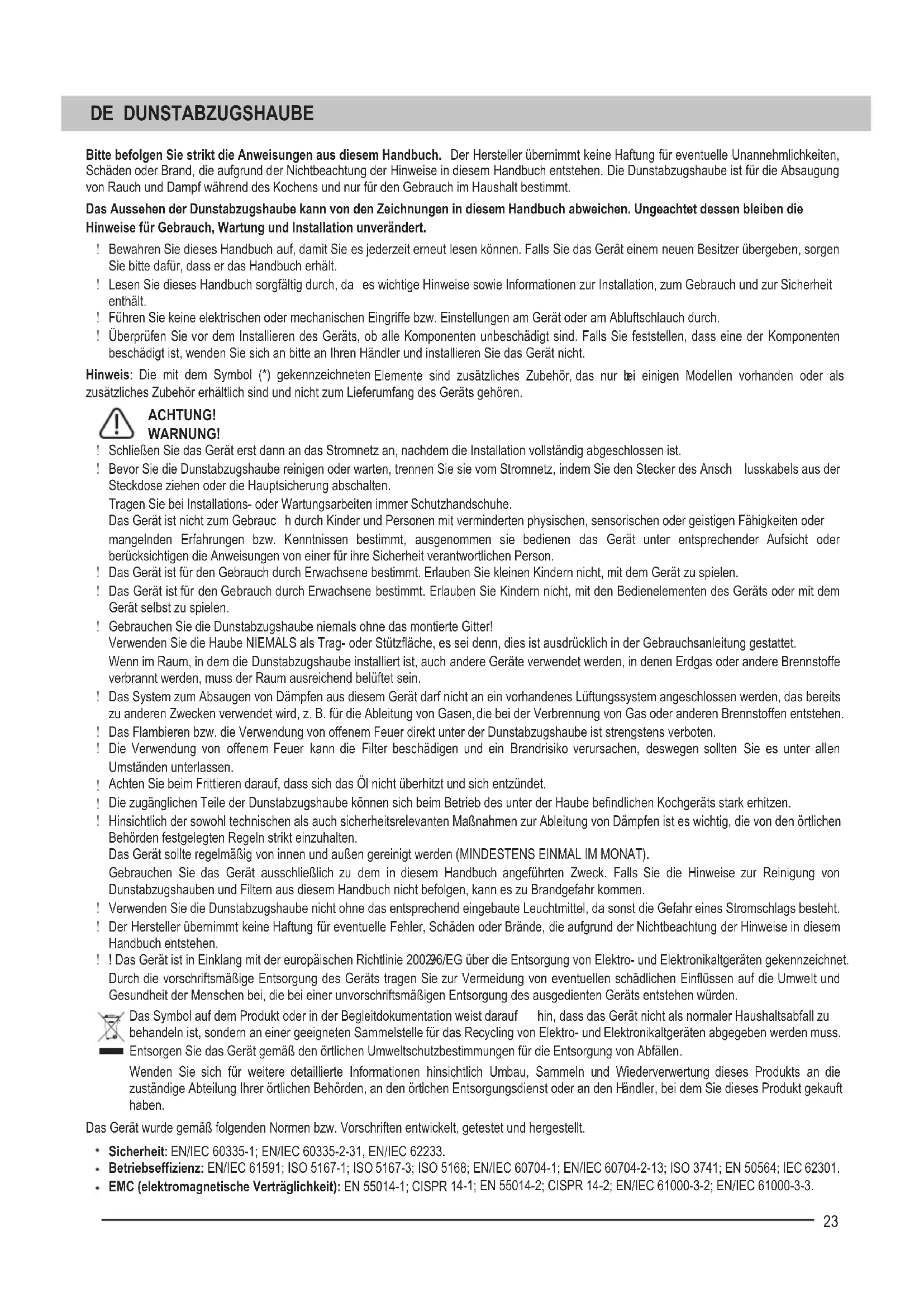 Bitte befolgen Sie strikt die Anweisungen aus diesem Handbuch. Der Hersteller übernimmt keine Haftung für eventuelle Unannehmlichkeiten, Schäden oder Brand, die aufgrund der Nichtbeachtung der Hinweise in diesem Handbuch entstehen. Die Dunstabzugshaube ist für die Absaugung von Rauch und Dampf während des Kochens und nur für den Gebrauch im Haushalt bestimmt. Das Aussehen der Dunstabzugshaube kann von den Zeichnungen in diesem Handbu ch abweichen. Ungeachtet dessen bleiben die Hinweise für Gebrauch, Wartung und Installation unverändert. Bewahren Sie dieses Handbuch auf, damit Sie es jederzeit erneut lesen können. Falls Sie das Gerät einem neuen Besitzer übergeben, sorgen Sie bitte dafür, dass er das Handbuch erhält. Lesen Sie dieses Handbuch sorgfältig durch, da es wichtige Hinweise sowie Informationen zur Installation, zum Gebrauch und zur Sicherheit enthält. Führen Sie keine elektrischen oder mechanischen Eingriffe bzw. Einstellungen am Gerät oder am Abluftschlauch durch. Überprüfen Sie vor dem Installieren des Geräts, ob alle Komponenten unbeschädigt sind. Falls Sie feststellen, dass eine der Komponenten beschädigt ist, wenden Sie sich an bitte an Ihren Händler und installieren Sie das Gerät nicht. Hinweis: Die mit dem Symbol (*) gekennzeichneten Elemente sind zusätzliches Zubehör, das nur b ei einigen Modellen vorhanden oder als zusätzliches Zubehör erhältlich sind und nicht zum Lieferumfang des Geräts gehören. ACHTUNG! WARNUNG! Schließen Sie das Gerät erst dann an das Stromnetz an, nachdem die Installation vollständig abgeschlossen ist. Bevor Sie die Dunstabzugshaube reinigen oder warten, trennen Sie sie vom Stromnetz, indem Sie den Stecker des Ansch lusskabels aus der Steckdose ziehen oder die Hauptsicherung abschalten. Tragen Sie bei Installations- oder Wartungsarbeiten immer Schutzhandschuhe. Das Gerät ist nicht zum Gebrauc h durch Kinder und Personen mit verminderten physischen, sensorischen oder geistigen Fähigkeiten oder mangelnden Erfahrungen bzw. Kenntnissen bestimmt, ausgenommen sie bedienen das Gerät unter entsprechender Aufsicht oder berücksichtigen die Anwe isungen von einer für ihre Sicherheit verantwortlichen Person. Das Gerät ist für den Gebrauch durch Erwachsene bestimmt. Erlauben Sie kleinen Kindern nicht, mit dem Gerät zu spielen. Das Gerät ist für den Gebrauch durch Erwachsene bestimmt. Erlauben Sie Kindern nicht, mit den Bedienelementen des Geräts oder mit dem Gerät selbst zu spielen. Gebrauchen Sie die Dunstabzugshaube niemals ohne das montierte Gitter! Verwenden Sie die Haube NIEMALS als Trag- oder Stützfläche, es sei denn, dies ist ausdrücklich in der Gebrauchsanleitung gestattet. Wenn im Raum, in dem die Dunstabzugshaube installiert ist, auch andere Geräte verwendet werden, in denen Erdgas oder andere Brennstoffe verbrannt werden, muss der Raum ausreichend belüftet sein. Das System zum Absaugen von Dämpfen aus diesem Gerät darf nicht an ein vorhandenes Lüftungssystem angeschlossen werden, das bereits zu anderen Zwecken verwendet wird, z. B. für die Ableitung von Gasen, die bei der Verbrennung von Gas oder anderen Brennstoffen entstehen. Das Flambieren bzw. die Verwendung von offenem Feuer direkt unter der Dunstabzugshaube ist strengstens verboten. Die Verwendung von offenem Feuer kann die Filter beschädigen und ein Brandrisiko verursachen, deswegen sollten Sie es unter allen Umständen unterlassen. Achten Sie beim Frittieren darauf, dass sich das Öl nicht überhitzt u nd sich entzündet. Die zugänglichen Teile der Dunstabzugshaube können sich beim Betrieb des unter der Haube befindlichen Kochgeräts stark erhitzen. Hinsichtlich der sowohl technischen als auch sicherheitsrelevanten Maßnahmen zur Ableitung von Dämpfen ist es wichtig, die von den örtlichen Behörden festgelegten Regeln strikt einzuhalten. Das Gerät sollte regelmäßig von innen und außen gereinigt werden (MINDESTENS EINMAL IM MONAT). Gebrauchen Sie das Gerät ausschließlich zu dem in diesem Handbuch angeführten Zweck. Falls Sie die Hinweise zur Reinigung von Dunstabzugshauben und Filtern aus diesem Handb uch nicht befolgen, kann es zu Brandgefahr kommen. Verwenden Sie die Dunstabzugshaube nicht ohne das entsprechend eingebaute Leuchtmittel, da sonst die Gefahr eines Stromschlags besteht. Der Hersteller übernimmt keine Haftung für eventuelle Fehler, Schäden oder Brände, die aufgrund der Nichtbeachtung der Hinweise in diesem Handbuch entstehen. ! Das Gerät ist in Einklang mit der europäischen Richtlinie 2002/ 96/EG über die Entsorgung von Elektro- und Elektronikaltgeräten gekennzeichnet. Durch die vorschriftsmäßige Entsorgung des Geräts tragen Sie zur Vermeidung von eventuellen schädlichen Einflüssen auf die Umwelt und Gesundheit der Menschen bei, die bei einer unvorschriftsmäßigen Entsorgung des ausgedienten Geräts entstehen würden. Das Symbol auf dem Produkt oder in der Begleitdokumentation weist darauf hin, dass das Gerät nicht als normaler Haushaltsabfall zu behandeln ist, sondern an einer geeigneten Sammelstelle für das Recycling von Elektro- und Elektronikaltgeräten abgegeben werden muss. Entsorgen Sie das Gerät gemäß den örtlichen Umweltschutzbestimmungen für die Entsorgung von Abfällen. Wenden Sie sich für weitere detaillierte Informationen hinsichtlich Umbau, Sammeln und Wiederverwertung dieses Produkts an die zuständige Abteilung Ihrer örtlichen Behörden, an den örtl ichen Entsorgungsdienst oder an den H ändler, bei dem Sie dieses Produkt gekauft haben. Das Gerät wurde gemäß folgenden Normen bzw. Vorschriften entwickelt, getestet und hergestellt. Sicherheit: EN/IEC 60335-1; EN/IEC 60335-2-31, EN/IEC 62233. Betriebseffizienz: EN/IEC 61591; ISO 5167-1; ISO 5167-3; ISO 5168; EN/IEC 60704-1; EN/IEC 60704-2-13; ISO 3741; EN 50564; IEC 62301. EMC (elektromagnetische Verträglichkeit): EN 55014-1; CISPR 1 4-1; EN 55014-2; CISPR 14-2; EN/IEC 61000-3-2; EN/IEC 61000-3-3.