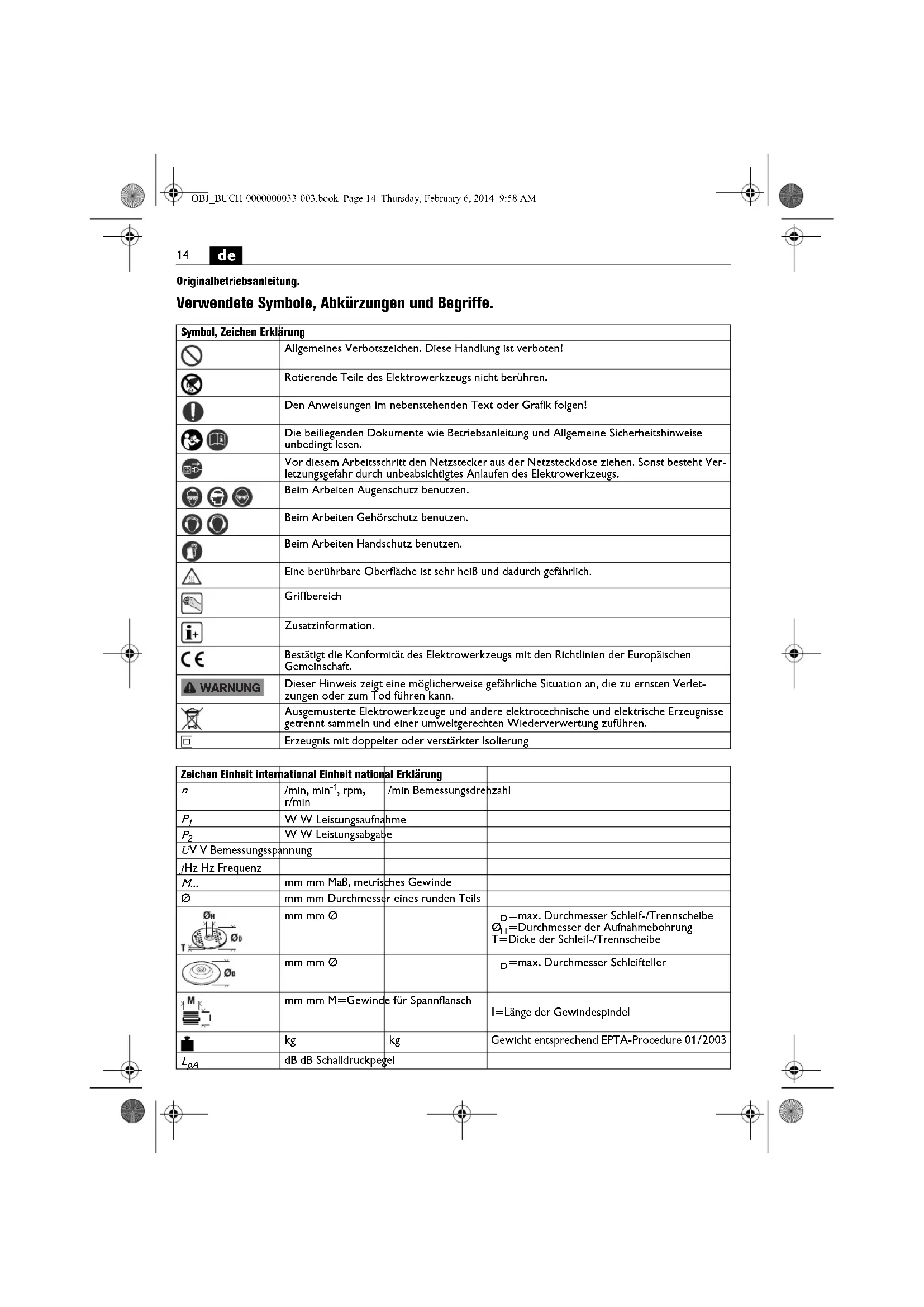 Originalbetriebsanleitung. Verwendete Symbole, Abkürzungen und Begriffe. Symbol, Zeichen Erklärung Allgemeines Verbotszeichen. Diese Handlung ist verboten! Rotierende Teile des Elektrowerkzeugs nicht berühren. Den Anweisungen im nebenstehenden Text oder Grafik folgen! Die beiliegenden Dokumente wie Betriebsanleitung und Allgemeine Sicherheitshinweise unbedingt lesen. Vor diesem Arbeitsschritt den Netzstecker aus der Netzsteckdose ziehen. Sonst besteht Ver- letzungsgefahr durch unbeabsichtigtes Anlaufen des Elektrowerkzeugs. Beim Arbeiten Augenschutz benutzen. Beim Arbeiten Gehörschutz benutzen. Beim Arbeiten Handschutz benutzen. Eine berührbare Oberfläche ist sehr heiß und dadurch gefährlich. Griffbereich Zusatzinformation. Bestätigt die Konformität des Elektrowerkzeugs mit den Richtlinien der Europäischen Gemeinschaft. Dieser Hinweis zeigt eine möglicherweise gefährliche Situation an, die zu ernsten Verlet- zungen oder zum Tod führen kann. Ausgemusterte Elektrowerkzeuge und andere elektrotechnische und elektrische Erzeugnisse getrennt sammeln und einer umweltgerechten Wiederverwertung zuführen. Erzeugnis mit doppelter oder verstärkter Isolierung WARNUNG Zeichen Einheit international Einheit national Erklärung