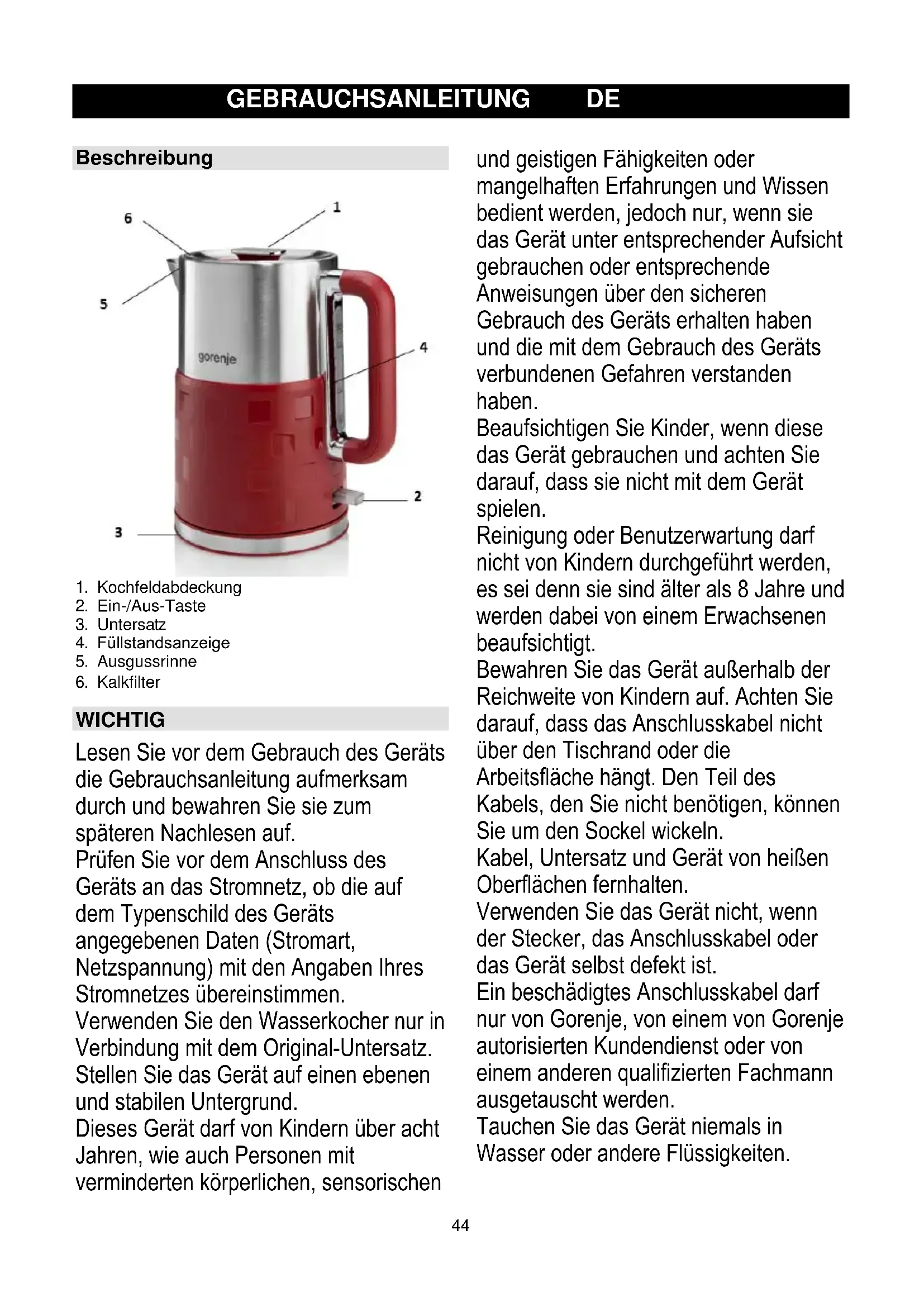 WICHTIG Lesen Sie vor dem Gebrauch des Geräts die Gebrauchsanleitung aufmerksam durch und bewahren Sie sie zum späteren Nachlesen auf. Prüfen Sie vor dem Anschluss des Geräts an das Stromnetz, ob die auf dem Typenschild des Geräts angegebenen Daten (Stromart, Netzspannung) mit den Angaben Ihres Stromnetzes übereinstimmen. Verwenden Sie den Wasserkocher nur in Verbindung mit dem Original-Untersatz. Stellen Sie das Gerät auf einen ebenen und stabilen Untergrund. Dieses Gerät darf von Kindern über acht Jahren, wie auch Personen mit verminderten körperlichen, sensorischen und geistigen Fähigkeiten oder mangelhaften Erfahrungen und Wissen bedient werden, jedoch nur, wenn sie das Gerät unter entsprechender Aufsicht gebrauchen oder entsprechende Anweisungen über den sicheren Gebrauch des Geräts erhalten haben und die mit dem Gebrauch des Geräts verbundenen Gefahren verstanden haben. Beaufsichtigen Sie Kinder, wenn diese das Gerät gebrauchen und achten Sie darauf, dass sie nicht mit dem Gerät spielen. Reinigung oder Benutzerwartung darf nicht von Kindern durchgeführt werden, es sei denn sie sind älter als 8 Jahre und werden dabei von einem Erwachsenen beaufsichtigt. Bewahren Sie das Gerät außerhalb der Reichweite von Kindern auf. Achten Sie darauf, dass das Anschlusskabel nicht über den Tischrand oder die Arbeitsfläche hängt. Den Teil des Kabels, den Sie nicht benötigen, können Sie um den Sockel wickeln. Kabel, Untersatz und Gerät von heißen Oberflächen fernhalten. Verwenden Sie das Gerät nicht, wenn der Stecker, das Anschlusskabel oder das Gerät selbst defekt ist. Ein beschädigtes Anschlusskabel darf nur von Gorenje, von einem von Gorenje autorisierten Kundendienst oder von einem anderen qualifizierten Fachmann ausgetauscht werden. Tauchen Sie das Gerät niemals in Wasser oder andere Flüssigkeiten.45 Verwenden Sie den Wasserkocher nur zum Aufkochen von Wasser. Den Wasserkocher darf nicht zum Aufwärmen von Suppen oder anderen Flüssigkeiten und eingelegten Lebensmitteln verwendet werden. Heißes Wasser kann Verbrühungen verursachen. Seien Sie vorsichtig, wenn sich heißes Wasser im Gerät befindet. Achten Sie darauf, dass das Gerät nur bis zur Markierung „Max.“ mit Wasser gefüllt wird. Falls in den Wasserkocher zu viel Wasser eingefüllt wird, kann das kochende Wasser aus dem Wasserkocher spritzen und Verbrühungen verursachen. Den Deckel nicht öffnen, wenn das Wasser siedet! Seien Sie beim Öffnen des Deckels unmittelbar nach dem Aufkochen des Wassers vorsichtig; der Dampf im Behälter ist sehr heiß. Das Gehäuse des Geräts nicht berühren, da es während des Betriebs sehr heiß wird. Heben Sie den Wasserkocher vom Untersatz, indem Sie ihn am Handgriff halten. Das Wasser muss den Boden des Behälters bedecken, sonst kann es verdunsten und den Wasserkocher austrocknen. Am Deckel des Geräts und am Untersatz kann sich Kondenswasser ansammeln. Das ist völlig normal und stellt keinen Fehler dar. Wenn Sie das Gerät benutzen, können je nach Härtegrad des Wassers auf dem Heizelement des Geräts Flecken erscheinen. Dies wird durch Kalkablagerungen verursacht, die sich mit der Zeit auf dem Heizelement und im Inneren des Geräts ablagern. Je härter das Wasser ist, umso schneller lagert sich Kalkstein am Heizelement ab. Kalkstein kann verschiedene Farben haben. Obwohl diese Kalkablagerungen nicht schädlich sind, kann eine zu große Menge davon den Betrieb des Geräts beeinträchtigen. Deswegen sollten Sie die Kalkablagerungen regelmäßig entfernen (siehe Kapitel „Entkalken“). Dieses Gerät ist gemäß der EU-Richtlinie 2012/19/EU über elektrische und elektronische Altgeräte (Waste Electrical and Electronic Equipment - WEEE) gekennzeichnet. Diese Richtlinie legt die Anforderungen für das Sammeln und den Umgang mit Elektro- und Elektronikaltgeräten fest, die für die gesamte Europäische Union gültig sind. Elektromagnetische Felder (EMF) Dieses Gerät von Gorenje entspricht allen Normen, die sich auf die Normen der elektromagnetischen Felder (EMF) beziehen. Wenn Sie mit dem Gerat ordnungsgemäß und entsprechend den Anweisungen in diesem Handbuch verfahren, ist dessen Verwendung hinsichtlich der heute gültigen wissenschaftlichen Nachweise ungefährlich. Automatische Sicherheitsabschaltung Das Gerät ist mit einer Sicherheitsabschaltung ausgerüstet, die den Betrieb des leeren Geräts unmöglich macht. Die Sicherheitsabschaltung schaltet das Gerät aus, wenn im Wasserkocher zu wenig oder überhaupt kein Wasser ist. Der Ein- /Aus-Schalter bleibt auf der Position EIN, das Indikatorlämpchen erlischt. Stellen Sie den Ein- /Aus-Schalter auf AUS und warten Sie zehn Minuten, damit sich das Gerät abkühlt. Heben Sie dann den Wasserkocher vom Untersatz, damit der Trockenlaufschutz resetiert wird. Der Wasserkocher ist nun betriebsbereit. Vor dem ersten Gebrauch