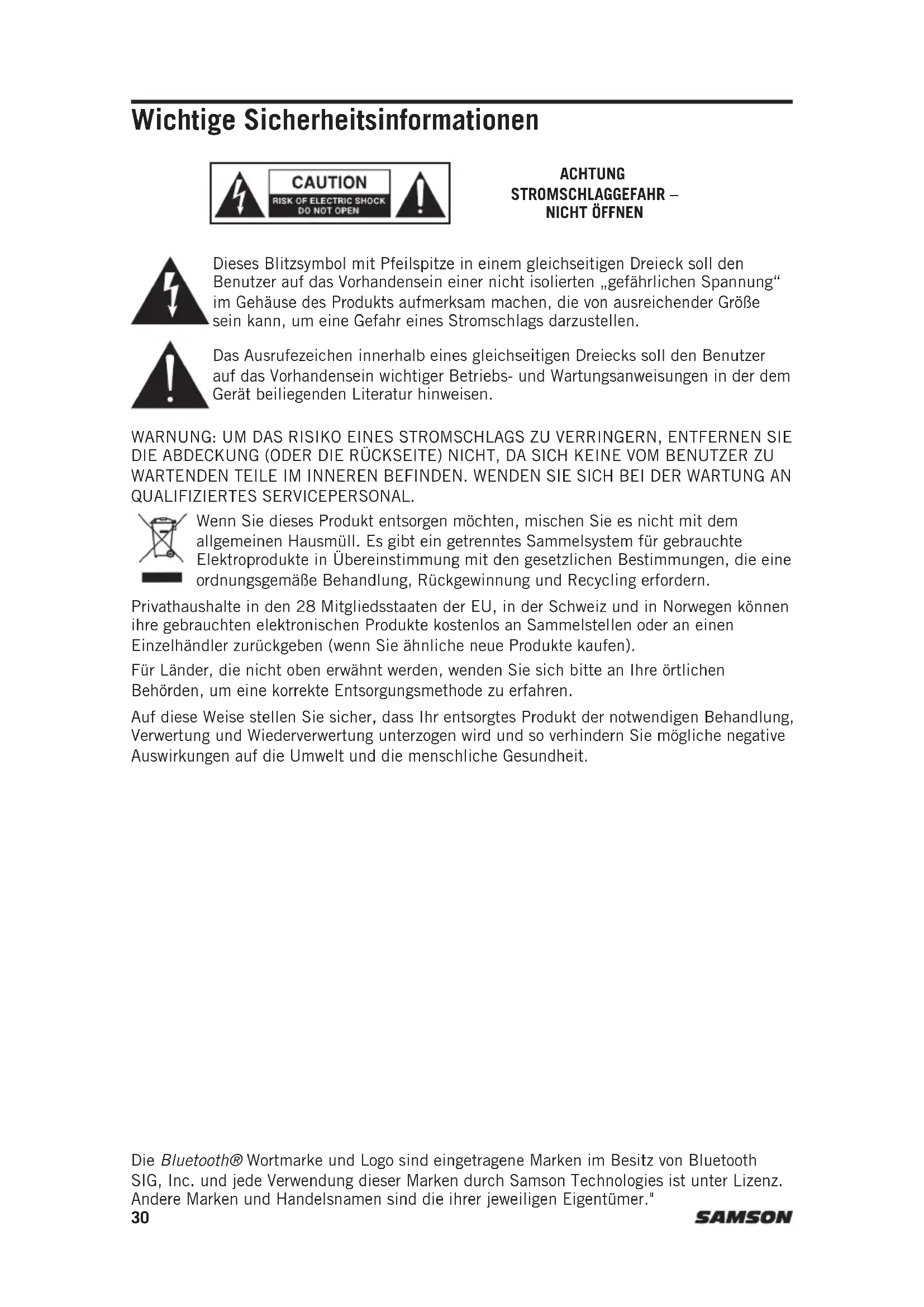 Die Bluetooth® Wortmarke und Logo sind eingetragene Marken im Besitz von Bluetooth SIG, Inc. und jeder Verwendung dieser Marken durch Samson Technologies ist unter Lizenz. Andere Marken und Handelsnamen sind die ihrer jeweiligen Eigentümer."