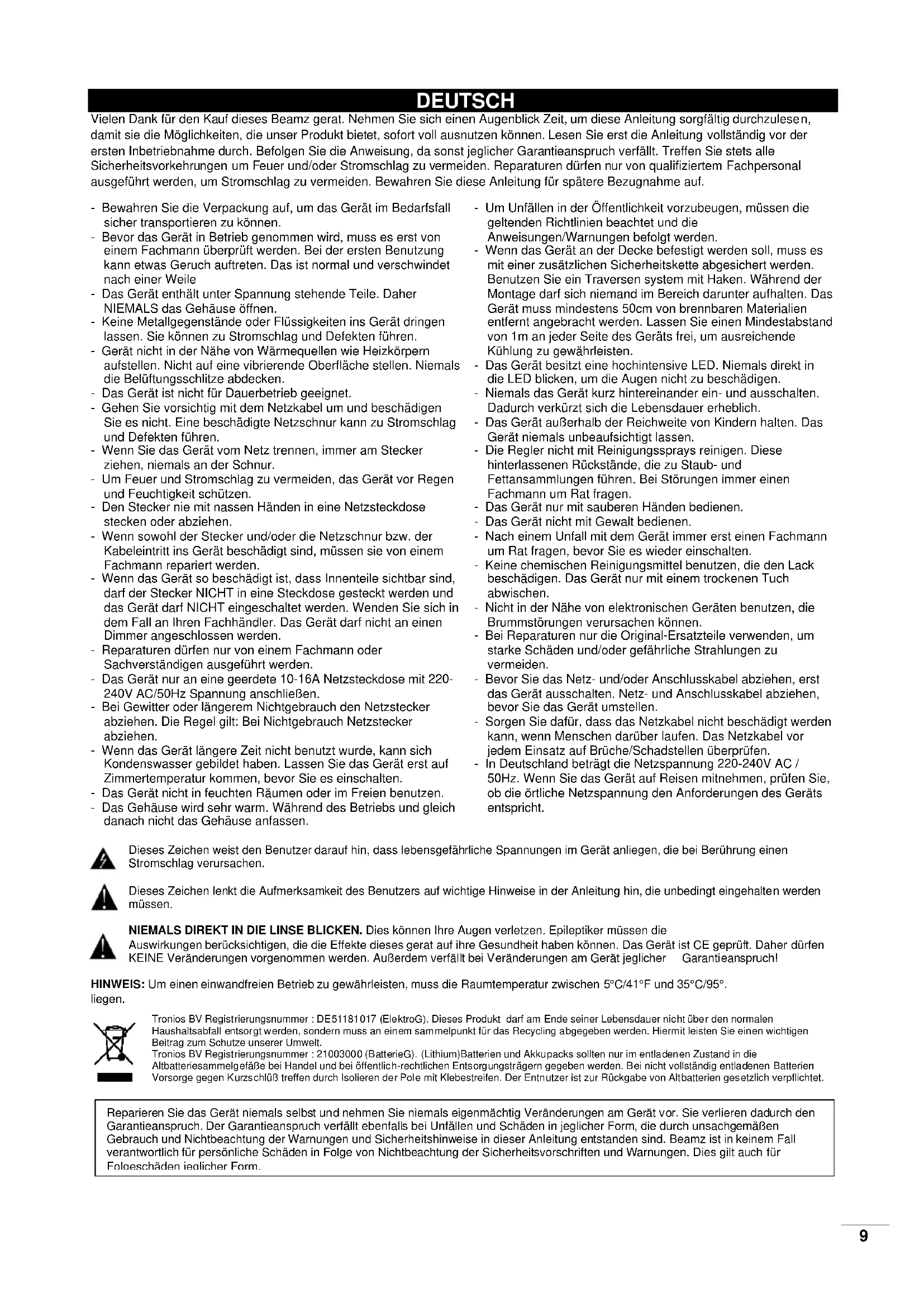 Reinig de machine in een goed geventileerde ruimte!9 DEUTSCH Vielen Dank für den Kauf dieses Beamz gerat. Nehmen Sie sich einen Augenblick Zeit, um diese Anleitung sorgfältig durchzulesen, damit sie die Möglichkeiten, die unser Produkt bietet, sofort voll ausnutzen können. Lesen Sie erst die Anleitung vollständig vor der ersten Inbetriebnahme durch. Befolgen Sie die Anweisung, da sonst jeglicher Garantieanspruch verfällt. Treffen Sie stets alle Sicherheitsvorkehrungen um Feuer und/oder Stromschlag zu vermeiden. Reparaturen dürfen nur von qualifiziertem Fachpersonal ausgeführt werden, um Stromschlag zu vermeiden. Bewahren Sie diese Anleitung für spätere Bezugnahme auf. - Bewahren Sie die Verpackung auf, um das Gerät im Bedarfsfall sicher transportieren zu können. - Bevor das Gerät in Betrieb genommen wird, muss es erst von einem Fachmann überprüft werden. Bei der ersten Benutzung kann etwas Geruch auftreten. Das ist normal und verschwindet nach einer Weile - Das Gerät enthält unter Spannung stehende Teile. Daher NIEMALS das Gehäuse öffnen. - Keine Metallgegenstände oder Flüssigkeiten ins Gerät dringen lassen. Sie können zu Stromschlag und Defekten führen. - Gerät nicht in der Nähe von Wärmequellen wie Heizkörpern aufstellen. Nicht auf eine vibrierende Oberfläche stellen. Niemals die Belüftungsschlitze abdecken. - Das Gerät ist nicht für Dauerbetrieb geeignet. - Gehen Sie vorsichtig mit dem Netzkabel um und beschädigen Sie es nicht. Eine beschädigte Netzschnur kann zu Stromschlag und Defekten führen. - Wenn Sie das Gerät vom Netz trennen, immer am Stecker ziehen, niemals an der Schnur. - Um Feuer und Stromschlag zu vermeiden, das Gerät vor Regen und Feuchtigkeit schützen. - Den Stecker nie mit nassen Händen in eine Netzsteckdose stecken oder abziehen. - Wenn sowohl der Stecker und/oder die Netzschnur bzw. der Kabeleintritt ins Gerät beschädigt sind, müssen sie von einem Fachmann repariert werden. - Wenn das Gerät so beschädigt ist, dass Innenteile sichtbar sind, darf der Stecker NICHT in eine Steckdose gesteckt werden und das Gerät darf NICHT eingeschaltet werden. Wenden Sie sich in dem Fall an Ihren Fachhändler. Das Gerät darf nicht an einen Dimmer angeschlossen werden. - Reparaturen dürfen nur von einem Fachmann oder Sachverständigen ausgeführt werden. - Das Gerät nur an eine geerdete 10-16A Netzsteckdose mit 220- 240V AC/50Hz Spannung anschließen. - Bei Gewitter oder längerem Nichtgebrauch den Netzstecker abziehen. Die Regel gilt: Bei Nichtgebrauch Netzstecker abziehen. - Wenn das Gerät längere Zeit nicht benutzt wurde, kann sich Kondenswasser gebildet haben. Lassen Sie das Gerät erst auf Zimmertemperatur kommen, bevor Sie es einschalten. - Das Gerät nicht in feuchten Räumen oder im Freien benutzen. - Das Gehäuse wird sehr warm. Während des Betriebs und gleich danach nicht das Gehäuse anfassen. - Um Unfällen in der Öffentlichkeit vorzubeugen, müssen die geltenden Richtlinien beachtet und die Anweisungen/Warnungen befolgt werden. - Wenn das Gerät an der Decke befestigt werden soll, muss es mit einer zusätzlichen Sicherheitskette abgesichert werden. Benutzen Sie ein Traversen system mit Haken. Während der Montage darf sich niemand im Bereich darunter aufhalten. Das Gerät muss mindestens 50cm von brennbaren Materialien entfernt angebracht werden. Lassen Sie einen Mindestabstand von 1m an jeder Seite des Geräts frei, um ausreichende Kühlung zu gewährleisten. - Das Gerät besitzt eine hochintensive LED. Niemals direkt in die LED blicken, um die Augen nicht zu beschädigen. - Niemals das Gerät kurz hintereinander ein- und ausschalten. Dadurch verkürzt sich die Lebensdauer erheblich. - Das Gerät außerhalb der Reichweite von Kindern halten. Das Gerät niemals unbeaufsichtigt lassen. - Die Regler nicht mit Reinigungssprays reinigen. Diese hinterlassenen Rückstände, die zu Staub- und Fettansammlungen führen. Bei Störungen immer einen Fachmann um Rat fragen. - Das Gerät nur mit sauberen Händen bedienen. - Das Gerät nicht mit Gewalt bedienen. - Nach einem Unfall mit dem Gerät immer erst einen Fachmann um Rat fragen, bevor Sie es wieder einschalten. - Keine chemischen Reinigungsmittel benutzen, die den Lack beschädigen. Das Gerät nur mit einem trockenen Tuch abwischen. - Nicht in der Nähe von elektronischen Geräten benutzen, die Brummstörungen verursachen können. - Bei Reparaturen nur die Original-Ersatzteile verwenden, um starke Schäden und/oder gefährliche Strahlungen zu vermeiden. - Bevor Sie das Netz- und/oder Anschlusskabel abziehen, erst das Gerät ausschalten. Netz- und Anschlusskabel abziehen, bevor Sie das Gerät umstellen. - Sorgen Sie dafür, dass das Netzkabel nicht beschädigt werden kann, wenn Menschen darüber laufen. Das Netzkabel vor jedem Einsatz auf Brüche/Schadstellen überprüfen. - In Deutschland beträgt die Netzspannung 220-240V AC / 50Hz. Wenn Sie das Gerät auf Reisen mitnehmen, prüfen Sie, ob die örtliche Netzspannung den Anforderungen des Geräts entspricht. Dieses Zeichen weist den Benutzer darauf hin, dass lebensgefährliche Spannungen im Gerät anliegen, die bei Berührung einen Stromschlag verursachen. Dieses Zeichen lenkt die Aufmerksamkeit des Benutzers auf wichtige Hinweise in der Anleitung hin, die unbedingt eingehalten werden müssen. NIEMALS DIREKT IN DIE LINSE BLICKEN. Dies können Ihre Augen verletzen. Epileptiker müssen die Auswirkungen berücksichtigen, die die Effekte dieses gerat auf ihre Gesundheit haben können. Das Gerät ist CE geprüft. Daher dürfen KEINE Veränderungen vorgenommen werden. Außerdem verfällt bei Veränderungen am Gerät jeglicher Garantieanspruch! HINWEIS: Um einen einwandfreien Betrieb zu gewährleisten, muss die Raumtemperatur zwischen 5°C/41°F und 35°C/95°. liegen. Tronios BV Registrierungsnummer : DE51181017 (ElektroG). Dieses Produkt darf am Ende seiner Lebensdauer nicht über den normalen Haushaltsabfall entsorgt werden, sondern 