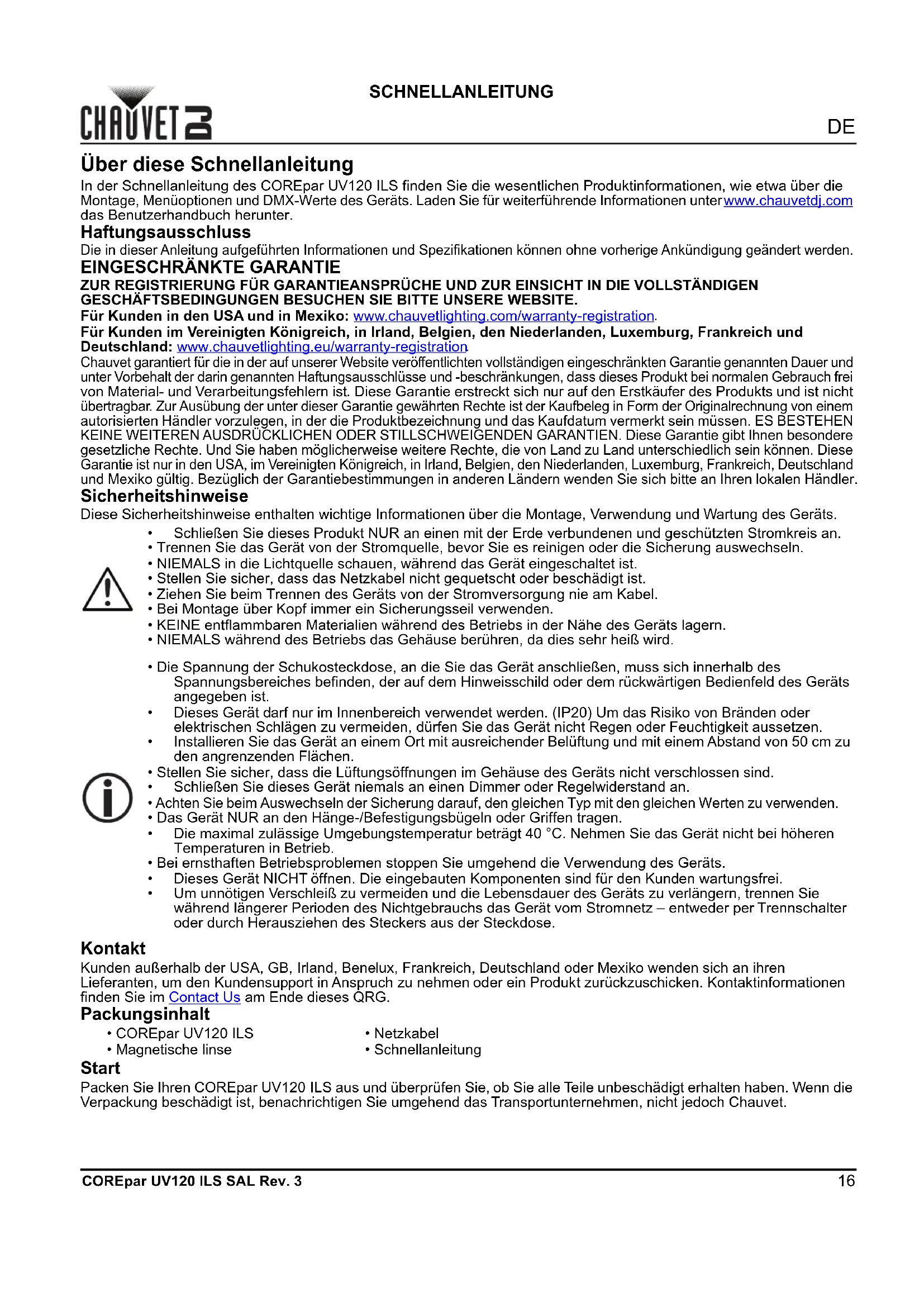 Chauvet garantiert für die in der auf unserer Website veröffentlichten vollständigen eingeschränkten Garantie genannten Dauer und unter Vorbehalt der darin genannten Haftungsausschlüsse und -beschränkungen, dass these Produkt bei normalen Gebrauch frei von Material- und Verarbeitungsfehlern ist. These Garantie erstreckt sich zur auf den Erstkäufer des Produkts und ist nicht übertragbar. Zur Ausübung der unter dieser Garantie gewährten Rechte ist der Kaufbeleg in Form der Originalrechnung von einem autorisierten Handler vorzulegen, in der die Produktbezeichnung und das Kaufdatum vermerkt sein mussen. ES BESTEHEN KEINE WEITEREN AUSDRÜCKLICHEN ODER STILLSCHWEIGENDEN GARANTIEN. These Garantie gibt ihren besondere gesetzliche Rechte. Und Sie haben möglicherweise weitere Rechte, die von Land zu Land unterschiedlich sein konnen. Diese Garantie ist nur in den USA, im Vereinigten Königreich, in Irland, Belgien, den Niederlanden, Luxemburg, Frankreich, Deutschland und Mexiko gültig. Bezüglich der Garantiebestimmungen in anderen Ländern wenden Sie sichitte an ihren lokalen Handler.