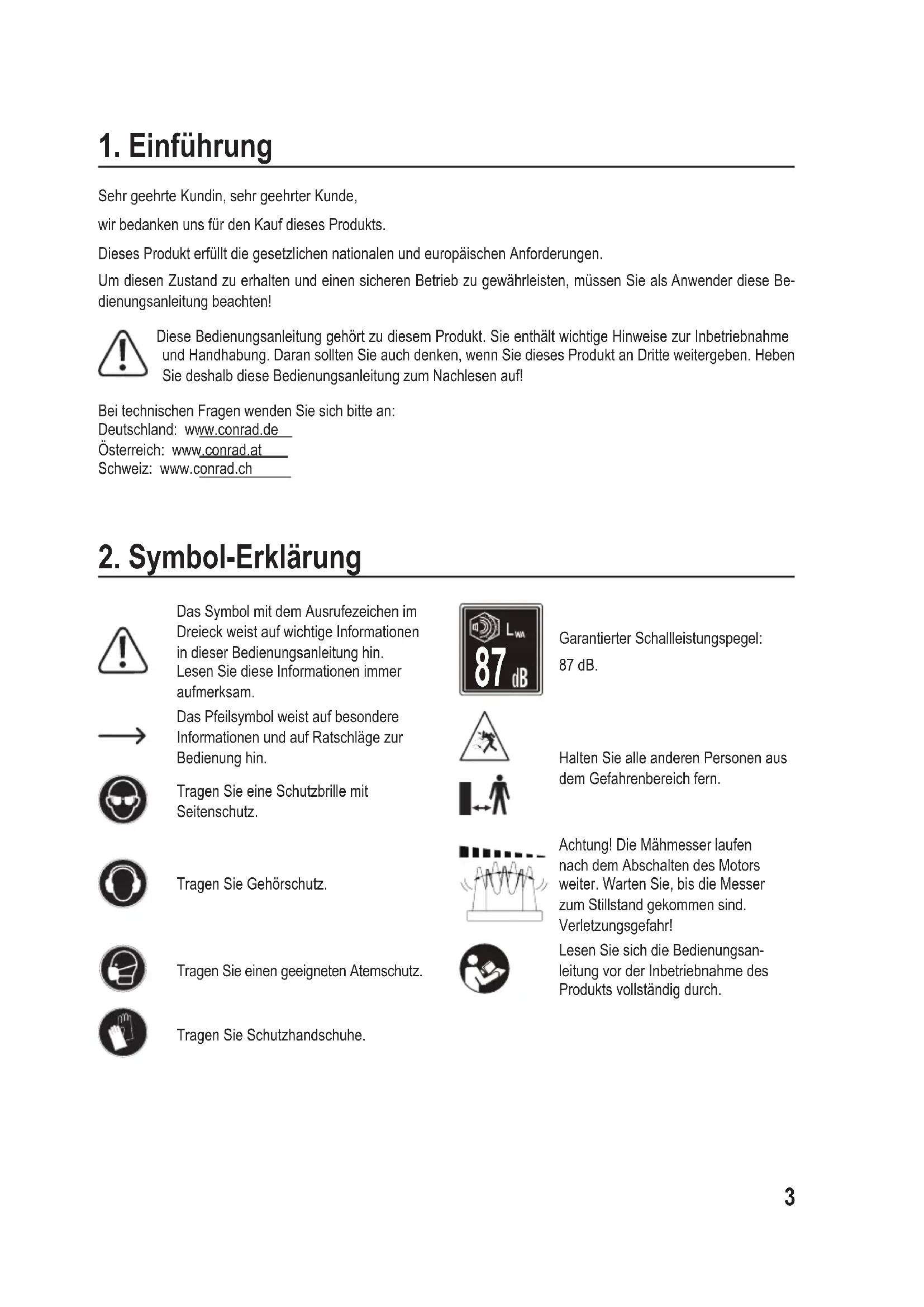 Garantierter Schallleistungspegel: 87 dB. Das Pfeilsymbol weist auf besondere Informationen und auf Ratschläge zur Bedienung hin. Halten Sie alle anderen Personen aus dem Gefahrenbereich fern.