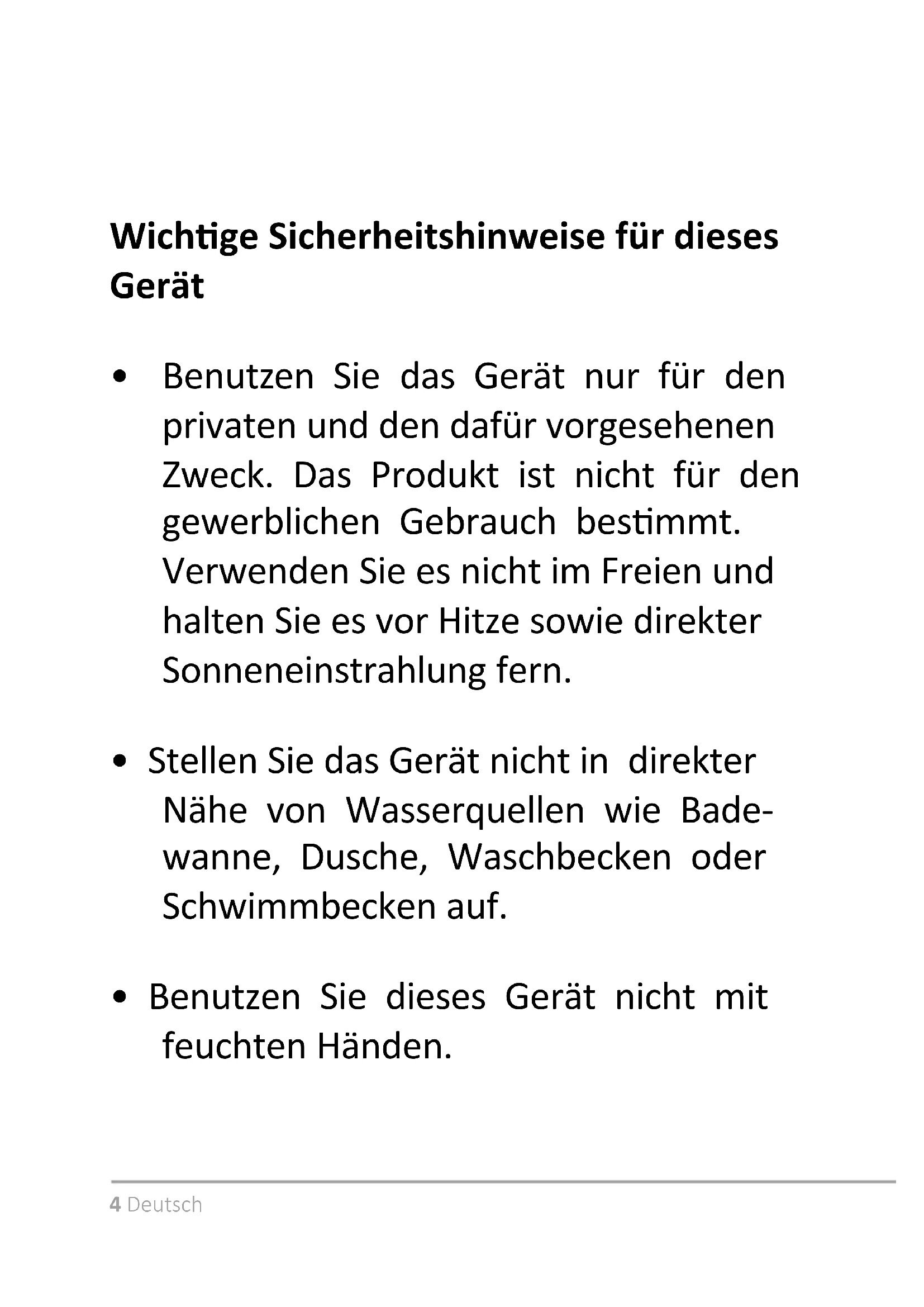 - Benutzen Sie das Gerät nur für den privaten und den dafür vorgesehenen Zweck. Das Produkt ist nicht für den gewerblichen Gebrauch besmmt. Verwenden Sie es nicht im Freien und halten Sie es vor Hitze sowie direkter Sonneneinstrahlung fern.