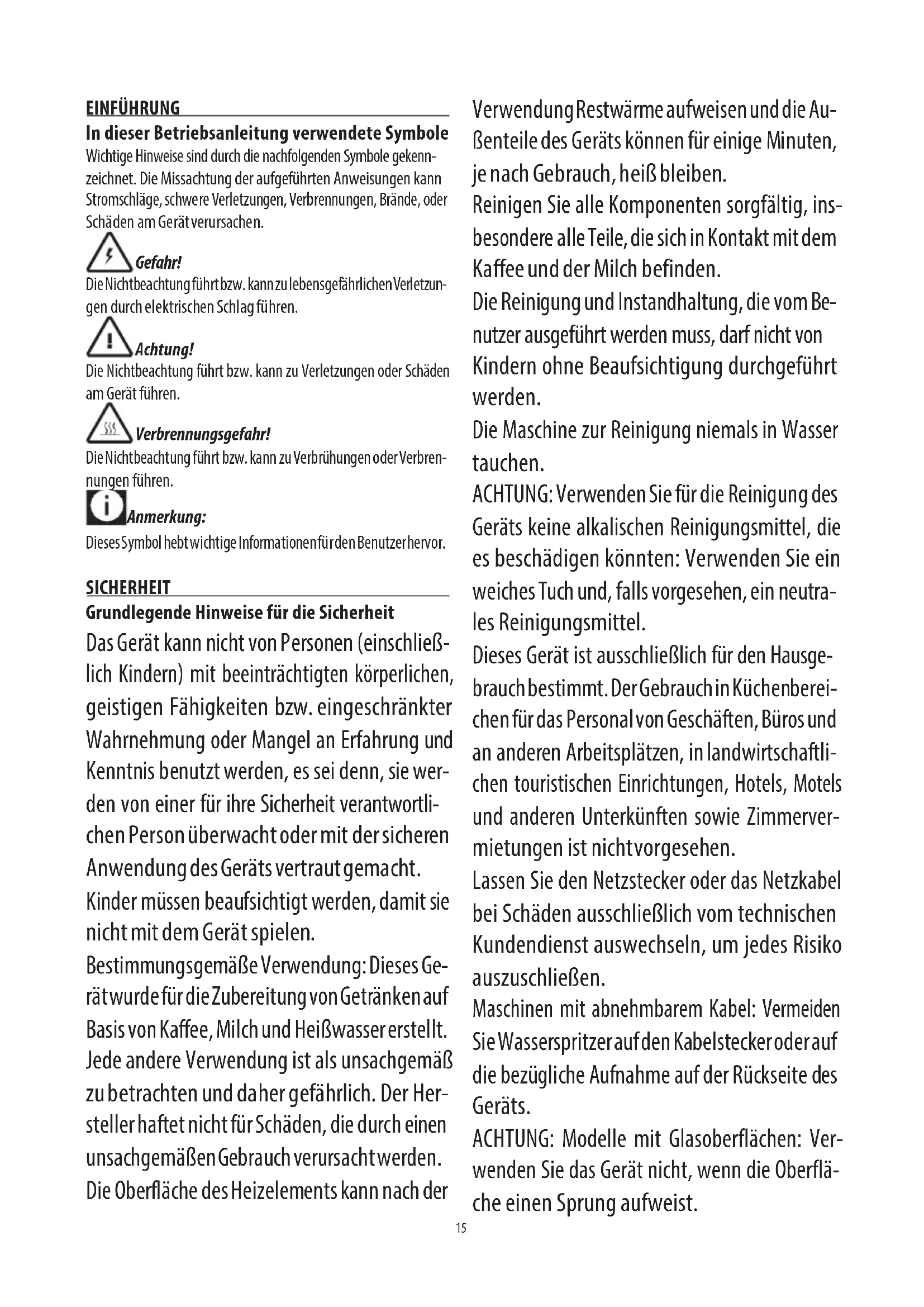 Le matériau du panneau doit être adapté au poids de la machine, qui est d'environ 25 kg. FR15 EINFÜHRUNG In dieser Betriebsanleitung verwendete Symbole Wichtige Hinweise sind durch die nachfolgenden Symbole gekenn- zeichnet. Die Missachtung der aufgeführten Anweisungen kann Stromschläge, schwere Verletzungen, Verbrennungen, Brände, oder Schäden am Gerät verursachen. Gefahr! Die Nichtbeachtung führt bzw. kann zu lebensgefährlichen Verletzun- gen durch elektrischen Schlag führen. Achtung! Die Nichtbeachtung führt bzw. kann zu Verletzungen oder Schäden am Gerät führen. Verbrennungsgefahr! Die Nichtbeachtung führt bzw. kann zu Verbrühungen oder Verbren- nungen führen. Anmerkung: Dieses Symbol hebt wichtige Informationen für den Benutzer hervor. SICHERHEIT Grundlegende Hinweise für die Sicherheit Das Gerät kann nicht von Personen (einschließ- lich Kindern) mit beeinträchtigten körperlichen, geistigen Fähigkeiten bzw. eingeschränkter Wahrnehmung oder Mangel an Erfahrung und Kenntnis benutzt werden, es sei denn, sie wer- den von einer für ihre Sicherheit verantwortli- chen Person überwacht oder mit der sicheren Anwendung des Geräts vertraut gemacht. Kinder müssen beaufsichtigt werden, damit sie nicht mit dem Gerät spielen. Bestimmungsgemäße Verwendung: Dieses Ge- rät wurde für die Zubereitung von Getränken auf Basis von Kaffee, Milch und Heißwasser erstellt. Jede andere Verwendung ist als unsachgemäß zu betrachten und daher gefährlich. Der Her- steller haftet nicht für Schäden, die durch einen unsachgemäßen Gebrauch verursacht werden. Die Oberfläche des Heizelements kann nach der Verwendung Restwärme aufweisen und die Au- ßenteile des Geräts können für einige Minuten, je nach Gebrauch, heiß bleiben. Reinigen Sie alle Komponenten sorgfältig, ins- besondere alle Teile, die sich in Kontakt mit dem Kaffee und der Milch befinden. Die Reinigung und Instandhaltung, die vom Be- nutzer ausgeführt werden muss, darf nicht von Kindern ohne Beaufsichtigung durchgeführt werden. Die Maschine zur Reinigung niemals in Wasser tauchen. ACHTUNG: Verwenden Sie für die Reinigung des Geräts keine alkalischen Reinigungsmittel, die es beschädigen könnten: Verwenden Sie ein weiches Tuch und, falls vorgesehen, ein neutra- les Reinigungsmittel. Dieses Gerät ist ausschließlich für den Hausge- brauch bestimmt. Der Gebrauch in Küchenberei- chen für das Personal von Geschäften, Büros und an anderen Arbeitsplätzen, in landwirtschaftli- chen touristischen Einrichtungen, Hotels, Motels und anderen Unterkünften sowie Zimmerver- mietungen ist nicht vorgesehen. Lassen Sie den Netzstecker oder das Netzkabel bei Schäden ausschließlich vom technischen Kundendienst auswechseln, um jedes Risiko auszuschließen. Maschinen mit abnehmbarem Kabel: Vermeiden Sie Wasserspritzer auf den Kabelstecker oder auf die bezügliche Aufnahme auf der Rückseite des Geräts. ACHTUNG: Modelle mit Glasoberflächen: Ver- wenden Sie das Gerät nicht, wenn die Oberflä- che einen Sprung aufweist.16 NUR FÜR EUROPÄISCHE MÄRKTE: Das Gerät kann von Kindern ab 8 Jahren benutzt werden, wenn sie beaufsichtigt werden oder eine Einweisung zum sicheren Gebrauch des Ge- räts erhalten haben bzw. mit den damit verbun- denen Gefahren vertraut sind. Die dem Benutzer obliegende Reinigung und Instandhaltung darf nicht von Kindern durchgeführt werden. Es sei denn, sie sind älter als 8 Jahre und werden beaufsichtigt. Das Gerät und das Netzkabel au- ßerhalb der Reichweite von Kindern unter acht Jahren halten. Das Gerät darf von Personen mit beeinträch- tigten körperlichen oder geistigen Fähigkeiten bzw. eingeschränkter Wahrnehmung oder ohne Kenntnissen hinsichtlich seiner Handhabung verwendet werden, wenn sie hierbei beauf- sichtigt werden oder im Gebrauch des Geräts geschult sind bzw. mit den damit verbundenen Gefahren vertraut sind. Kinder dürfen nicht mit dem Gerät spielen. Wenn das Gerät unbeaufsichtigt gelassen wird und bevor es auseinander- oder zusammenge- baut bzw. gereinigt werden soll, die Stromver- sorgung unterbrechen. Die Oberflächen, die dieses Symbol auf- weisen, werden während der Verwendung heiß (das Symbol ist nur auf einigen Modellen vor- handen). Gefahr! Da das Gerät mit Strom betrieben wird, muss sich an die nachfolgend aufgeführten Sicherheitshinweise gehalten werden:
