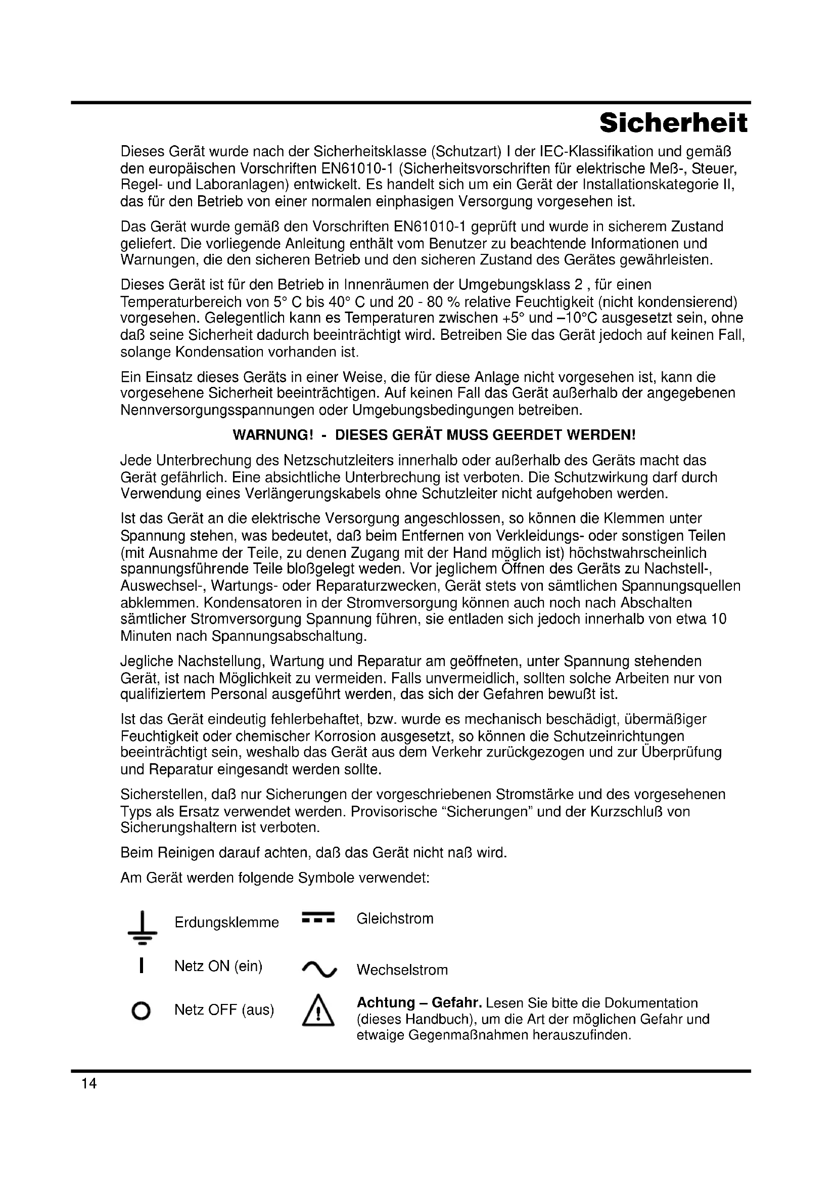 La tension maximale admissible entre une borne et la terre ( ) est de 300 V c.c.; la tension maximale admissible entre la borne d'une sortie et la borne d'une autre sortie de la même alimentation est également de 300 V c.c. AVERTISSEMENT! Effectuer toutes les connexions aux bornes, la sortie désactivée à tous les appareils. Il faut noter que le bloc peut uniquement recevoir du courant, mais non le consommer, de sorte qu’il n’est pas possible de mettre en opposition de phase les blocs reliés en série. Il est possible de relier le bloc en parallèle avec d’autres, afin de produire des courants de haute intensité. Lorsque plusieurs blocs sont reliés en parallèle, la tension de sortie doit être égale à celle du bloc de réglage de tension de sortie le plus élevé, jusqu’à ce que le courant consommé dépasse le réglage de limite de courant, auquel cas la sortie descend à celle du réglage le plus haut suivant, etc. En mode de courant constant, les blocs peuvent être reliés en parallèle, afin de donner un courant égal à la somme des réglages de limite de courant.13 Maintenance Le Constructeur ou ses agents à l'étranger répareront tout bloc qui tombe en panne. Si le propriétaire de l'appareil décide d'effectuer lui-même la maintenance, ceci doit uniquement être effectué par un personnel spécialisé qui doit se référer au manuel d’entretien que l'on peut se procurer directement auprès du Constructeur ou de ses agents à l'étranger. Fusible Type de fusible correct: 10 A 250 V HBC temporisé (T), 5 x 20 mm. Il faut noter que l’objet principal de ce fusible est de rendre l’instrument non dangereux et de limiter les dégâts en cas de panne d’un des dispositifs de commutation. En cas de panne d’un fusible, il est très probable que le fusible de rechange sautera également, étant donné que l’alimentation est probablement défectueuse; lorsque c’est le cas, il faudra renvoyer l’instrument chez le constructeur en vue de réparations. Uniquement remplacer les fusibles par des fusibles d'intensité nominale requise et de type spécifié. Il est interdit d'utiliser des fusibles bricolés et de court-circuiter des porte-fusibles. Pour remplacer un fusible, commencer par débrancher l’instrument de l’alimentation c.a. Enlever les 6 vis d’immobilisation du couvercle, puis enlever le couvercle. Remplacer le fusible par un autre de type correct, puis remettre le couvercle. Nettoyage S'il faut nettoyer le bloc d'alimentation, utiliser un chiffon légèrement imbibé d'eau ou d'un détergent doux. Nettoyer le cadran d'affichage au moyen d'un chiffon sec et doux. AVERTISSEMENT! EMPECHER TOUTE INTRODUCTION D'EAU DANS LE BOITIER AFIN D'EVITER TOUT CHOC ELECTRIQUE ET DEGATS AU BLOC D'ALIMENTATION. NE JAMAIS UTILISER DE DISSOLVANTS POUR NETTOYER LE BLOC, AFIN D'EVITER D'ENDOMMAGER LE BOITIER OU LE CADRAN D’AFFICHAGE.14 Sicherheit Dieses Gerät wurde nach der Sicherheitsklasse (Schutzart) I der IEC-Klassifikation und gemäß den europäischen Vorschriften EN61010-1 (Sicherheitsvorschriften für elektrische Meß-, Steuer, Regel- und Laboranlagen) entwickelt. Es handelt sich um ein Gerät der Installationskategorie II, das für den Betrieb von einer normalen einphasigen Versorgung vorgesehen ist. Das Gerät wurde gemäß den Vorschriften EN61010-1 geprüft und wurde in sicherem Zustand geliefert. Die vorliegende Anleitung enthält vom Benutzer zu beachtende Informationen und Warnungen, die den sicheren Betrieb und den sicheren Zustand des Gerätes gewährleisten. Dieses Gerät ist für den Betrieb in Innenräumen der Umgebungsklass 2 , für einen Temperaturbereich von 5° C bis 40° C und 20 - 80 % relative Feuchtigkeit (nicht kondensierend) vorgesehen. Gelegentlich kann es Temperaturen zwischen +5° und –10°C ausgesetzt sein, ohne daß seine Sicherheit dadurch beeinträchtigt wird. Betreiben Sie das Gerät jedoch auf keinen Fall, solange Kondensation vorhanden ist. Ein Einsatz dieses Geräts in einer Weise, die für diese Anlage nicht vorgesehen ist, kann die vorgesehene Sicherheit beeinträchtigen. Auf keinen Fall das Gerät außerhalb der angegebenen Nennversorgungsspannungen oder Umgebungsbedingungen betreiben. WARNUNG! - DIESES GERÄT MUSS GEERDET WERDEN! Jede Unterbrechung des Netzschutzleiters innerhalb oder außerhalb des Geräts macht das Gerät gefährlich. Eine absichtliche Unterbrechung ist verboten. Die Schutzwirkung darf durch Verwendung eines Verlängerungskabels ohne Schutzleiter nicht aufgehoben werden. Ist das Gerät an die elektrische Versorgung angeschlossen, so können die Klemmen unter Spannung stehen, was bedeutet, daß beim Entfernen von Verkleidungs- oder sonstigen Teilen (mit Ausnahme der Teile, zu denen Zugang mit der Hand möglich ist) höchstwahrscheinlich spannungsführende Teile bloßgelegt weden. Vor jeglichem Öffnen des Geräts zu Nachstell-, Auswechsel-, Wartungs- oder Reparaturzwecken, Gerät stets von sämtlichen Spannungsquellen abklemmen. Kondensatoren in der Stromversorgung können auch noch nach Abschalten sämtlicher Stromversorgung Spannung führen, sie entladen sich jedoch innerhalb von etwa 10 Minuten nach Spannungsabschaltung. Jegliche Nachstellung, Wartung und Reparatur am geöffneten, unter Spannung stehenden Gerät, ist nach Möglichkeit zu vermeiden. Falls unvermeidlich, sollten solche Arbeiten nur von qualifiziertem Personal ausgeführt werden, das sich der Gefahren bewußt ist. Ist das Gerät eindeutig fehlerbehaftet, bzw. wurde es mechanisch beschädigt, übermäßiger Feuchtigkeit oder chemischer Korrosion ausgesetzt, so können die Schutzeinrichtungen beeinträchtigt sein, weshalb das Gerät aus dem Verkehr zurückgezogen und zur Überprüfung und Reparatur eingesandt werden sollte. Sicherstellen, daß nur Sicherungen der vorgeschriebenen Stromstärke und des vorgesehenen Typs als Ersatz verwendet werden. Provisorische “Sicherungen” und der Kurzschluß von Sicherungshaltern ist verboten. 