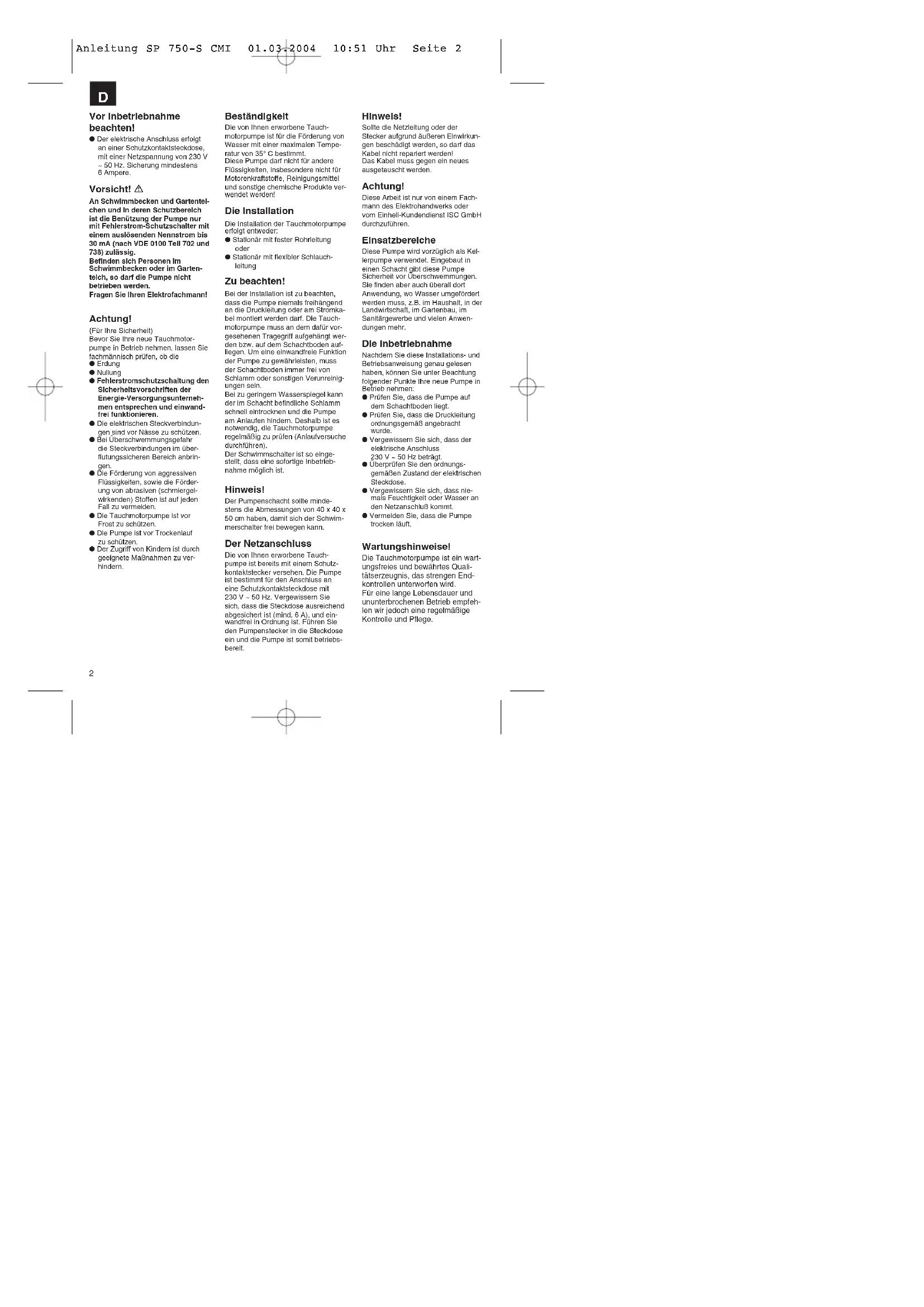 Anleitung SP 750-S CMI 01.03.2004 10:51 Uhr Seite 12 Vor Inbetriebnahme beachten! ● Der elektrische Anschluss erfolgtan einer Schutzkontaktsteckdose, mit einer Netzspannung von 230 V ~ 50 Hz. Sicherung mindestens 6 Ampere. Vorsicht! An Schwimmbecken und Gartentei-chen und in deren Schutzbereichist die Benützung der Pumpe nurmit Fehlerstrom-Schutzschalter miteinem auslösenden Nennstrom bis30 mA (nach VDE 0100 Teil 702 und738) zulässig.Befinden sich Personen imSchwimmbecken oder im Garten-teich, so darf die Pumpe nichtbetrieben werden.Fragen Sie Ihren Elektrofachmann! Achtung! (Für Ihre Sicherheit) Bevor Sie Ihre neue Tauchmotor-pumpe in Betrieb nehmen, lassen Siefachmännisch prüfen, ob die● Erdung● Nullung● Fehlerstromschutzschaltung denSicherheitsvorschriften derEnergie-Versorgungsunterneh-men entsprechen und einwand-frei funktionieren.● Die elektrischen Steckverbindun-gen sind vor Nässe zu schützen.● Bei Überschwemmungsgefahr die Steckverbindungen im über-flutungssicheren Bereich anbrin- gen. ● Die Förderung von aggressiven Flüssigkeiten, sowie die Förder-ung von abrasiven (schmiergel-wirkenden) Stoffen ist auf jeden Fall zu vermeiden.● Die Tauchmotorpumpe ist vor Frost zu schützen.● Die Pumpe ist vor Trockenlauf zu schützen.● Der Zugriff von Kindern ist durch geeignete Maßnahmen zu ver-hindern. Hinweis! Sollte die Netzleitung oder derStecker aufgrund äußeren Einwirkun-gen beschädigt werden, so darf dasKabel nicht repariert werden!Das Kabel muss gegen ein neuesausgetauscht werden. Achtung! Diese Arbeit ist nur von einem Fach-mann des Elektrohandwerks odervom Einhell-Kundendienst ISC GmbHdurchzuführen. Einsatzbereiche Diese Pumpe wird vorzüglich als Kel-lerpumpe verwendet. Eingebaut ineinen Schacht gibt diese PumpeSicherheit vor Überschwemmungen.Sie finden aber auch überall dortAnwendung, wo Wasser umgefördertwerden muss, z.B. im Haushalt, in derLandwirtschaft, im Gartenbau, imSanitärgewerbe und vielen Anwen-dungen mehr. Die Inbetriebnahme Nachdem Sie diese Installations- undBetriebsanweisung genau gelesenhaben, können Sie unter Beachtungfolgender Punkte Ihre neue Pumpe inBetrieb nehmen:● Prüfen Sie, dass die Pumpe aufdem Schachtboden liegt.● Prüfen Sie, dass die Druckleitungordnungsgemäß angebrachtwurde.● Vergewissern Sie sich, dass derelektrische Anschluss230 V ~ 50 Hz beträgt.● Überprüfen Sie den ordnungs-gemäßen Zustand der elektrischenSteckdose.● Vergewissern Sie sich, dass nie-mals Feuchtigkeit oder Wasser anden Netzanschluß kommt.● Vermeiden Sie, dass die Pumpetrocken läuft. Wartungshinweise! Die Tauchmotorpumpe ist ein wart- ungsfreies und bewährtes Quali- tätserzeugnis, das strengen End- kontrollen unterworfen wird. Für eine lange Lebensdauer und ununterbrochenen Betrieb empfeh- len wir jedoch eine regelmäßige Kontrolle und Pflege. Beständigkeit Die von Ihnen erworbene Tauch-motorpumpe ist für die Förderung vonWasser mit einer maximalen Tempe-ratur von 35° C bestimmt.Diese Pumpe darf nicht für andereFlüssigkeiten, insbesondere nicht fürMotorenkraftstoffe, Reinigungsmittelund sonstige chemische Produkte ver-wendet werden! Die Installation Die Installation der Tauchmotorpumpeerfolgt entweder:● Stationär mit fester Rohrleitung oder ● Stationär mit flexibler Schlauch-leitung Zu beachten! Bei der Installation ist zu beachten,dass die Pumpe niemals freihängendan die Druckleitung oder am Stromka-bel montiert werden darf. Die Tauch-motorpumpe muss an dem dafür vor-gesehenen Tragegriff aufgehängt wer-den bzw. auf dem Schachtboden auf-liegen. Um eine einwandfreie Funktionder Pumpe zu gewährleisten, mussder Schachtboden immer frei vonSchlamm oder sonstigen Verunreinig-ungen sein. Bei zu geringem Wasserspiegel kannder im Schacht befindliche Schlammschnell eintrocknen und die Pumpeam Anlaufen hindern. Deshalb ist esnotwendig, die Tauchmotorpumperegelmäßig zu prüfen (Anlaufversuchedurchführen).Der Schwimmschalter ist so einge-stellt, dass eine sofortige Inbetrieb-nahme möglich ist. Hinweis! Der Pumpenschacht sollte minde-stens die Abmessungen von 40 x 40 x50 cm haben, damit sich der Schwim-merschalter frei bewegen kann. Der Netzanschluss Die von Ihnen erworbene Tauch-pumpe ist bereits mit einem Schutz-kontaktstecker versehen. Die Pumpeist bestimmt für den Anschluss aneine Schutzkontaktsteckdose mit 230 V ~ 50 Hz. Vergewissern Siesich, dass die Steckdose ausreichendabgesichert ist (mind. 6 A), und ein-wandfrei in Ordnung ist. Führen Sieden Pumpenstecker in die Steckdoseein und die Pumpe ist somit betriebs-bereit.
