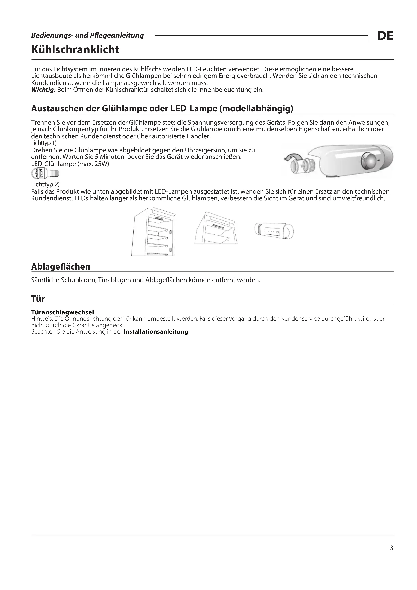 Bedienungs- und Pflegeanleitung Kühlschranklicht Für das Lichtsystem im Inneren des Kühlfachs werden LED-Leuchten verwendet. Diese ermöglichen eine bessere Lichtausbeute als herkömmliche Glühlampen bei sehr niedrigem Energieverbrauch. Wenden Sie sich an den technischen Kundendienst, wenn die Lampe ausgewechselt werden muss. Wichtig: Beim Önen der Kühlschranktür schaltet sich die Innenbeleuchtung ein. Austauschen der Glühlampe oder LED-Lampe (modellabhängig) Trennen Sie vor dem Ersetzen der Glühlampe stets die Spannungsversorgung des Geräts. Folgen Sie dann den Anweisungen, je nach Glühlampentyp für Ihr Produkt. Ersetzen Sie die Glühlampe durch eine mit denselben Eigenschaften, erhältlich über den technischen Kundendienst oder über autorisierte Händler. Lichttyp 1) Drehen Sie die Glühlampe wie abgebildet gegen den Uhrzeigersinn, um sie zu entfernen. Warten Sie 5Minuten, bevor Sie das Gerät wieder anschließen. LED-Glühlampe (max. 25W) Lichttyp 2) Falls das Produkt wie unten abgebildet mit LED-Lampen ausgestattet ist, wenden Sie sich für einen Ersatz an den technischen Kundendienst. LEDs halten länger als herkömmliche Glühlampen, verbessern die Sicht im Gerät und sind umweltfreundlich. Ablageächen Sämtliche Schubladen, Türablagen und Ablageächen können entfernt werden. Tür Türanschlagwechsel Hinweis: Die Önungsrichtung der Tür kann umgestellt werden. Falls dieser Vorgang durch den Kundenservice durchgeführt wird, ist er nicht durch die Garantie abgedeckt.Beachten Sie die Anweisung in der Installationsanleitung.4 Bedienungs- und Pflegeanleitung Bedienung des Gerätes Erster Gebrauch Warten Sie mindestens zwei Stunden nach der Installation, bevor Sie das Gerät an das Stromnetz anschließen. Schließen Sie das Gerät an das Stromnetz an. Es startet automatisch. Die idealen Temperaturen zur Lagerung von Lebensmitteln sind ab Werk voreingestellt. Nach dem Einschalten des Geräts müssen Sie 4-6Stunden warten, bis die korrekte Lagertemperatur für ein normal befülltes Gerät erreicht ist. Platzieren Sie den antibakteriellen Geruchslter wie auf der Filterverpackung dargestellt im Lüfter (falls vorhanden). Wenn das akustische Signal ertönt, bedeutet dies, dass der Temperaturalarm ausgelöst wurde: Zum Abschalten des akustischen Alarms die Taste drücken. Kühlfach und Lagerung von Lebensmitteln Im Kühlfach können frische Lebensmittel und Getränke aufbewahrt werden. Das Kühlfach taut vollautomatisch ab. Gelegentlich auf der Innenrückwand des Kühlfachs auftauchende Wassertropfen weisen auf die automatische Abtauphase hin. Das Tauwasser läuft automatisch durch eine Abussönung in einen Behälter, in dem es verdampft. Hinweis: Umgebungstemperatur, Häugkeit der Türönung und Aufstellungsort des Geräts können die Innentemperatur in den beiden Fächern beeinussen. Beachten Sie diese Faktoren bei der Temperatureinstellung. Unter sehr feuchten Umgebungsbedingungen kann sich Kondenswasser im Kühlfach bilden, vor allem auf den Glasablagen. In diesem Fall empehlt es sich, Behälter mit Flüssigkeiten abzudecken (z.B. ein Topf mit Brühe), Lebensmittel mit hohem Flüssigkeitsgehalt (z.B. Gemüse) einzuwickeln, und den Lüfter einzuschalten (falls vorhanden). Sämtliche Schubladen, Türablagen und Ablageächen können entfernt werden. Belüftung Die Belüftung ermöglicht eine bessere Temperaturverteilung in den Fächern und somit bessere Lebensmittelkonservierung und Verringerung der überschüssigen Feuchtigkeit. Blockieren Sie den Lüfterbereich nicht. Aufbewahren von frischen Lebensmitteln und Getränken Lebensmittel, die eine große Menge an Ethylengas abgeben (Äpfel, Aprikosen, Birnen, Prsiche, Avokado, Feigen, Paumen, Heidelbeeren, Melonen, Bohnen) und solche, die empndlich darauf reagieren, wie Obst, Gemüse und Salat, müssen immer getrennt voneinander oder verpackt aufbewahrt werden, um die Lagerzeit nicht zu verkürzen; bewahren Sie zum Beispiel keine Tomaten mit Kiwi oder Kohl zusammen auf. Lagern Sie Lebensmittel nicht zu nah aneinander, um ausreichende Luftzirkulation zu ermöglichen. Wenn Sie es bevorzugen, Ihre Lebensmittel einzupacken, verwenden Sie hierfür bitte Behälter aus recyceltem Kunststo, Metall, Aluminium und Glas sowie Frischhaltefolie. Wenn Sie eine geringe Menge an Lebensmitteln im Kühlschrank aufbewahren möchten, empfehlen wir die Verwendung der Regale über dem Obst- und Gemüsefach, da es sich hierbei um den kältesten Bereich im Kühlschrankinneren handelt. Verwenden Sie stets verschlossene Behälter für Flüssigkeiten sowie für Lebensmittel, die zu Geruchsbildung führen oder hierdurch verderben können bzw. bei denen es zu Geschmacksübertragung kommen kann, oder decken Sie diese ab. Verwenden Sie den Flaschenhalter (modellabhängig erhältlich), um ein Umkippen von Flaschen zu vermeiden.