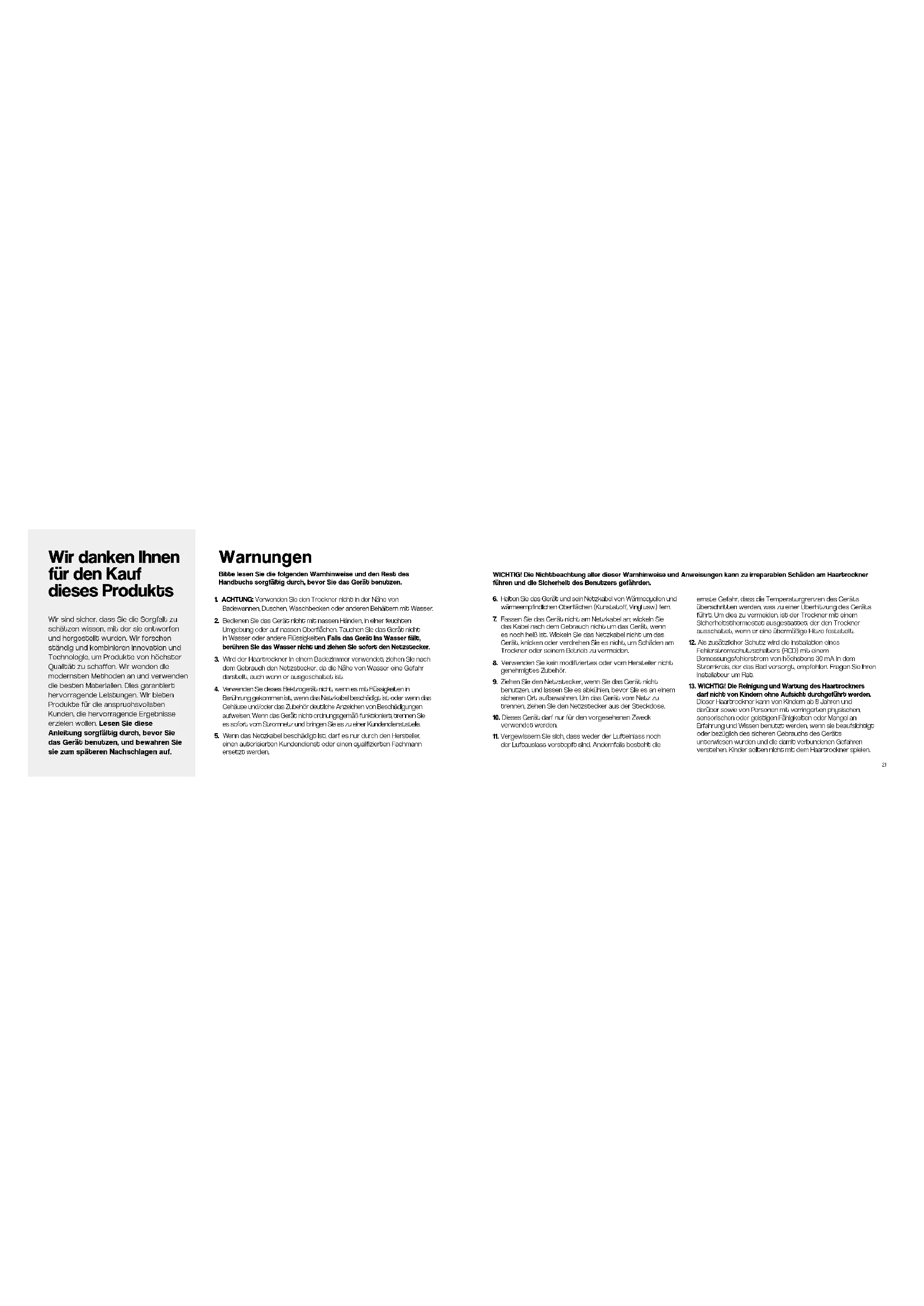 - Wenn Sie den Diffusor auf die Düse setzen, hilft er, das Haar sanft zu trocknen. Anweisungen für den Gebrauch Wenn der Haartrockner aus irgendeinem Grund nicht mehr funktioniert, schalten Sie ihn sofort aus und lassen Sie ihn abkühlen. Wenn Sie das Gerät nicht mehr benutzen, schalten Sie es mit dem Schalter aus und ziehen Sie den Stecker aus der Steckdose.