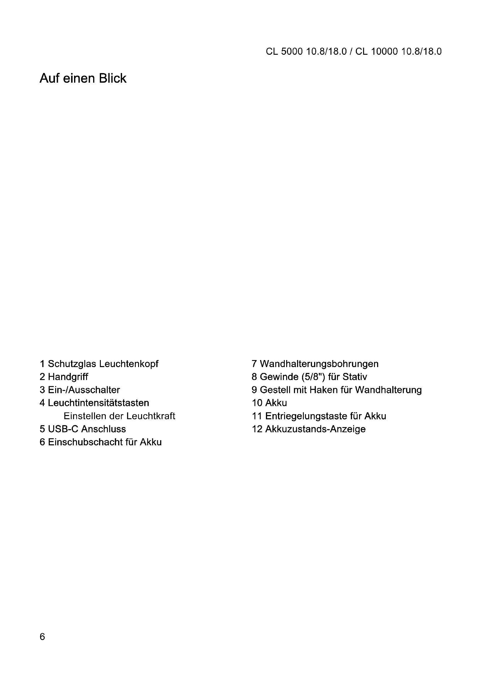 Auf einen Blick 1 Schutzglas Leuchtenkopf 2 Handgriff 3 Ein-/Ausschalter 4 Leuchtintensitätstasten Einstellen der Leuchtkraft 5 USB-C Anschluss 6 Einschubschacht für Akku 7 Wandhalterungsbohrungen 8 Gewinde (5/8") für Stativ 9 Gestell mit Haken für Wandhalterung 10 Akku 11 Entriegelungstaste für Akku 12 Akkuzustands-AnzeigeCL 5000 10.8/18.0 / CL 10000 10.8/18.0