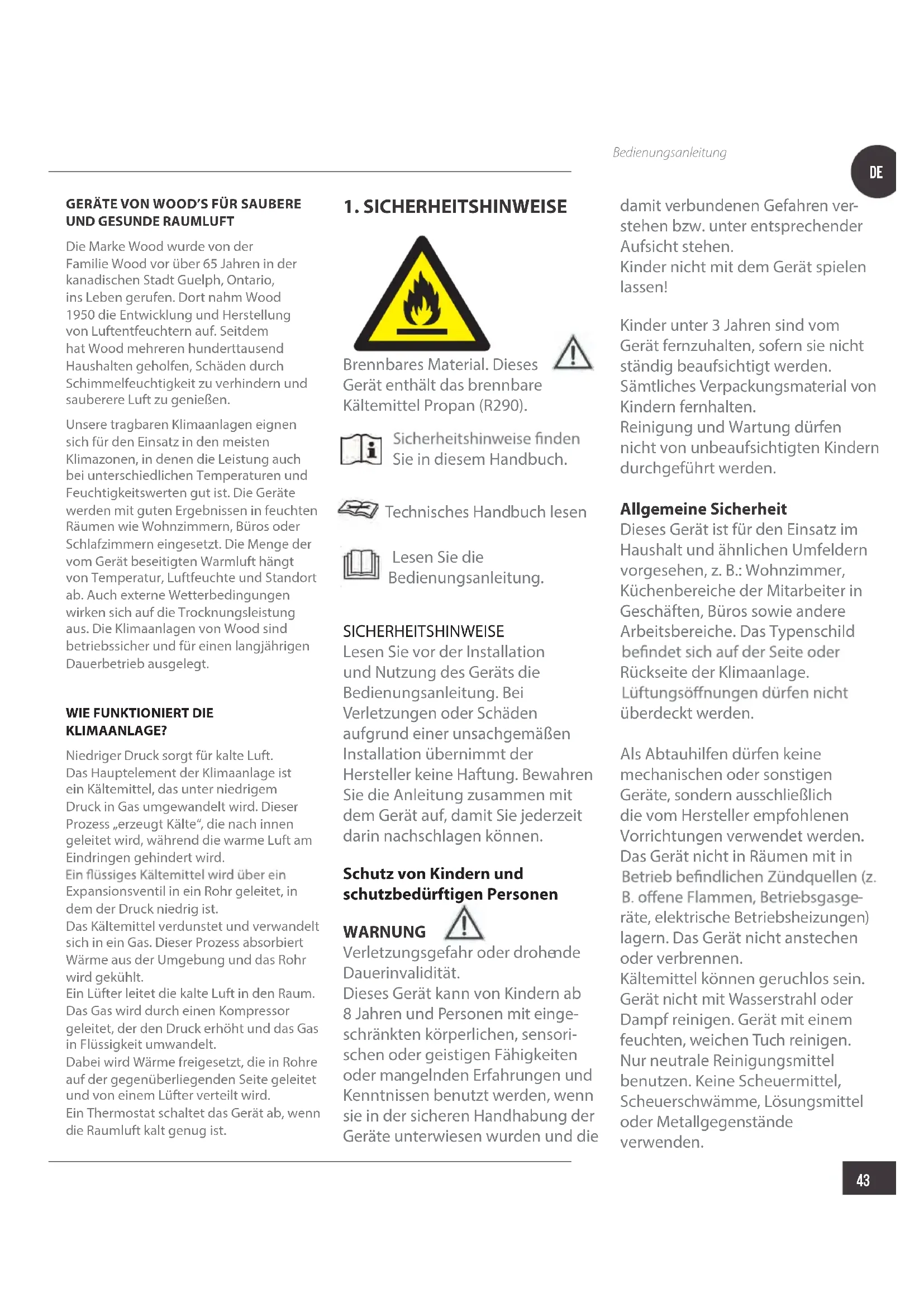 Brennbares Material. Dieses Gerät enthält das brennbare Kältemittel Propan (R290). Sie in diesem Handbuch. Technisches Handbuch lesen Lesen Sie die Bedienungsanleitung. SICHERHEITSHINWEISE Lesen Sie vor der Installation und Nutzung des Geräts die Bedienungsanleitung. Bei Verletzungen oder Schäden aufgrund einer unsachgemäßen Installation übernimmt der Hersteller keine Haftung. Bewahren Sie die Anleitung zusammen mit dem Gerät auf, damit Sie jederzeit darin nachschlagen können. Schutz von Kindern und schutzbedürftigen Personen WARNUNG Verletzungsgefahr oder drohe nde Dauerinvalidität. Dieses Gerät kann von Kindern ab 8 Jahren und Personen mit einge- schränkten körperlichen, sensori- schen oder geistigen Fähigkeiten oder mangelnden Erfahrungen und Kenntnissen benutzt werden, wenn sie in der sicheren Handhabung der Geräte unterwiesen wurden und die damit verbundenen Gefahren ver- stehen bzw. unter entsprechender Aufsicht stehen. Kinder nicht mit dem Gerät spielen lassen! Kinder unter 3 Jahren sind vom Gerät fernzuhalten, sofern sie nicht ständig beaufsichtigt werden.