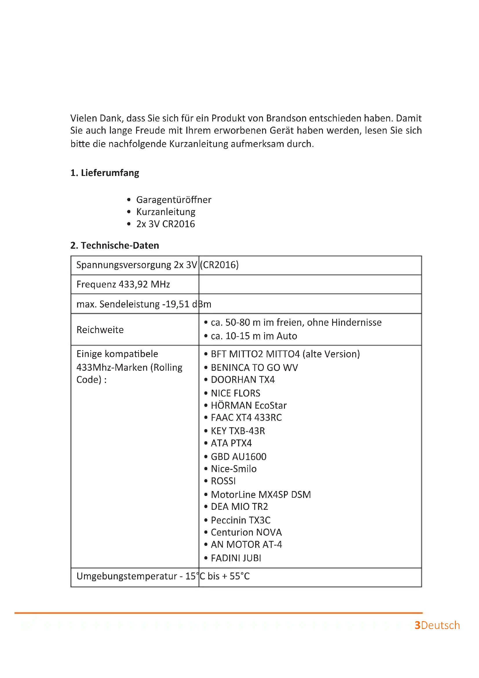 - ca. 10-15 m im Auto Einige kompabele 433Mhz-Marken (Rolling Code) :