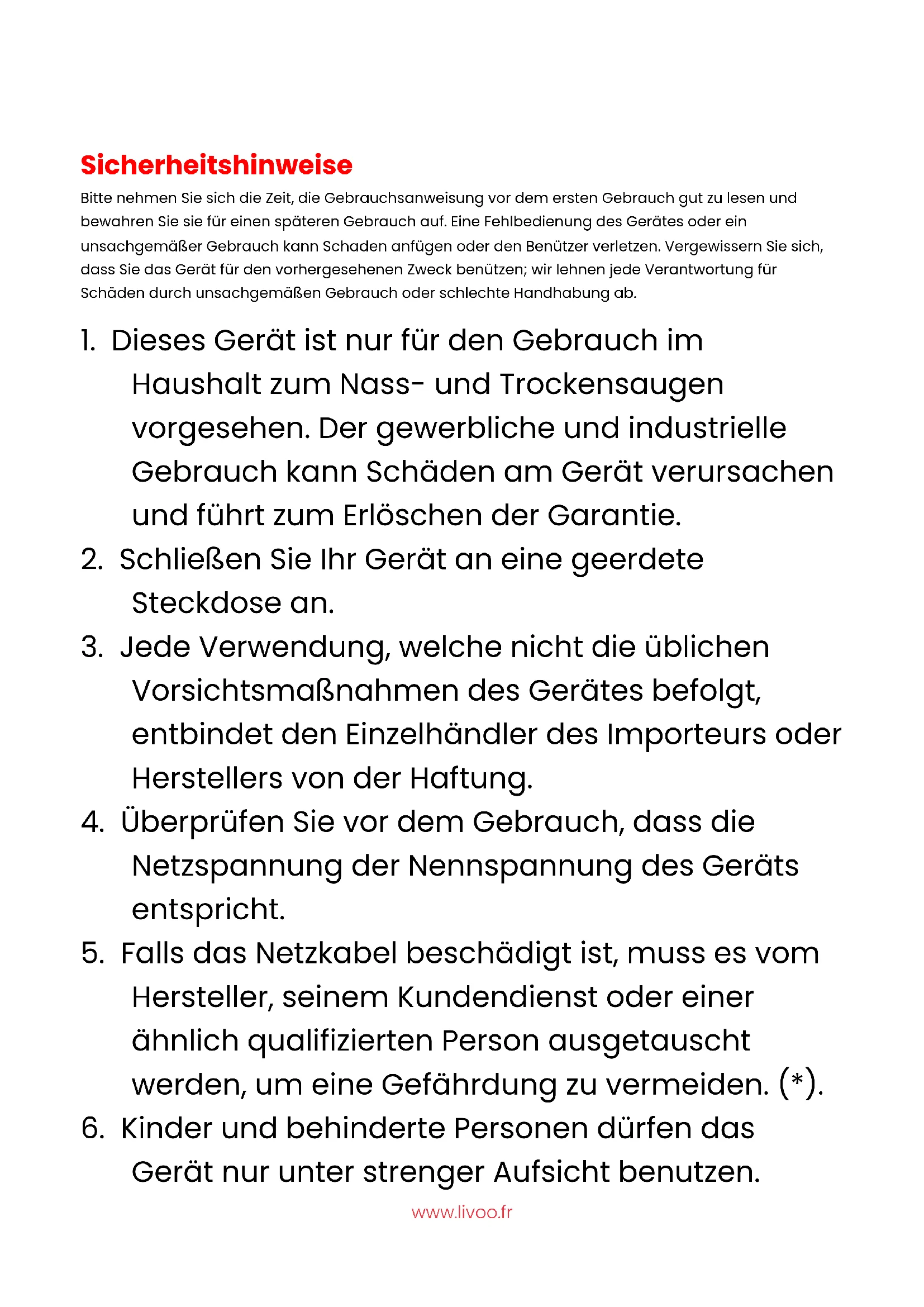 Verwendung des Gerätes Zusammenbau Achten Sie darauf, dass der -Filter bzw. das schwarze grobmaschige Netz ordnungsgemäß angebracht sind (Abb. 3). Bringen Sie den Kopf am Tank an. Um den flexiblen Schlauch zu verwenden, stecken Sie das Ende des Schlauchs in die Saugöffnung am Tank (Abb. 3). Vergewissern Sie sich, dass er in der Position einrastet. Befestigen Sie den Schlauch. Wählen Sie das gewünschte Zubehör (Bürste oder Düse) und befestigen Sie es an der Saugöffnung (Abb. 1 und 2). Trockensaugen: Arbeiten Sie beim Trockensaugen stets mit einem angebrachten -Filter. Nehmen Sie das Motorgehäuse ab. Falten Sie den Papiersaugbeutel auseinander und setzen Sie ihn ein (Abb. 4). Passen Sie die Bodenbürste auf Hartbodenoberfläche oder Teppichboden an, indem Sie den Hebel nach vorne oder hinten legen. Verwenden Sie die Fugendüse zur Reinigung von Kanten, Fugen, Heizungen usw. Schieben Sie die Abdeckung der Saugkraftreglers zurück (minimale Saugkraft) und nach vorne (maximale Saugkraft), um die geeignete Saugkraft für die unterschiedlichen Oberfläche einzustellen. Wickeln Sie das Netzkabel ab. Stecken Sie den Stecker in die Steckdose und schalten Sie das Gerät ein. Nasssaugen: Nehmen Sie den -Filter ab, entfernen Sie den Papiersaugbeutel und setzen Sie das schwarze grobmaschige Netz ein (Abb. 5 & 6), wenn Sie viel Wasser einsaugen müssen. Fahren Sie dann wie oben beschrieben fort. Hinweis: Saugen Sie niemals ohne das schwarze grobmaschige Netz. Fassen Sie niemals in das Wasser, das eingesaugt wird. Es besteht Stromschlaggefahr. Gebläsefunktion Es wird der Betrieb ohne -Filter empfohlen. Schließen Sie den Saugschlauch (7) an den Blasanschluss (4) am Motorgehäuse an. Bringen Sie die notwendigen Zubehörteile am Saugschlauch an, mit Ausnahme der umschaltbaren Bodenbürste. Fahren Sie dann wie oben beschrieben fort. Reinigung und Wartung Ziehen Sie den Gerätestecker von der Steckdose ab. Verwenden Sie ein feuchtes Tuch zur Reinigung des Gerätegehäuses. Verwenden Sie dafür keine Lösungsmittel oder Benzin, da dies zu Rissen oder Ausbleichen führen kann. Leeren Sie nach dem Gebrauch den Tank. Nehmen Sie das Motorgehäuse (Deckel) ab. Gießen Sie die flüssigen Rückstande aus. Für trockenen Staub, folgen Sie den gleichen Schritten wie oben angegeben. Reinigen Sie den Schmutzwassertank mit einem feuchten Tuch. Entnehmen Sie dann den -Filter bzw. das schwarze, grobmaschige Netz. Waschen Sie diese mit Wasser und Seife und lassen Sie sie trocknen. Ersetzen Sie den Papiersaugbeutel, wenn dieser voll ist. Halten Sie das Gerät in trockener Umgebung.www.livoo.fr Korrekte Entsorgung des Geräts (Electrical and Electronic Equipment) (Gültig in der Europäischen Union und dem Rest Europas, dass die Länder einem separaten Sammelsystem eingeführt haben). Die europäische Richtlinie 2012/19/EU über Elektro-und Elektronik-Altgeräte (WEEE), in Verbindung bleiben Das alte elektrische Haushaltsgeräte dürfen nicht über den normalen Hausmüll entsorgt werden. Altgeräte müssen separat gesammelt werden, um die Wiederverwertung und das Recycling der beinhalteten Materialien zu optimieren und die Auswirkungen auf die menschliche Gesundheit und die Umwelt. Das Symbol der durchgestrichenen Mülltonne auf alle Produkte gekennzeichnet, die aus der getrennten Sammlung zu erinnern. Die Verbraucher sollten ihre Kontaktdaten lokalen Behörden oder Ihren Händler für Informationen über die korrekte Entsorgung ihrer Produkte.