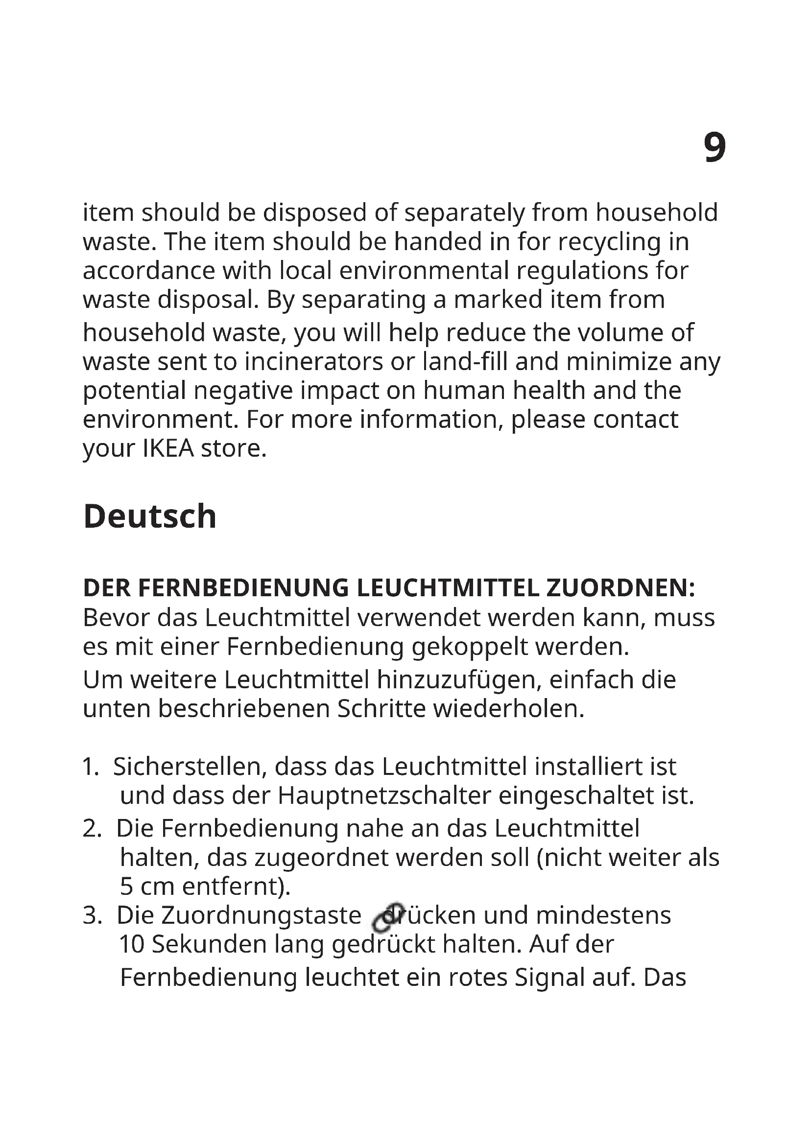 Den Netzschalter 6-mal ein- und ausschalten.12 TECHNISCHE DATEN Betriebsfrequenz: 2405-2480 Mhz Ausgangsleistung: 10 dBm Hersteller: IKEA of Sweden AB Adresse: Box 702, S 343 81 Älmhult, SCHWEDEN Das Symbol mit der durchgestrichenen Abfalltonne bedeutet, dass das Produkt getrennt vom Haushaltsabfall entsorgt werden muss. Das Produkt muss gem. der örtlichen Entsorgungsvorschriften der Wiederverwertung zugeführt werden. Durch separate Entsorgung des Produkts trägst du zur Minderung des Verbrennungs- oder Deponieabfalls bei und reduzierst eventuelle negative Einwirkungen auf die menschliche Gesundheit und die Umwelt. Weitere Informationen im IKEA Einrichtungshaus.13 Français