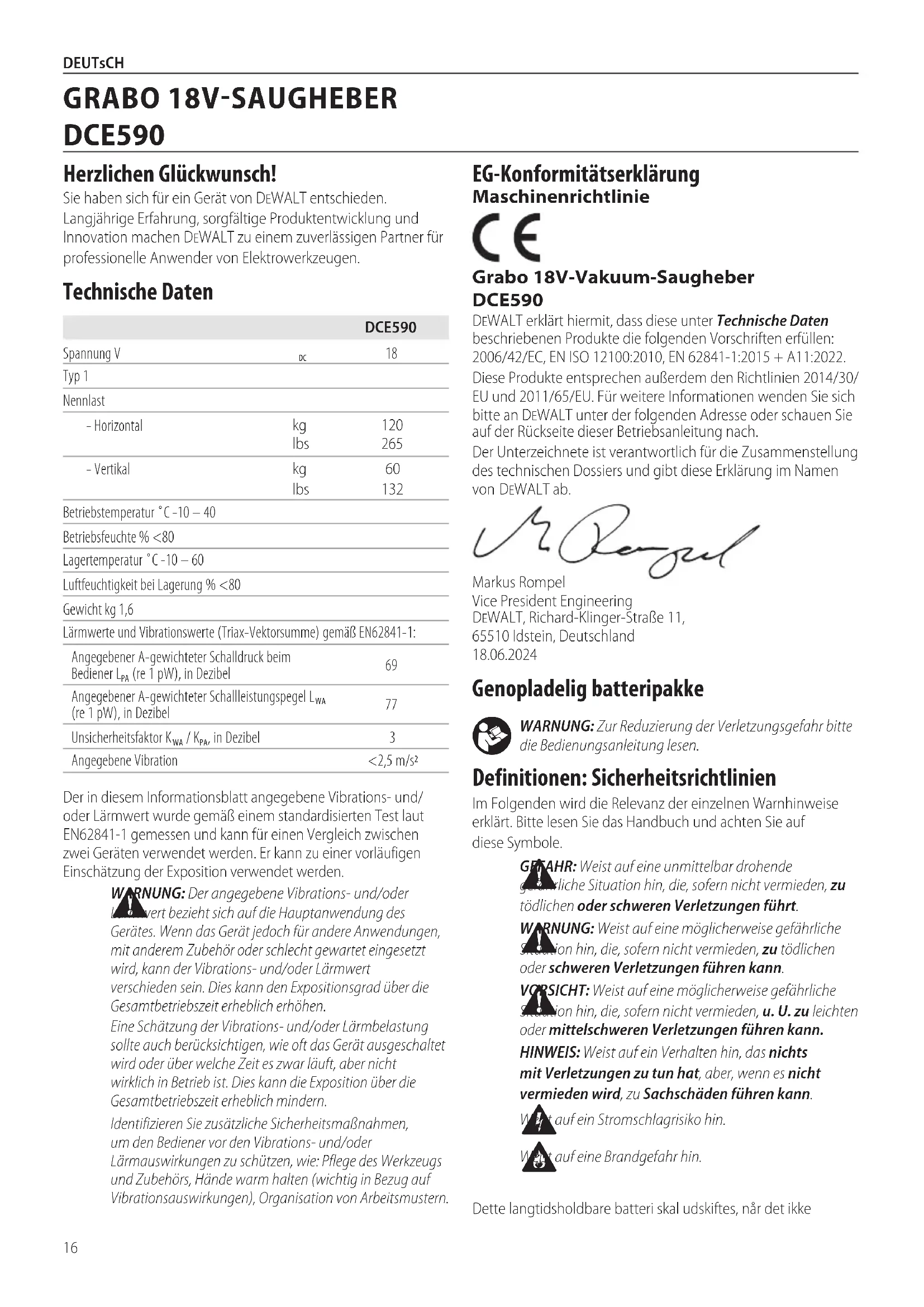 DEUTsCH Genopladelig batteripakke Dette langtidsholdbare batteri skal udskiftes, når det ikke WARNUNG: Zur Reduzierung der Verletzungsgefahr bitte die Bedienungsanleitunglesen. Definitionen: Sicherheitsrichtlinien Im Folgenden wird die Relevanz der einzelnen Warnhinweise erklärt. Bitte lesen Sie das Handbuch und achten Sie auf dieseSymbole. GEFAHR: Weist auf eine unmittelbar drohende gefährliche Situation hin, die, sofern nicht vermieden, zu tödlichen oder schweren Verletzungenführt. WARNUNG: Weist auf eine möglicherweise gefährliche Situation hin, die, sofern nicht vermieden, zu tödlichen oder schweren Verletzungen führenkann. VORSICHT: Weist auf eine möglicherweise gefährliche Situation hin, die, sofern nicht vermieden, u. U. zu leichten oder mittelschweren Verletzungen führenkann. HINWEIS: Weist auf ein Verhalten hin, das nichts mit Verletzungen zu tun hat, aber, wenn es nicht vermieden wird, zu Sachschäden führenkann. Weist auf ein Stromschlagrisikohin. Weist auf eine Brandgefahrhin. EG-Konformitätserklärung Maschinenrichtlinie Grabo 18V-Vakuum-Saugheber DCE590 DeWALT erklärt hiermit, dass diese unter Technische Daten beschriebenen Produkte die folgenden Vorschriften erfüllen: 2006/42/EC, EN ISO 12100:2010, EN 62841-1:2015 + A11:2022.Diese Produkte entsprechen außerdem den Richtlinien 2014/30/EU und 2011/65/EU. Für weitere Informationen wenden Sie sich bitte an DeWALT unter der folgenden Adresse oder schauen Sie auf der Rückseite dieser Betriebsanleitung nach.Der Unterzeichnete ist verantwortlich für die Zusammenstellung des technischen Dossiers und gibt diese Erklärung im Namen von DeWALT ab.Markus Rompel Vice President Engineering DeWALT, Richard-Klinger-Straße 11, 65510 Idstein, Deutschland 18.06.2024Der in diesem Informationsblatt angegebene Vibrations- und/oder Lärmwert wurde gemäß einem standardisierten Test laut 62841-1 gemessen und kann für einen Vergleich zwischen zwei Geräten verwendet werden. Er kann zu einer vorläufigen Einschätzung der Exposition verwendetwerden. WARNUNG: Der angegebene Vibrations- und/oder Lärmwert bezieht sich auf die Hauptanwendung des Gerätes. Wenn das Gerät jedoch für andere Anwendungen, mit anderem Zubehör oder schlecht gewartet eingesetzt wird, kann der Vibrations- und/oder Lärmwert verschieden sein. Dies kann den Expositionsgrad über die Gesamtbetriebszeit erheblicherhöhen.Eine Schätzung der Vibrations- und/oder Lärmbelastung sollte auch berücksichtigen, wie oft das Gerät ausgeschaltet wird oder über welche Zeit es zwar läuft, aber nicht wirklich in Betrieb ist. Dies kann die Exposition über die Gesamtbetriebszeit erheblichmindern.Identifizieren Sie zusätzliche Sicherheitsmaßnahmen, um den Bediener vor den Vibrations- und/oder Lärmauswirkungen zu schützen, wie: Pflege des Werkzeugs und Zubehörs, Hände warm halten (wichtig in Bezug auf Vibrationsauswirkungen), Organisation vonArbeitsmustern.DCE590Spannung V