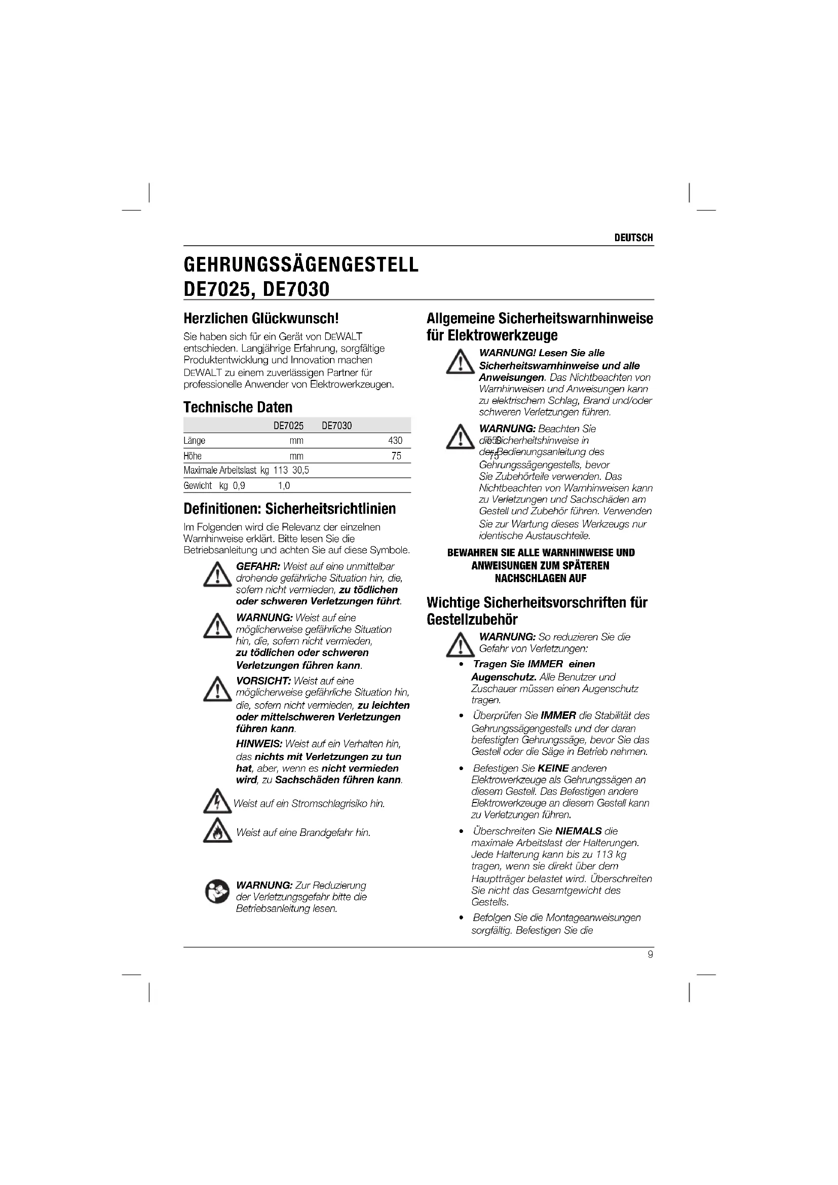 GEHRUNGSSÄGENGESTELL DE7025, DE7030 Herzlichen Glückwunsch! Sie haben sich für ein Gerät von DEWALT entschieden. Langjährige Erfahrung, sorgfältige Produktentwicklung und Innovation machen DEWALT zu einem zuverlässigen Partner für professionelle Anwender von Elektrowerkzeugen. Technische Daten DE7025 DE7030 Länge mm 430 550 Höhe mm 75 75 Maximale Arbeitslast kg 113 30,5 Gewicht kg 0,9 1,0 Defi nitionen: Sicherheitsrichtlinien Im Folgenden wird die Relevanz der einzelnen Warnhinweise erklärt. Bitte lesen Sie die Betriebsanleitung und achten Sie auf diese Symbole. GEFAHR: Weist auf eine unmittelbar drohende gefährliche Situation hin, die, sofern nicht vermieden, zu tödlichen oder schweren Verletzungen führt. WARNUNG: Weist auf eine möglicherweise gefährliche Situation hin, die, sofern nicht vermieden, zu tödlichen oder schweren Verletzungen führen kann. VORSICHT: Weist auf eine möglicherweise gefährliche Situation hin, die, sofern nicht vermieden, zu leichten oder mittelschweren Verletzungen führen kann. HINWEIS: Weist auf ein Verhalten hin, das nichts mit Verletzungen zu tun hat, aber, wenn es nicht vermieden wird, zu Sachschäden führen kann. Weist auf ein Stromschlagrisiko hin. Weist auf eine Brandgefahr hin. WARNUNG: Zur Reduzierung der Verletzungsgefahr bitte die Betriebsanleitung lesen. Allgemeine Sicherheitswarnhinweise für Elektrowerkzeuge WARNUNG! Lesen Sie alle Sicherheitswarnhinweise und alle Anweisungen. Das Nichtbeachten von Warnhinweisen und Anweisungen kann zu elektrischem Schlag, Brand und/oder schweren Verletzungen führen. WARNUNG: Beachten Sie die Sicherheitshinweise in der Bedienungsanleitung des Gehrungssägengestells, bevor Sie Zubehörteile verwenden. Das Nichtbeachten von Warnhinweisen kann zu Verletzungen und Sachschäden am Gestell und Zubehör führen. Verwenden Sie zur Wartung dieses Werkzeugs nur identische Austauschteile.