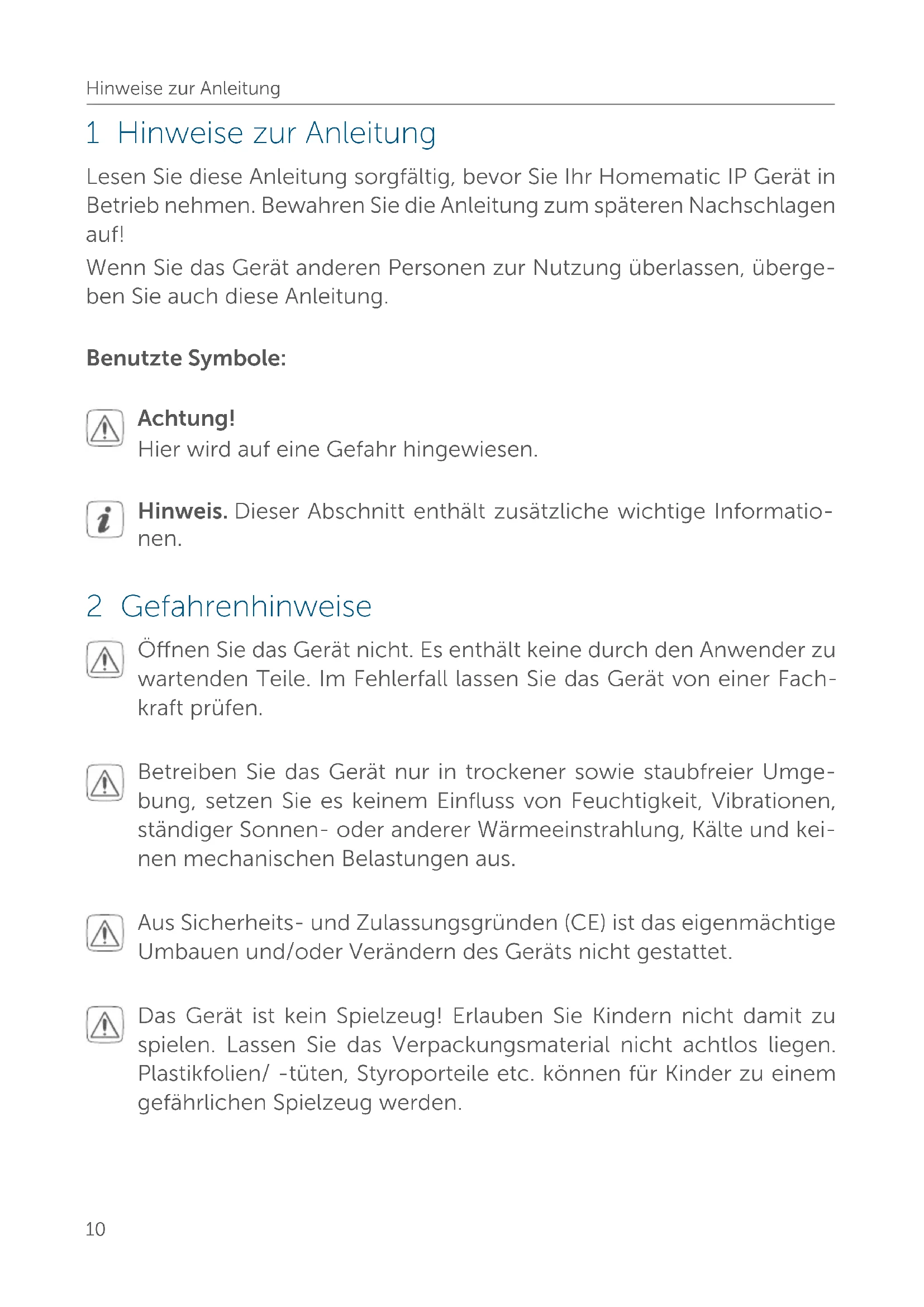 - Lassen Sie die Systemtaste wieder los, um das Wiederherstellen der Werkseinstellungen abzuschließen. Das Gerät führt einen Neustart durch. 11 Wartung und Reinigung Das Gerät ist für Sie bis auf einen eventuell erforderlichen Batterie- wechsel wartungsfrei. Überlassen Sie eine Reparatur einer Fachkraft. Reinigen Sie das Gerät mit einem weichen, sauberen, trockenen und fus- selfreien Tuch. Verwenden Sie keine lösemittelhaltigen Reinigungsmittel, das Kunststogehäuse und die Beschriftung können dadurch angegrien werden.30 Allgemeine Hinweise zum Funkbetrieb 12 Allgemeine Hinweise zum Funkbetrieb Die Funk-Übertragung wird auf einem nicht exklusiven Übertragungsweg realisiert, weshalb Störungen nicht ausgeschlossen werden können. Wei- tere Störeinflüsse können hervorgerufen werden durch Schaltvorgänge, Elektromotoren oder defekte Elektrogeräte. Die Reichweite in Gebäuden kann stark von der im Freifeld abwei- chen. Außer der Sendeleistung und den Empfangseigenschaften der Empfänger spielen Umwelteinflüsse wie Luftfeuchtigkeit neben baulichen Gegebenheiten vor Ort eine wichtige Rolle. Hiermit erklärt die eQ-3 AG, Maiburger Str. 29, 26789 Leer, Deutsch- land, dass der Funkanlagentyp Homematic IP HmIP-eTRV-B-2 der Richtlinie 2014/53/EU entspricht. Der vollständige Text der EU-Kon- formitätserklärung ist unter der folgenden Internetadresse verfügbar: www.homematic-ip.com 13 Technische Daten Geräte-Kurzbezeichnung: HmIP-eTRV-B-2 Versorgungsspannung: 2x 1,5 V LR6/Mignon/AA Stromaufnahme: 100 mA max. Batterielebensdauer: 2 Jahre (typ.) Schutzart: IP20 Verschmutzungsgrad: 2 Umgebungstemperatur: 0 bis 50 °C Abmessungen (B x H x T): 57 x 68 x 102 mm Gewicht: 185 g (inkl. Batterien) Funk-Frequenzband: 868,0-868,6 MHz 869,4-869,65 MHz Max. Funk-Sendeleistung: 10 dBm Empfängerkategorie: SRD category 2 Typ. Funk-Freifeldreichweite: 250 m Duty Cycle: < 1 % pro h/< 10 % pro h31 Technische Daten Software-Klasse: Klasse A Wirkungsweise: Typ 1 Anschluss: M30 x 1,5 mm Stellkraft: > 80 N Ventil-Hub: 4,3 ± 0,3 mm Maximale Hublage: 14,3 ± 0,3 mm Minimale Hublage: 10,0 ± 0,3 mm Technische Änderungen vorbehalten. Entsorgungshinweis Gerät nicht im Hausmüll entsorgen! Elektronische Geräte sind ent- sprechend der Richtlinie über Elektro- und Elektronik-Altgeräte über die örtlichen Sammelstellen für Elektronik-Altgeräte zu entsorgen. Konformitätshinweis Das CE-Zeichen ist ein Freiverkehrszeichen, das sich ausschließlich an die Behörden wendet und keine Zusicherung von Eigenschaften beinhaltet. Bei technischen Fragen zum Gerät wenden Sie sich bitte an Ihren Fachhändler.32 Package contents Quantity Description 1 Homematic IP Radiator Thermostat – basic 1 Danfoss RA adapter 1 Support ring 1 Nut M4 1 Cylinder head screw M4 x 12 mm 2 1.5 V LR6/mignon/AA batteries 1 User manual 1 Supplement sheet with safety instructions Documentation © 2022 eQ-3 AG, Germany All rights reserved. Translation from the original version in German. This manual may not be reproduced in any format, either in whole or in part, nor may it be duplicated or edited by electronic, mechanical or chemical means, without the written consent of the publisher. Typographical and printing errors cannot be excluded. However, the information con- tained in this manual is reviewed on a regular basis and any necessary corrections will be implemented in the next edition. We accept no liability for technical or typographical errors or the consequences thereof. All trademarks and industrial property rights are acknowledged. Printed in Hong Kong Changes may be made without prior notice as a result of technical advances. 157367 (web) Version 1.1 (12/2022)33 Table of contents 1 Information about this manual ............................................................ 34 2 Hazard information ................................................................................ 34 3 Function and device overview ..............................................................35 4 General system information ................................................................. 36 5 Start-up ......................................................................................................37