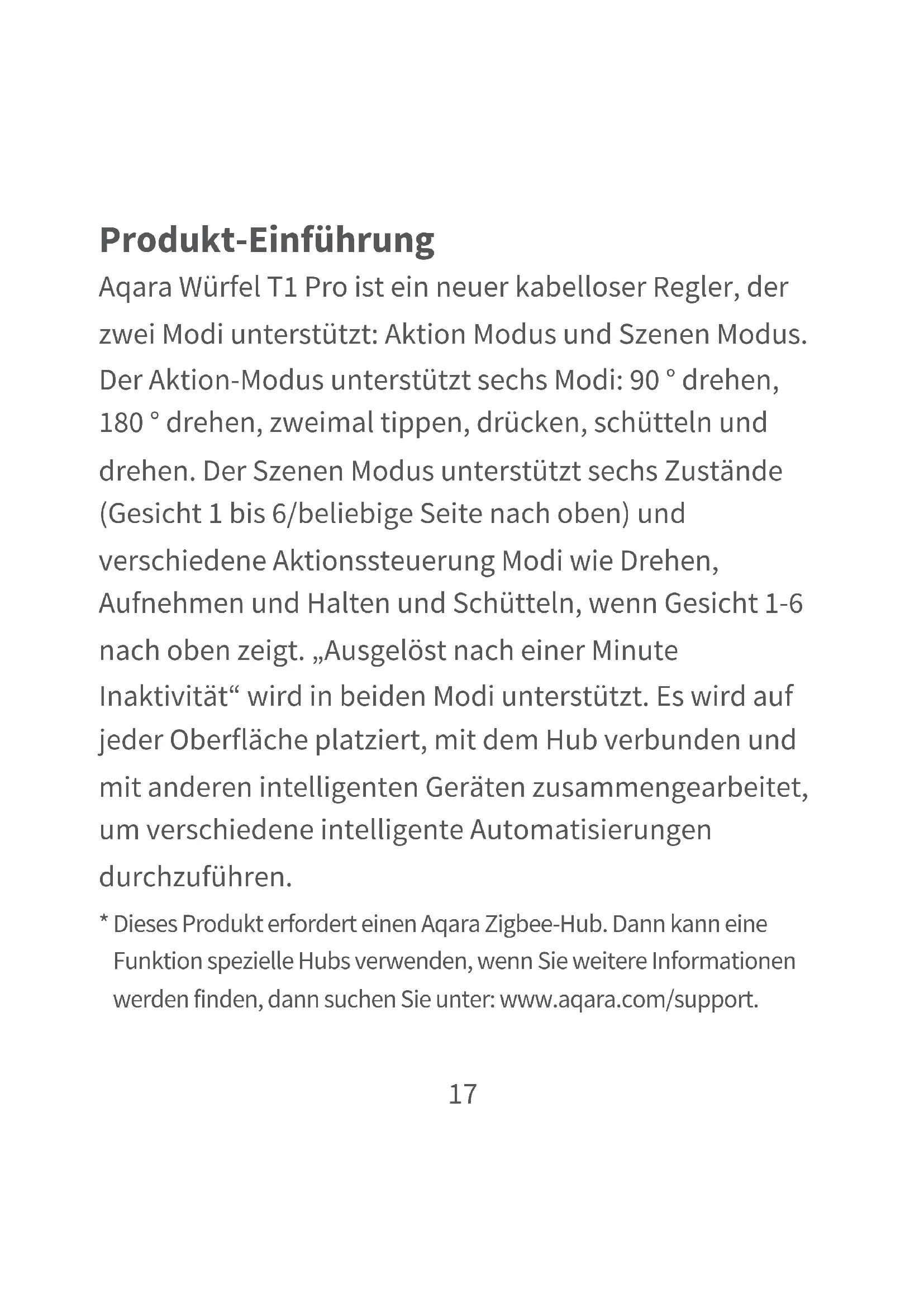This device contains licence-exempt transmitter(s)/re- $1 -Ѱ.ѱ/#/*(+'42$/#))*1/$*)я$ ) ) Economic Development Canada’s licence-exempt RSS(s). Operation is subject to the following two conditions: (1) This device may not cause interference. (2) This device must accept any interference, including interference that may cause undesired operation of the device. This Class B digital apparatus complies with Canadian ‐003. This device complies with RSS‐ФЦЩ*!)0./-4)ю Operation is subject to the condition that this device does not cause harmful interference. # '$($/*!$.УюШѶ&"*1 -У"-(*!/$..0 !*- use against the body. The highest SAR value reported under this standard during product certification when properly worn on the body is 0.17W/kg,This device was 15*Please read this manual carefully and keep it in a safe place. Ѻ!) ..-4я/# *)/ )/.*!/#$.()0'2$'' (*$!$ *-%0./ without special notice. tested for typical body-worn operations with the edge of the device kept 0mm from the body. )/*" //# $" )./''* *)/# './+" *! the manual. 16* Dieses Produkt erfordert einen Aqara Zigbee-Hub. Dann kann eine 0)&/$*).+ 5$ '' 0.1 -2 ) )я2 ))$ 2 $/ - )!*-(/$*) ) werden finden, dann suchen Sie unter: www.aqara.com/support. Aqara Würfel T1 Pro ist ein neuer kabelloser Regler, der zwei Modi unterstützt: Aktion Modus und Szenen Modus. -&/$*)ѣ*0.0)/ -./ƕ/5/. #.*$ѐЫТٺ- # )я УЪТٺ- # )я52 $('/$++ )я-ƕ& )я.#ƕ// ')0) drehen. Der Szenen Modus unterstützt sechs Zustände (Gesicht 1 bis 6/beliebige Seite nach oben) und verschiedene Aktionssteuerung Modi wie Drehen, Aufnehmen und Halten und Schütteln, wenn Gesicht 1-6 nach oben zeigt. „Ausgelöst nach einer Minute )&/$1$/ü/ћ2$-$) $ )*$0)/ -./ƕ/5/ю.2$-0! jeder Oberfläche platziert, mit dem Hub verbunden und mit anderen intelligenten Geräten zusammengearbeitet, um verschiedene intelligente Automatisierungen durchzuführen. Produkt-Einführung