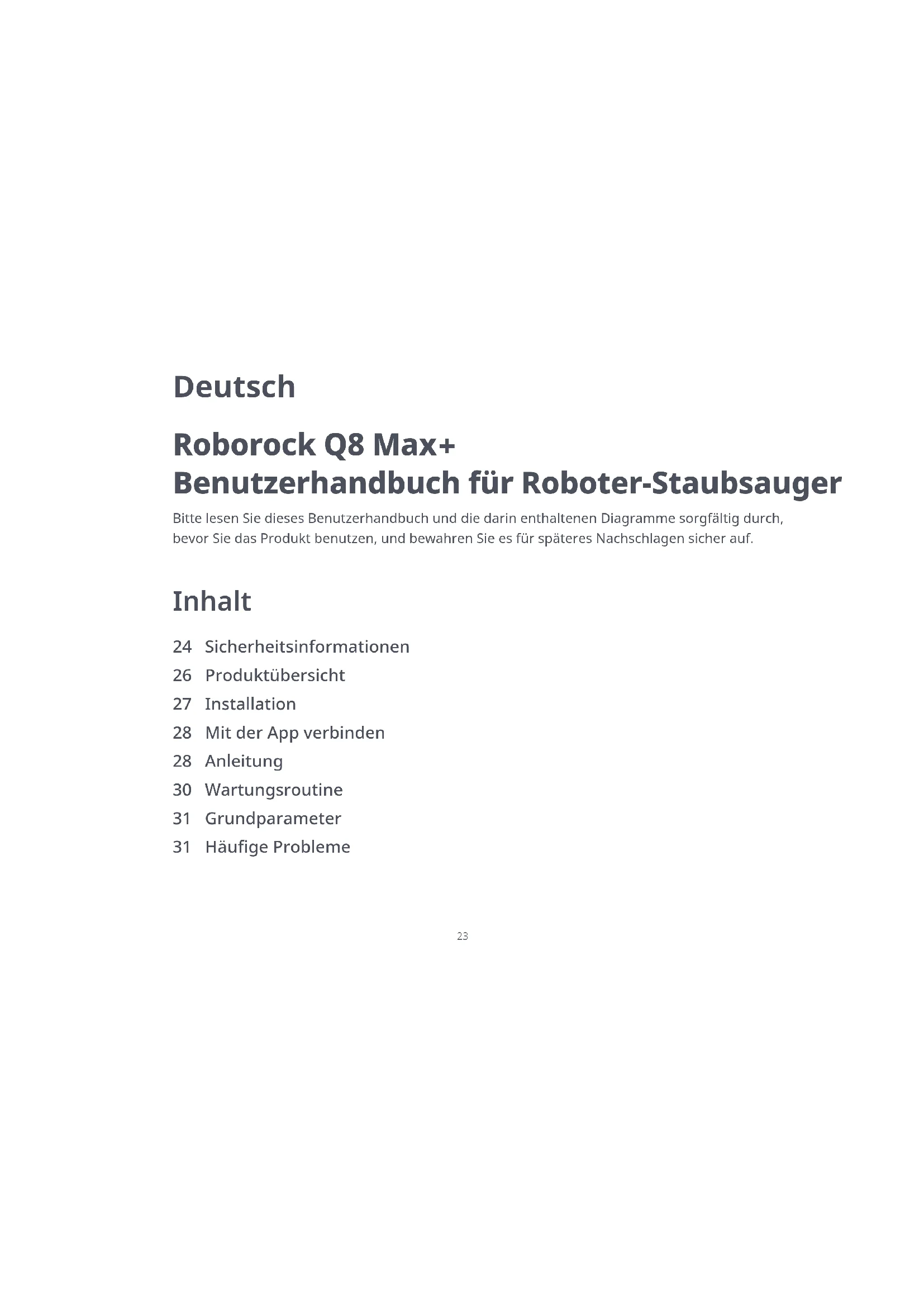 Benutzerhandbuch für Roboter-Staubsauger Inhalt Deutsch 24 Sicherheitsinformationen 26 Produktübersicht 27 Installation 28 Mit der App verbinden 28 Anleitung 30 Wartungsroutine 31 Grundparameter 31 Häufige Probleme24 Einschränkungen