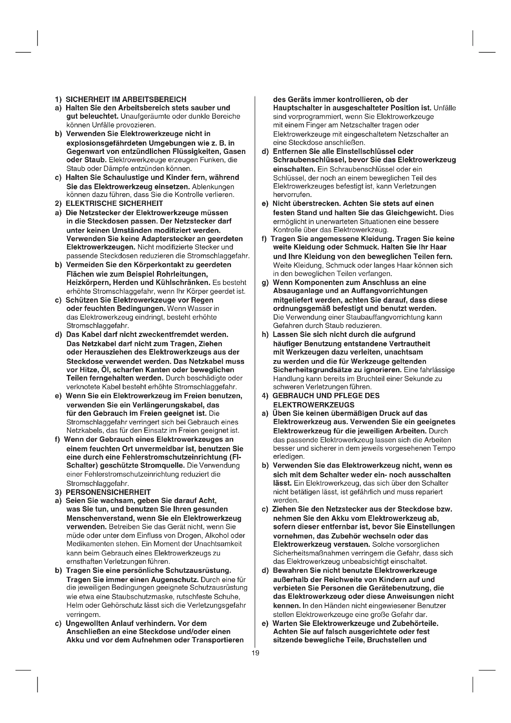 ELEKTROWERKZEUGEN - WARNUNG Beachten Sie alle Warnhinweise, Anweisungen, Abbildungen und technischen Daten, die diesem Elektrowerkzeug beigefügt sind. Die Nichtbeachtung der unten aufgeführten Anweisungen kann zu Stromschlägen, Bränden und/oder schweren Verletzungen führen. Bewahren Sie alle Warn- und Bedienhinweise für Nachschlagezwecke auf. Unter den Begri „Elektrowerkzeug“ in den Warnhinweisen fallen netzbetriebene (d. h. kabelgebundene) oder akkubetriebene (d.h. kabellose) Elektrowerkzeuge. ventilation H2) ! retirez la batterie de l’outil avant de procéder au nettoyage