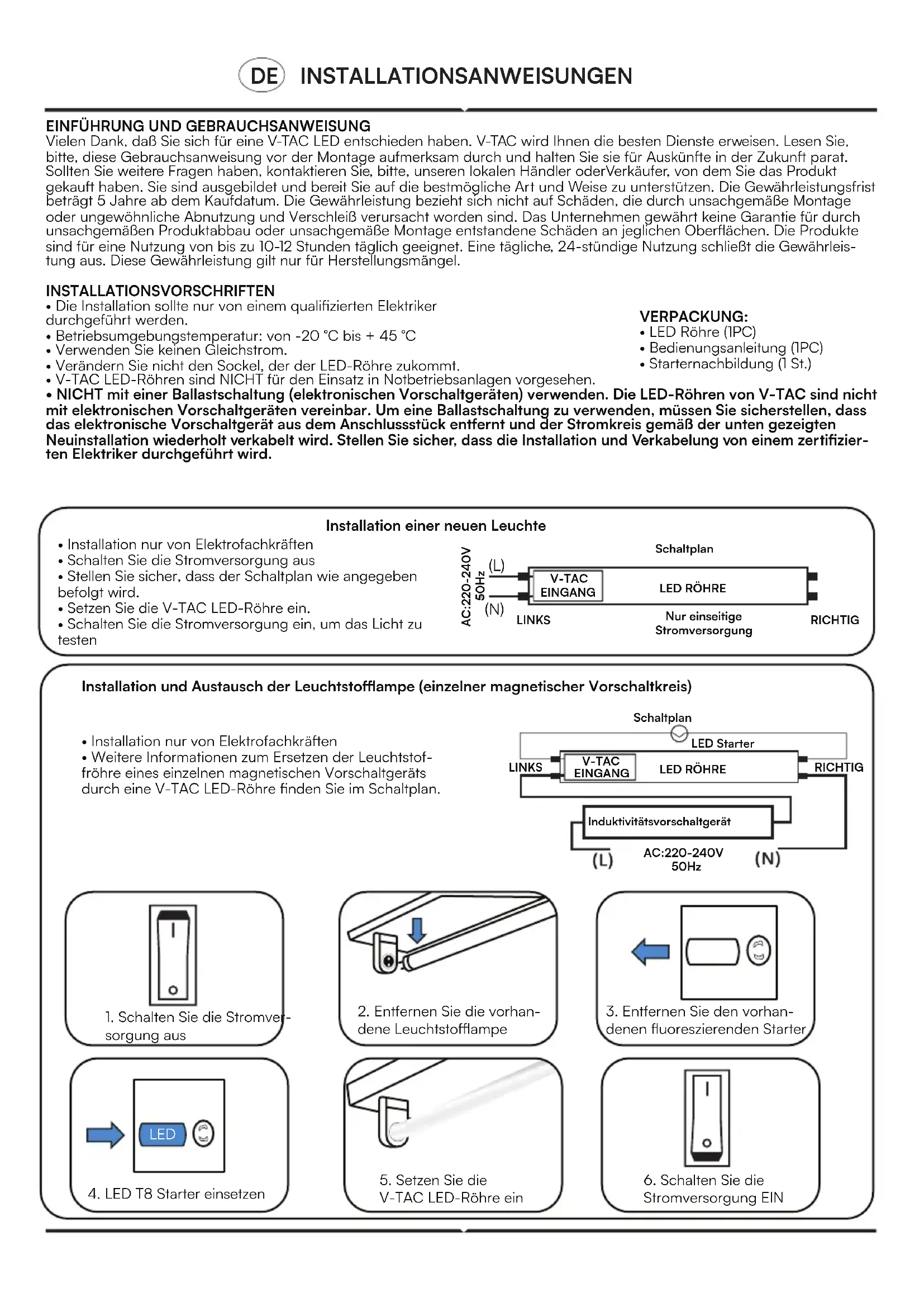 - Do NOT use with electronic ballasts. V-TAC LED tubes are not compatible with electronic ballast circuit. In order to use the electronic ballast fitting you must ensure to remove the electronic ballast from the fitting and rewire the circuit as per new fitting installation as shown below. Ensure the installation and wiring is carried out by certified electrician. This marking indicates that this product should not be disposed of with other household wastes. Caution, risk of electric shock.EINFÜHRUNG UND GEBRAUCHSANWEISUNG Vielen Dank, daß Sie sich für eine V-TAC LED entschieden haben. V-TAC wird Ihnen die besten Dienste erweisen. Lesen Sie, bitte, diese Gebrauchsanweisung vor der Montage aufmerksam durch und halten Sie sie für Ausküne in der Zukun parat. Sollten Sie weitere Fragen haben, kontaktieren Sie, bitte, unseren lokalen Händler oderVerkäufer, von dem Sie das Produkt gekau haben. Sie sind ausgebildet und bereit Sie auf die bestmögliche Art und Weise zu unterstützen. Die Gewährleistungsfrist beträgt 5 Jahre ab dem Kaufdatum. Die Gewährleistung bezieht sich nicht auf Schäden, die durch unsachgemäße Montage oder ungewöhnliche Abnutzung und Verschleiß verursacht worden sind. Das Unternehmen gewährt keine Garantie für durch unsachgemäßen Produktabbau oder unsachgemäße Montage entstandene Schäden an jeglichen Oberflächen. Die Produkte sind für eine Nutzung von bis zu 10-12 Stunden täglich geeignet. Eine tägliche, 24-stündige Nutzung schließt die Gewährleis- tung aus. Diese Gewährleistung gilt nur für Herstellungsmängel. INSTALLATIONSVORSCHRIFTEN