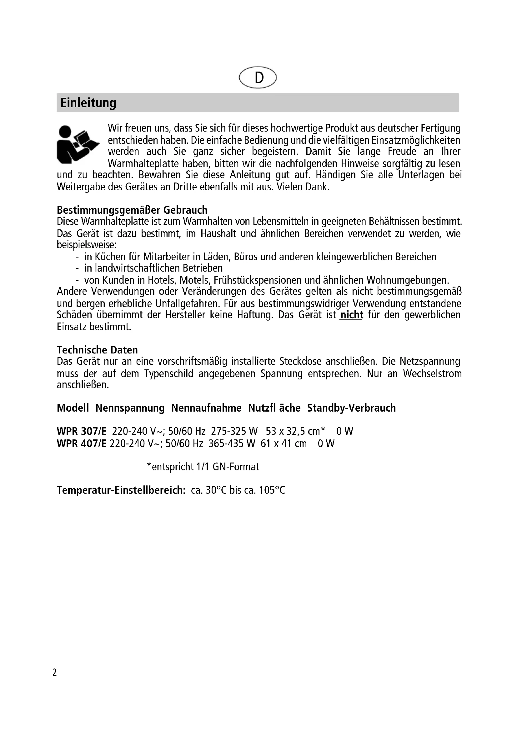 WPR 307/E WPR 407/E Warmhalteplatte Hot Tray Plaque accumulateur de chaleur D Bedienungsanleitung GB Instruction manual F Mode d‘emploi2 Wir freuen uns, dass Sie sich für dieses hochwertige Produkt aus deutscher Fertigung entschieden haben. Die einfache Bedienung und die vielfältigen Einsatzmöglichkeiten werden auch Sie ganz sicher begeistern. Damit Sie lange Freude an Ihrer Warmhalteplatte haben, bitten wir die nachfolgenden Hinweise sorgfältig zu lesen und zu beachten. Bewahren Sie diese Anleitung gut auf. Händigen Sie alle Unterlagen bei Weitergabe des Gerätes an Dritte ebenfalls mit aus. Vielen Dank. Bestimmungsgemäßer Gebrauch Diese Warmhalteplatte ist zum Warmhalten von Lebensmitteln in geeigneten Behältnissen bestimmt. Das Gerät ist dazu bestimmt, im Haushalt und ähnlichen Bereichen verwendet zu werden, wie beispielsweise: - in Küchen für Mitarbeiter in Läden, Büros und anderen kleingewerblichen Bereichen - in landwirtschaftlichen Betrieben - von Kunden in Hotels, Motels, Frühstückspensionen und ähnlichen Wohnumgebungen. Andere Verwendungen oder Veränderungen des Gerätes gelten als nicht bestimmungsgemäß und bergen erhebliche Unfallgefahren. Für aus bestimmungswidriger Verwendung entstandene Schäden übernimmt der Hersteller keine Haftung. Das Gerät ist nicht für den gewerblichen Einsatz bestimmt. Technische Daten Das Gerät nur an eine vorschriftsmäßig installierte Steckdose anschließen. Die Netzspannung muss der auf dem Typenschild angegebenen Spannung entsprechen. Nur an Wechselstrom anschließen. Modell Nennspannung Nennaufnahme Nutzfl äche Standby-Verbrauch WPR 307/E 220-240 V~; 50/60 Hz 275-325 W 53 x 32,5 cm* 0 W WPR 407/E 220-240 V~; 50/60 Hz 365-435 W 61 x 41 cm 0 W *entspricht 1/1 GN-Format Temperatur-Einstellbereich: ca. 30°C bis ca. 105°C Einleitung
