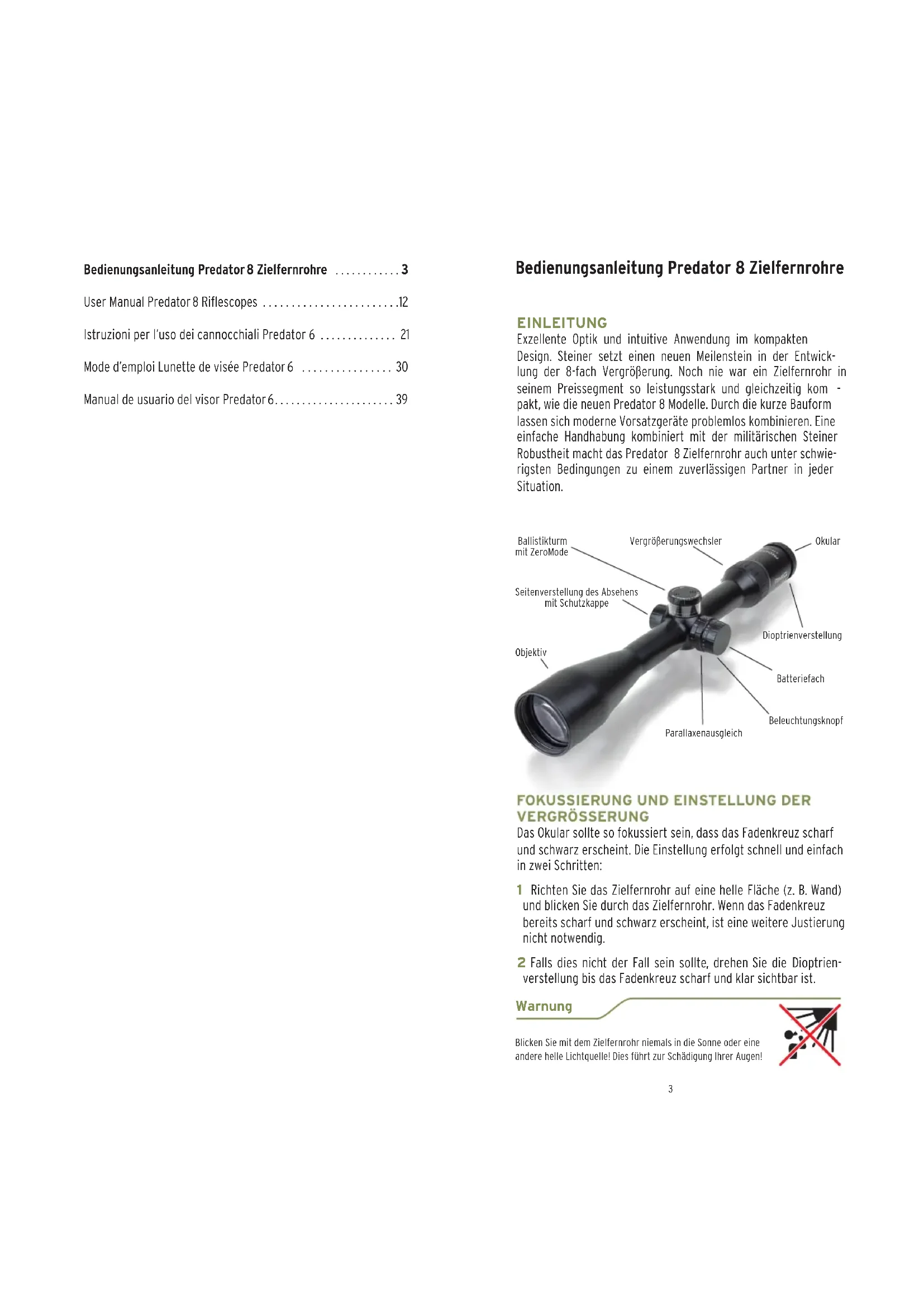 - VERGRÖSSERUNG Das Okular sollte so fokussiert sein, dass das Fadenkreuz scharf und schwarz erscheint. Die Einstellung erfolgt schnell und einfach in zwei Schritten: 1 Richten Sie das Zielfernrohr auf eine helle Fläche (z. B. Wand) und blicken Sie durch das Zielfernrohr. Wenn das Fadenkreuz bereits scharf und schwarz erscheint, ist eine weitere Justierung nicht notwendig. 2 Falls dies nicht der Fall sein sollte, drehen Sie die Dioptrien- verstellung bis das Fadenkreuz scharf und klar sichtbar ist. Warnung Bedienungsanleitung Predator 8 Zielfernrohre Blicken Sie mit dem Zielfernrohr niemals in die Sonne oder eine andere helle Lichtquelle! Dies führt zur Schädigung Ihrer Augen! Bedienungsanleitung Predator 8 Zielfernrohre p. 3