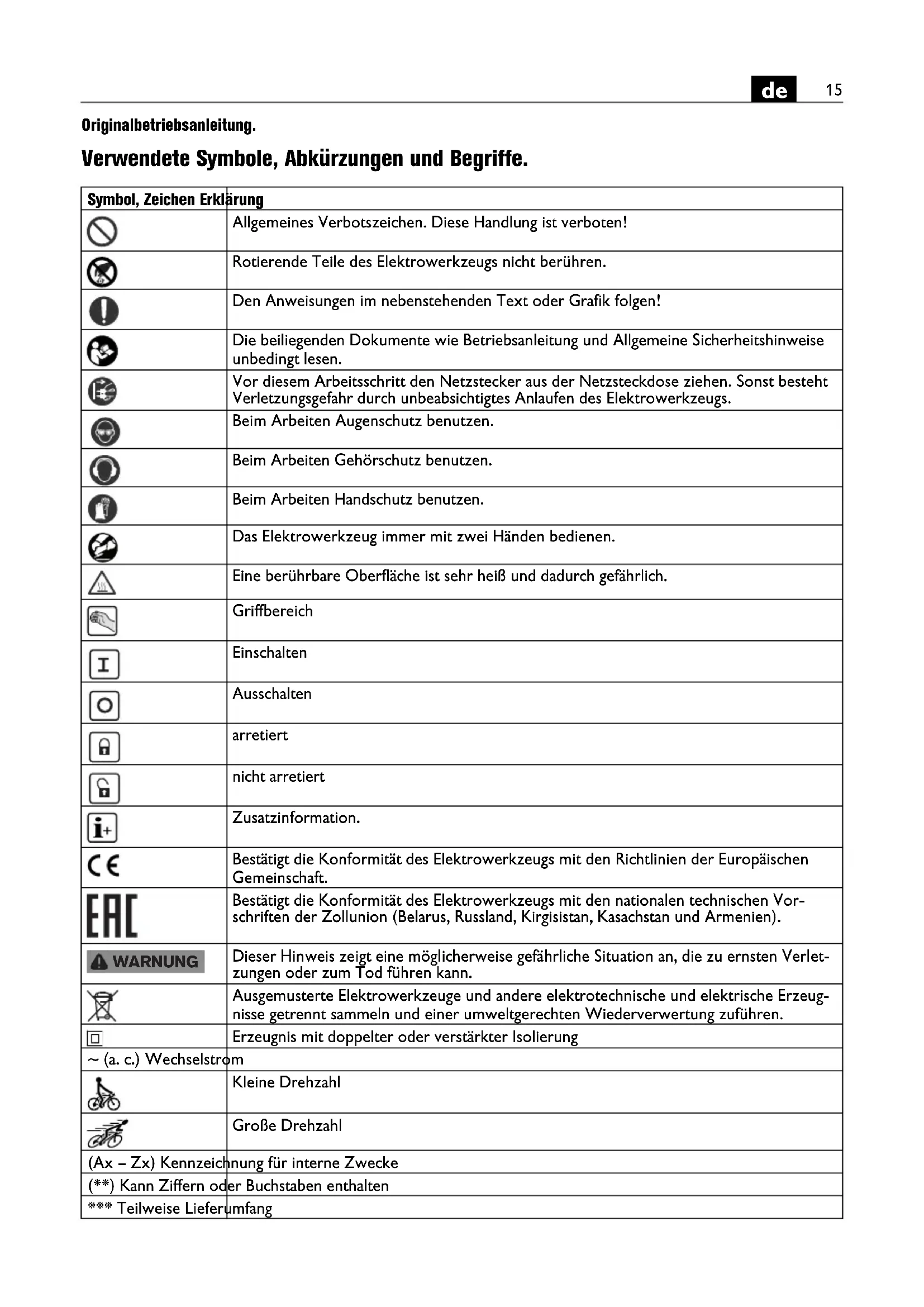 Originalbetriebsanleitung.Übersetzung der Originalbetriebsanleitung. Verwendete Symbole, Abkürzungen und Begriffe. Symbol, Zeichen Erklärung Allgemeines Verbotszeichen. Diese Handlung ist verboten! Rotierende Teile des Elektrowerkzeugs nicht berühren. Den Anweisungen im nebenstehenden Text oder Grafik folgen! Die beiliegenden Dokumente wie Betriebsanleitung und Allgemeine Sicherheitshinweise unbedingt lesen. Vor diesem Arbeitsschritt den Netzstecker aus der Netzsteckdose ziehen. Sonst besteht Verletzungsgefahr durch unbeabsichtigtes Anlaufen des Elektrowerkzeugs. Beim Arbeiten Augenschutz benutzen. Beim Arbeiten Gehörschutz benutzen. Beim Arbeiten Handschutz benutzen. Das Elektrowerkzeug immer mit zwei Händen bedienen. Eine berührbare Oberfläche ist sehr heiß und dadurch gefährlich. Griffbereich Einschalten Ausschalten arretiert nicht arretiert Zusatzinformation. Bestätigt die Konformität des Elektrowerkzeugs mit den Richtlinien der Europäischen Gemeinschaft. Bestätigt die Konformität des Elektrowerkzeugs mit den nationalen technischen Vor- schriften der Zollunion (Belarus, Russland, Kirgisistan, Kasachstan und Armenien). Dieser Hinweis zeigt eine möglicherweise gefährliche Situation an, die zu ernsten Verlet- zungen oder zum Tod führen kann. Ausgemusterte Elektrowerkzeuge und andere elektrotechnische und elektrische Erzeug- nisse getrennt sammeln und einer umweltgerechten Wiederverwertung zuführen. Erzeugnis mit doppelter oder verstärkter Isolierung ~ (a. c.) Wechselstrom Kleine Drehzahl Große Drehzahl (Ax – Zx) Kennzeichnung für interne Zwecke (**) Kann Ziffern oder Buchstaben enthalten *** Teilweise Lieferumfang WARNUNG16