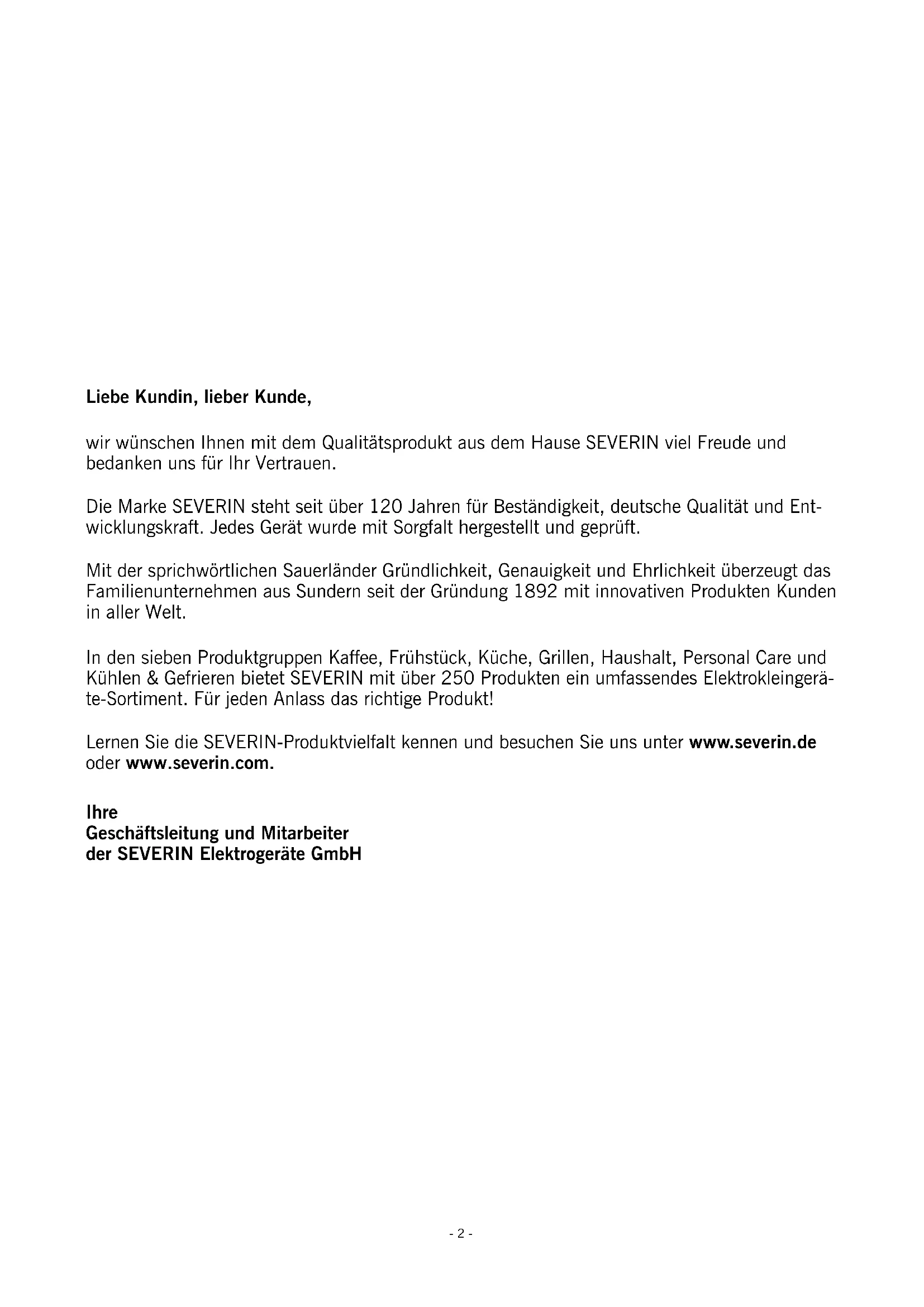 Liebe Kundin, lieber Kunde, wir wünschen Ihnen mit dem Qualitätsprodukt aus dem Hause SEVERIN viel Freude und bedanken uns für Ihr Vertrauen. Die Marke SEVERIN steht seit über 120 Jahren für Beständigkeit, deutsche Qualität und Ent- wicklungskraft. Jedes Gerät wurde mit Sorgfalt hergestellt und geprüft. Mit der sprichwörtlichen Sauerländer Gründlichkeit, Genauigkeit und Ehrlichkeit überzeugt das Familienunternehmen aus Sundern seit der Gründung 1892 mit innovativen Produkten Kunden in aller Welt. In den sieben Produktgruppen Kaffee, Frühstück, Küche, Grillen, Haushalt, Personal Care und Kühlen & Gefrieren bietet SEVERIN mit über 250 Produkten ein umfassendes Elektrokleingerä- te-Sortiment. Für jeden Anlass das richtige Produkt! Lernen Sie die SEVERIN-Produktvielfalt kennen und besuchen Sie uns unter www.severin.de oder www.severin.com. Ihre Geschäftsleitung und Mitarbeiter der SEVERIN Elektrogeräte GmbH- 3 - Lesen Sie die Gebrauchsan- weisung vor der Benutzung des Gerätes sorgfältig und ganz durch. Bewahren Sie sie für den weiteren Gebrauch auf. Das Gerät darf nur von Perso- nen benutzt werden, die mit den Sicherheitsanweisungen vertraut sind. Wenn Sie das Ge- rät weitergeben, fügen Sie auch diese Anleitung mit bei. Bestimmungsgemäßer Gebrauch