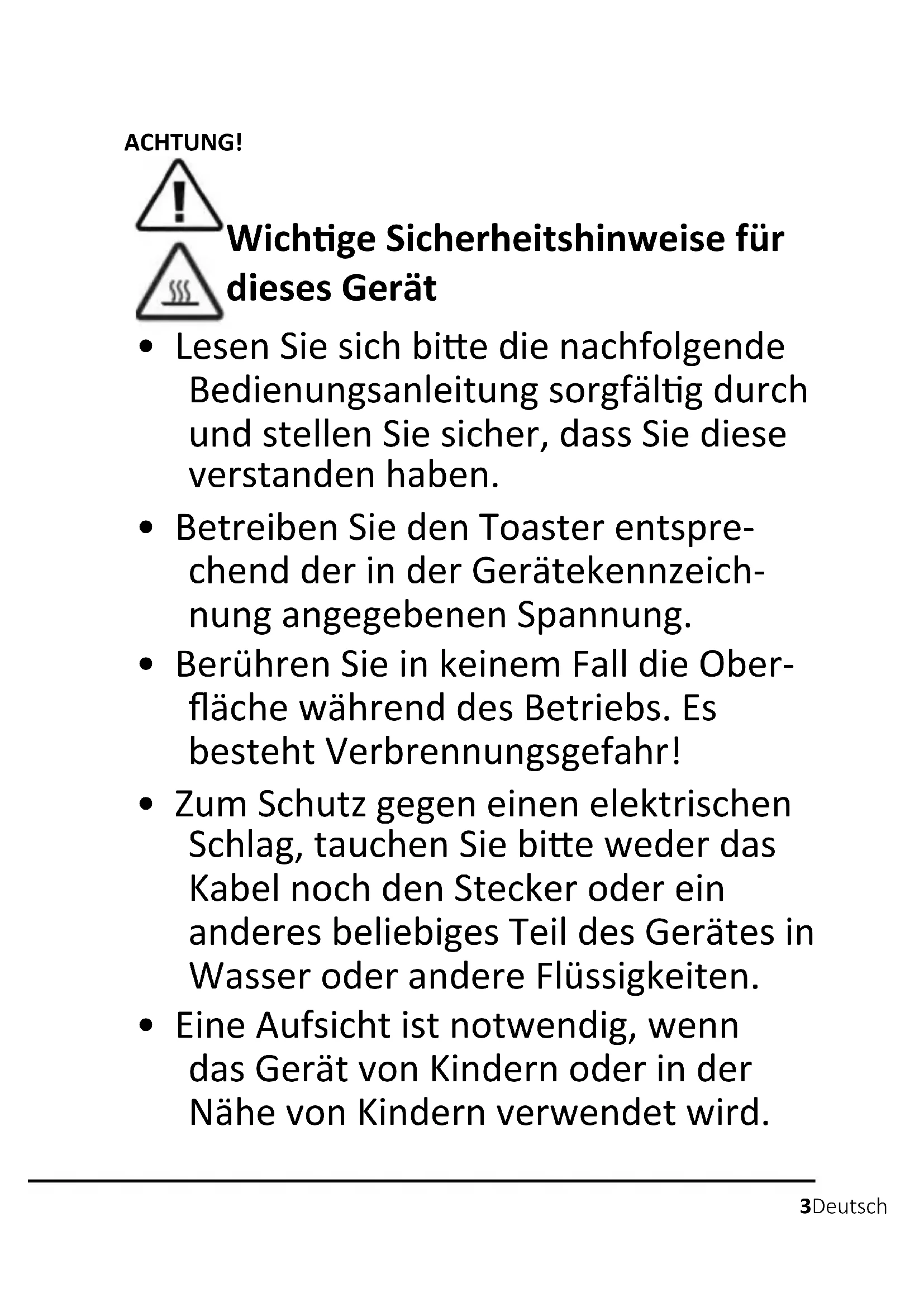 - Das Einführen anderer Materialien wie z.B. Metallfolien oder anderen Utensilien ist strengstens verboten, da dies zu Bränden oder Stromschlä- gen führen kann. Verwenden Sie das Gerät nur zum Bräunen von Toast- brot und Brot oder zum Aufwärmen von Brötchen.