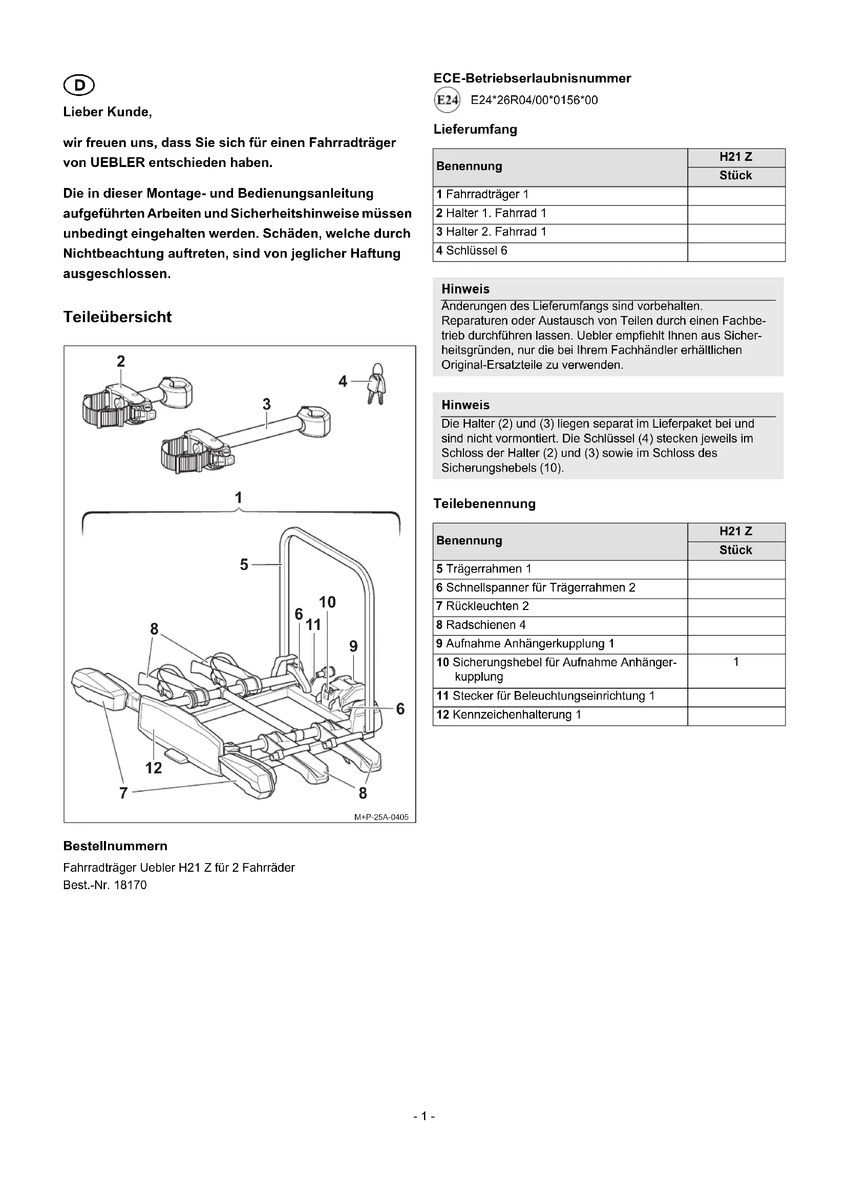 Lieber Kunde, wir freuen uns, dass Sie sich für einen Fahrradträger von UEBLER entschieden haben. Die in dieser Montage- und Bedienungsanleitung aufgeführten Arbeiten und Sicherheitshinweise müssen unbedingt eingehalten werden. Schäden, welche durch Nichtbeachtung auftreten, sind von jeglicher Haftung ausgeschlossen. Teileübersicht Bestellnummern Fahrradträger Uebler H21 Z für 2 Fahrräder Best.-Nr. 18170 ECE-Betriebserlaubnisnummer E24*26R04/00*0156*00 Lieferumfang Teilebenennung
