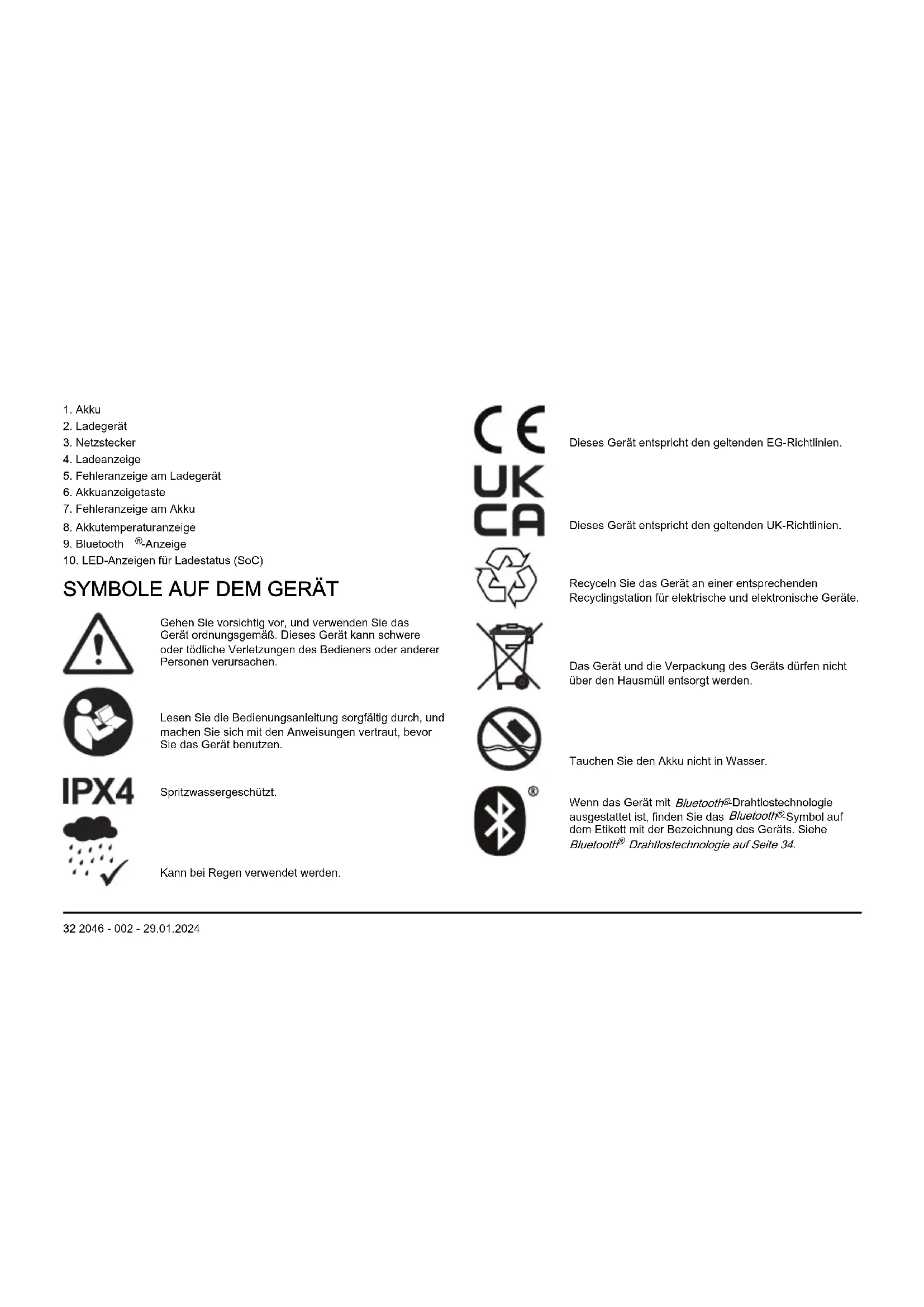 Gehen Sie vorsichtig vor, und verwenden Sie das Gerät ordnungsgemäß. Dieses Gerät kann schwere oder tödliche Verletzungen des Bedieners oder anderer Personen verursachen. Lesen Sie die Bedienungsanleitung sorgfältig durch, und machen Sie sich mit den Anweisungen vertraut, bevor Sie das Gerät benutzen. Spritzwassergeschützt. Kann bei Regen verwendet werden. Dieses Gerät entspricht den geltenden EG-Richtlinien. Dieses Gerät entspricht den geltenden UK-Richtlinien. Recyceln Sie das Gerät an einer entsprechenden Recyclingstation für elektrische und elektronische Geräte. Das Gerät und die Verpackung des Geräts dürfen nicht über den Hausmüll entsorgt werden. Tauchen Sie den Akku nicht in Wasser. Wenn das Gerät mit Bluetooth