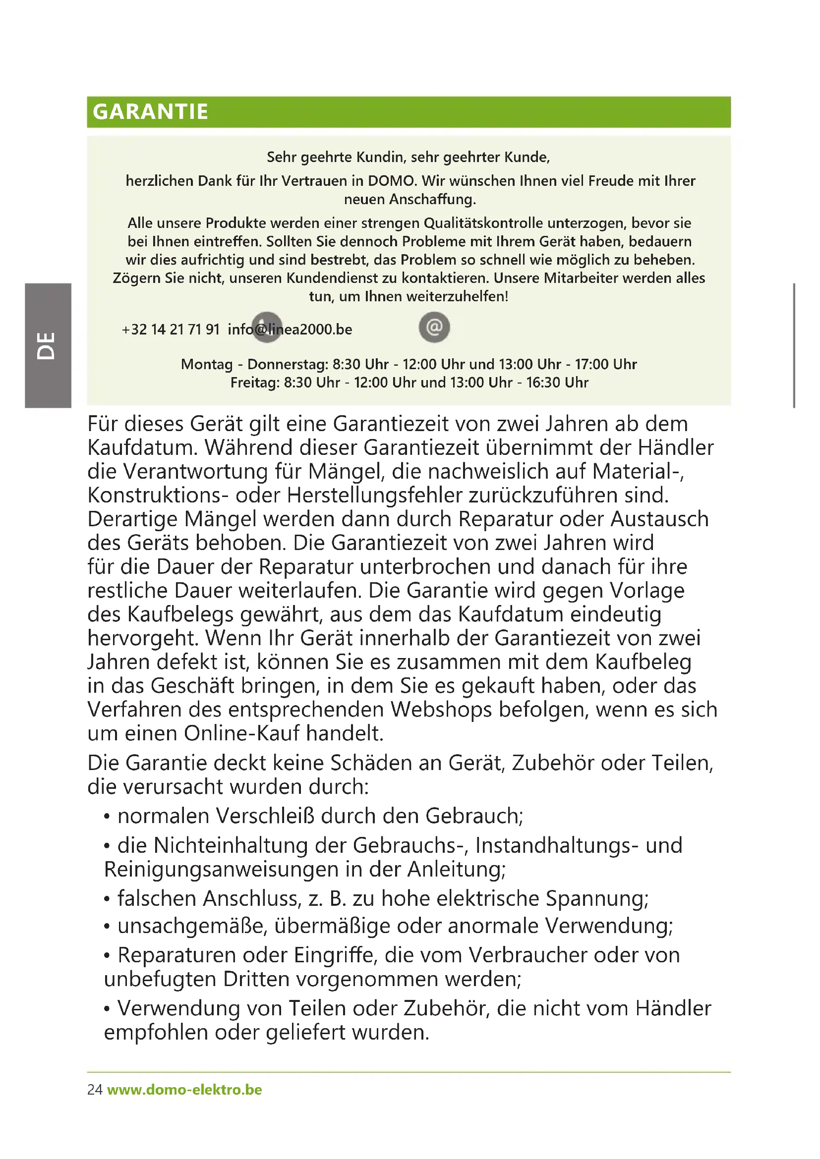 GARANTIE Sehr geehrte Kundin, sehr geehrter Kunde, herzlichen Dank für Ihr Vertrauen in DOMO. Wir wünschen Ihnen viel Freude mit Ihrer neuen Anschaung. Alle unsere Produkte werden einer strengen Qualitätskontrolle unterzogen, bevor sie bei Ihnen eintreen. Sollten Sie dennoch Probleme mit Ihrem Gerät haben, bedauern wir dies aufrichtig und sind bestrebt, das Problem so schnell wie möglich zu beheben. Zögern Sie nicht, unseren Kundendienst zu kontaktieren. Unsere Mitarbeiter werden alles tun, um Ihnen weiterzuhelfen! +32 14 21 71 91 info@linea2000.be Montag - Donnerstag: 8:30 Uhr - 12:00 Uhr und 13:00 Uhr - 17:00 Uhr Freitag: 8:30 Uhr - 12:00 Uhr und 13:00 Uhr - 16:30 Uhr Für dieses Gerät gilt eine Garantiezeit von zwei Jahren ab dem Kaufdatum. Während dieser Garantiezeit übernimmt der Händler die Verantwortung für Mängel, die nachweislich auf Material-, Konstruktions- oder Herstellungsfehler zurückzuführen sind. Derartige Mängel werden dann durch Reparatur oder Austausch des Geräts behoben. Die Garantiezeit von zwei Jahren wird für die Dauer der Reparatur unterbrochen und danach für ihre restliche Dauer weiterlaufen. Die Garantie wird gegen Vorlage des Kaufbelegs gewährt, aus dem das Kaufdatum eindeutig hervorgeht. Wenn Ihr Gerät innerhalb der Garantiezeit von zwei Jahren defekt ist, können Sie es zusammen mit dem Kaufbeleg in das Geschäft bringen, in dem Sie es gekauft haben, oder das Verfahren des entsprechenden Webshops befolgen, wenn es sich um einen Online-Kauf handelt. Die Garantie deckt keine Schäden an Gerät, Zubehör oder Teilen, die verursacht wurden durch: