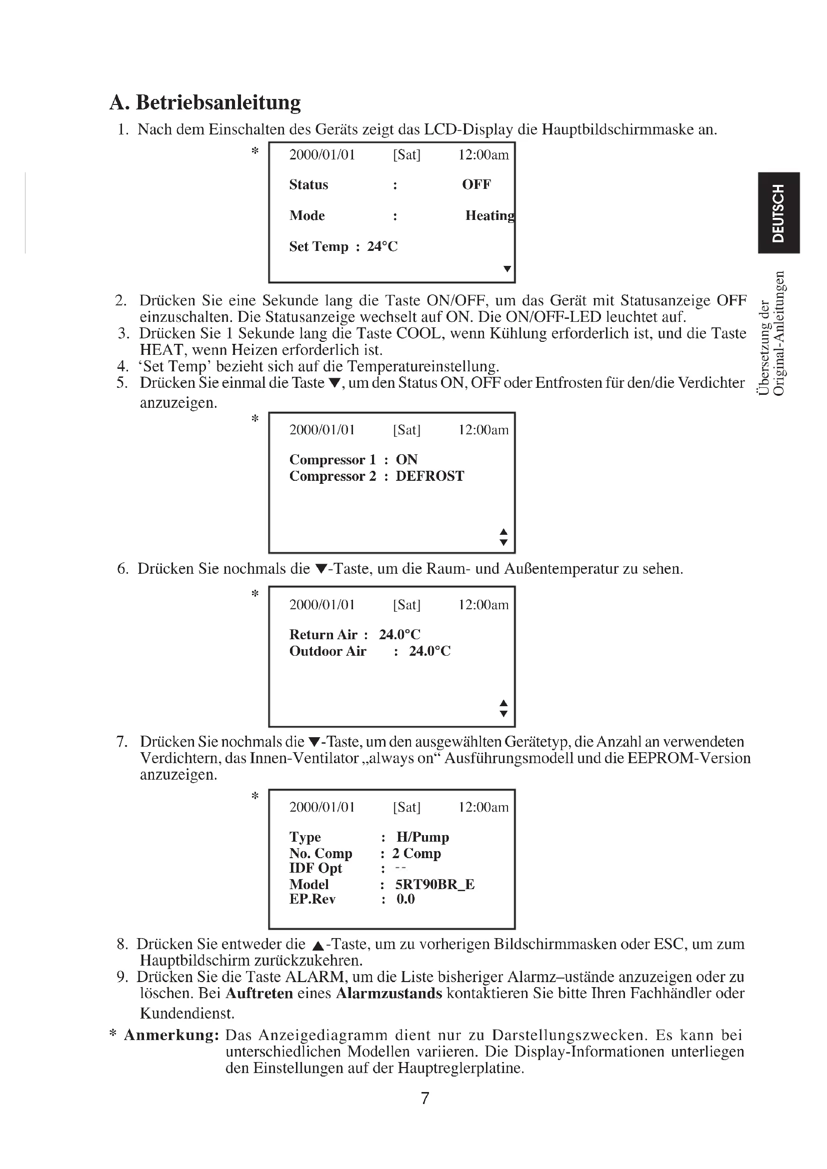 Verdichtern, das Innen-Ventilator „always on“ Ausführungsmodell und die EEPROM-Version anzuzeigen. 2000/01/01 [Sat] 12:00am Type : H/Pump No. Comp : 2 Comp IDF Opt : Model : 5RT90BR_E EP.Rev : 0.0
