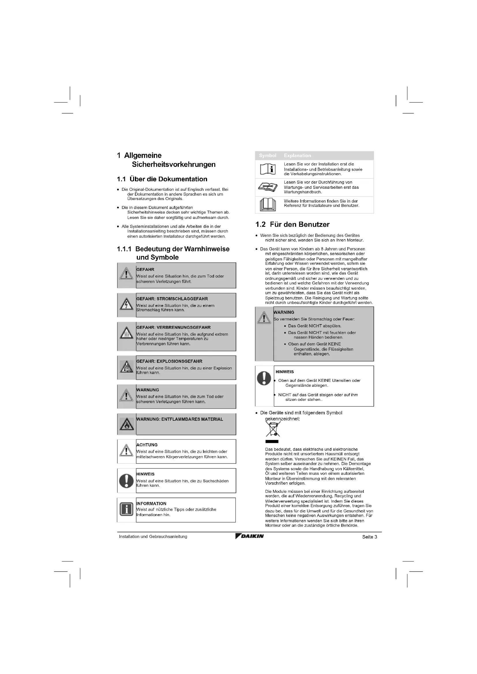 x Die Original-Dokumentation ist auf Englisch verfasst. Bei der Dokumentation in andere Sprachen es sich um Übersetzungen des Originals. x Die in diesem Dokument aufgeführten Sicherheitshinweise decken sehr wichtige Themen ab. Lesen Sie sie daher sorgfältig und aufmerksam durch. x Alle Systeminstallationen und alle Arbeiten die in der Installationsanleiting beschrieben sind, müssen durch einen autorisierten Installateur durchgeführt werden.