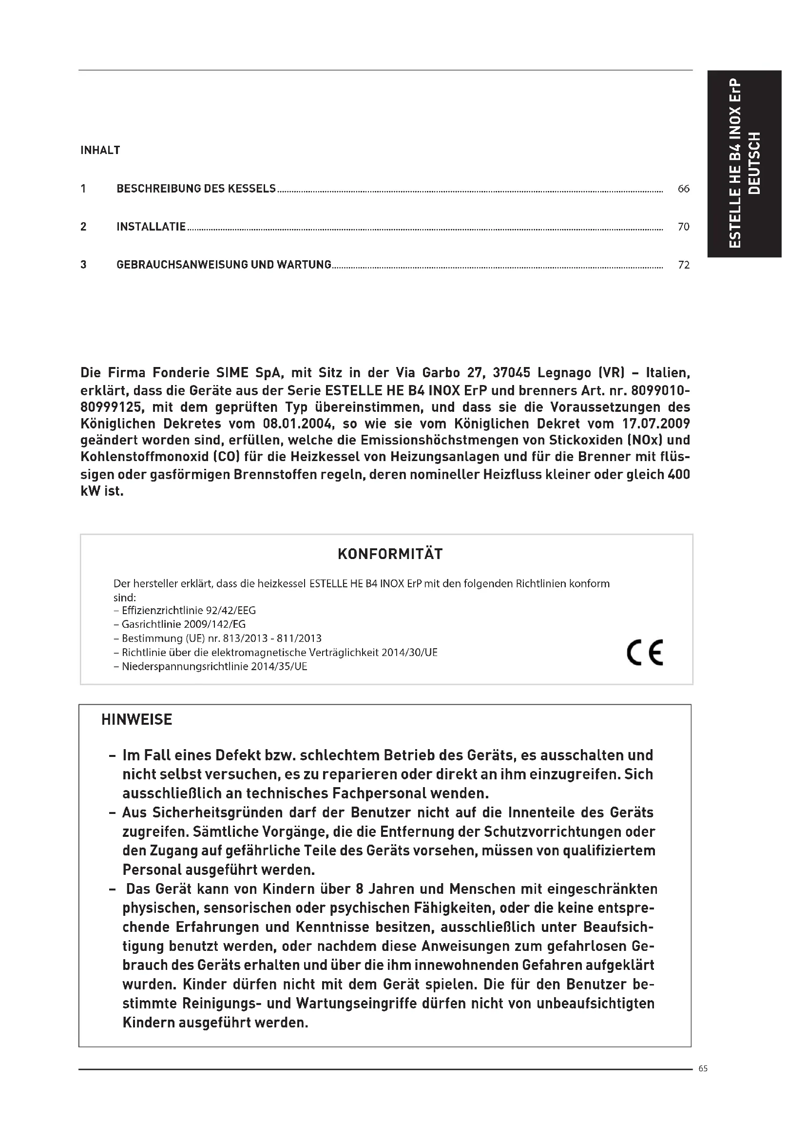 Im Fall eines Defekt bzw. schlechtem Betrieb des Geräts, es ausschalten und nicht selbst versuchen, es zu reparieren oder direkt an ihm einzugreifen. Sich ausschließlich an technisches Fachpersonal wenden. – Aus Sicherheitsgründen darf der Benutzer nicht auf die Innenteile des Geräts zugreifen. Sämtliche Vorgänge, die die Entfernung der Schutzvorrichtungen oder den Zugang auf gefährliche Teile des Geräts vorsehen, müssen von qualifiziertem Personal ausgeführt werden. – Das Gerät kann von Kindern über 8 Jahren und Menschen mit eingeschränkten physischen, sensorischen oder psychischen Fähigkeiten, oder die keine entspre- chende Erfahrungen und Kenntnisse besitzen, ausschließlich unter Beaufsich- tigung benutzt werden, oder nachdem diese Anweisungen zum gefahrlosen Ge- brauch des Geräts erhalten und über die ihm innewohnenden Gefahren aufgeklärt wurden. Kinder dürfen nicht mit dem Gerät spielen. Die für den Benutzer be- stimmte Reinigungs- und Wartungseingriffe dürfen nicht von unbeaufsichtigten Kindern ausgeführt werden. KONFORMITÄT Der hersteller erklärt, dass die heizkessel ESTELLE HE B4 INOX ErP mit den folgenden Richtlinien konform sind: – Effizienzrichtlinie 92/42/EEG – Gasrichtlinie 2009/142/EG – Bestimmung (UE) nr. 813/2013 - 811/2013 – Richtlinie über die elektromagnetische Verträglichkeit 2014/30/UE – Niederspannungsrichtlinie 2014/35/UE Die Firma Fonderie SIME SpA, mit Sitz in der Via Garbo 27, 37045 Legnago (VR) – Italien, erklärt, dass die Geräte aus der Serie ESTELLE HE B4 INOX ErP und brenners Art. nr. 8099010- 80999125, mit dem geprüften Typ übereinstimmen, und dass sie die Voraussetzungen des Königlichen Dekretes vom 08.01.2004, so wie sie vom Königlichen Dekret vom 17.07.2009 geändert worden sind, erfüllen, welche die Emissionshöchstmengen von Stickoxiden (NOx) und Kohlenstoffmonoxid (CO) für die Heizkessel von Heizungsanlagen und für die Brenner mit flüs- sigen oder gasförmigen Brennstoffen regeln, deren nomineller Heizfluss kleiner oder gleich 400 kW ist.66