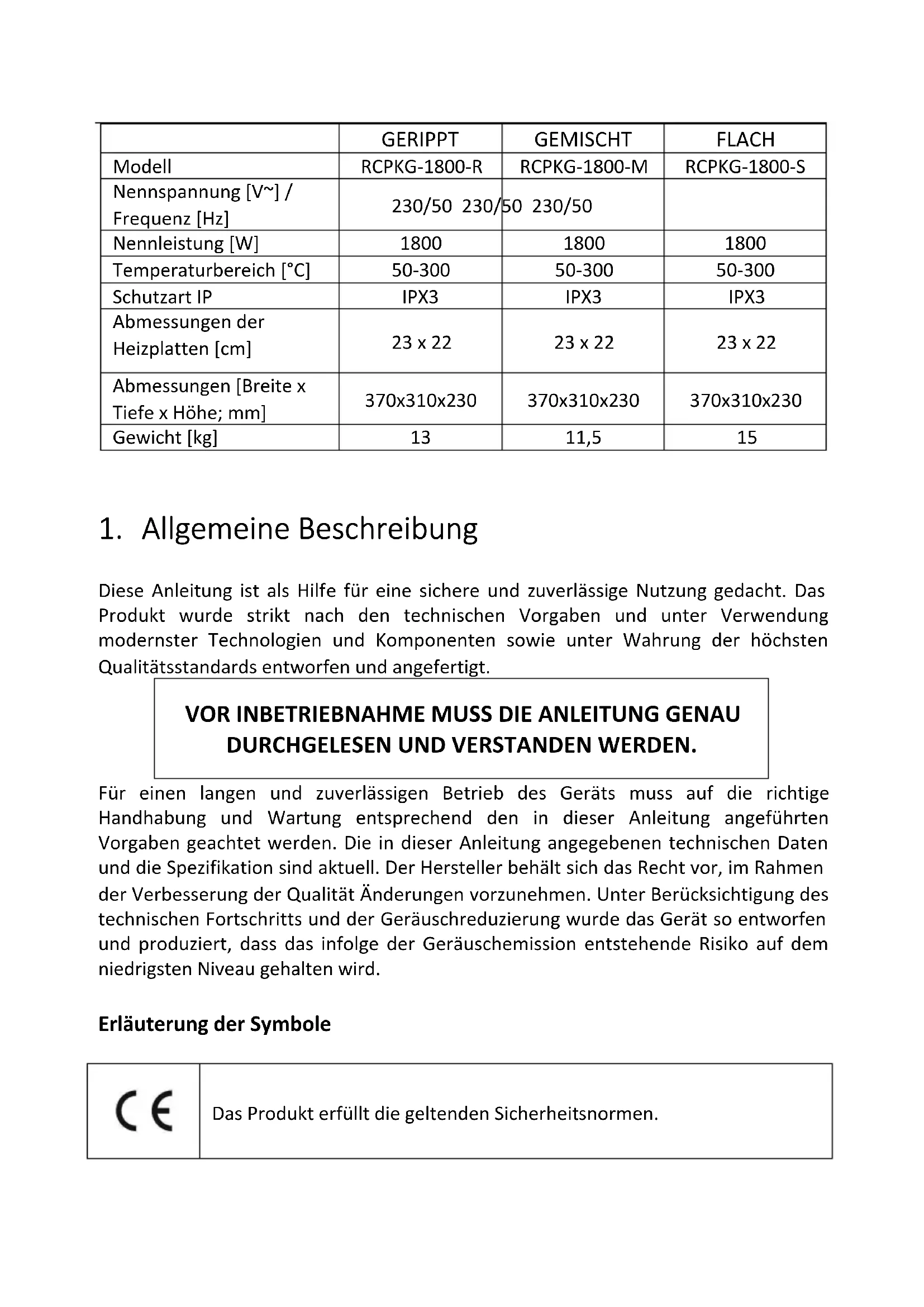 3.4. Reinigung und Wartung a) Vor jeder Reinigung und Einstellung, dem Austausch von Zubehör oder wenn das Gerät nicht benutzt wird, muss der Netzstecker gezogen werden und das Gerät vollständig abkühlen. b) Reinigen Sie das Gerät nach Gebrauch mit einem weichen Tuch und ggf. einem milden Reinigungsmittel zur Reinigung von Oberflächen, die mit Lebensmitteln in Berührung kommen. c) Mit einer Drahtbürste können Sie eventuelle Speisereste, die auf dem Kochfeld haften, entfernen. d) Nach jedem Gebrauch des Gerätes leeren und spülen Sie die Fettschale mit Spülmittel aus. e) Lassen Sie nach jeder Reinigung alle Teile gut trocknen, bevor das Gerät erneut verwendet wird. f) Bewahren Sie das Gerät an einem trockenen, kühlen, vor Feuchtigkeit und direkter Sonneneinstrahlung geschütztem Ort auf. g) Es ist verboten, das Gerät mit einem Wasserstrahl zu besprühen oder in Wasser zu tauchen.h) In Hinblick auf technische Effizienz und zur Vorbeugung vor Schäden sollte das Gerät regelmäßig überprüft werden.Technical data Parameter description Parameter value Product name CONTACT GRIDDLE RIBED CONTACT GRIDDLE MIXED CONTACT GRIDDLE FLAT Model RCPKG-3600-R RCPKG-3600-M RCPKG-3600-S Rated voltage [V~] / Frequency [Hz] 230/50 230/50 230/50 Rated power [W]