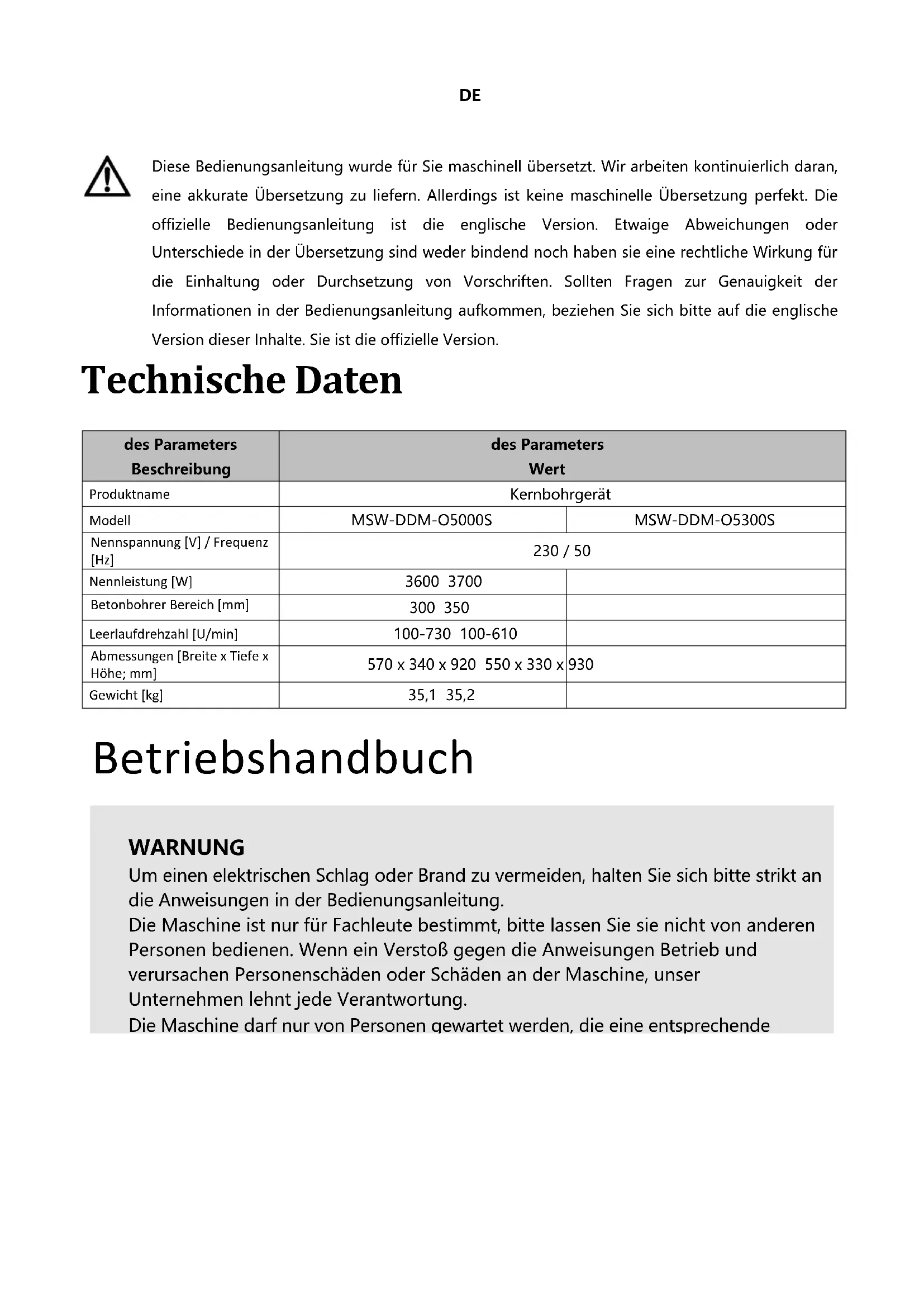 Nennspannung [V] / Frequenz [Hz] 230 / 50 Nennleistung [W] 3600 3700 Betonbohrer Bereich [mm] 300 350 Leerlaufdrehzahl [U/min] 100-730 100-610 Abmessungen [Breite x Tiefe x Höhe; mm] 570 x 340 x 920 550 x 330 x 930 Gewicht [kg] 35,1 35,2 BetriebshandbuchDE
