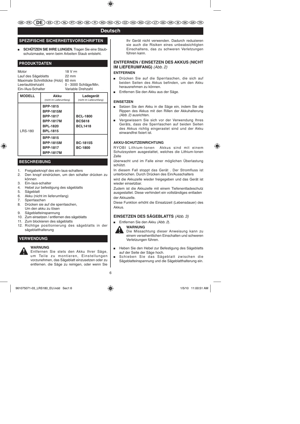 LRS180 - Elektrowerkzeuge RYOBI - Kostenlose Bedienungsanleitung